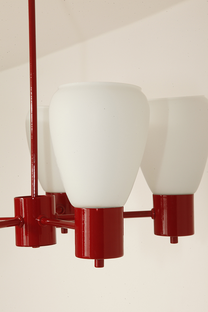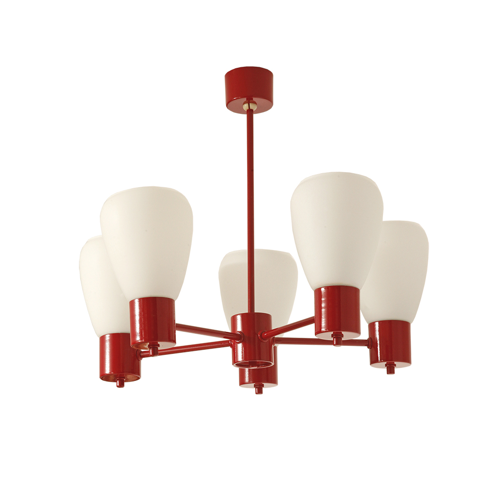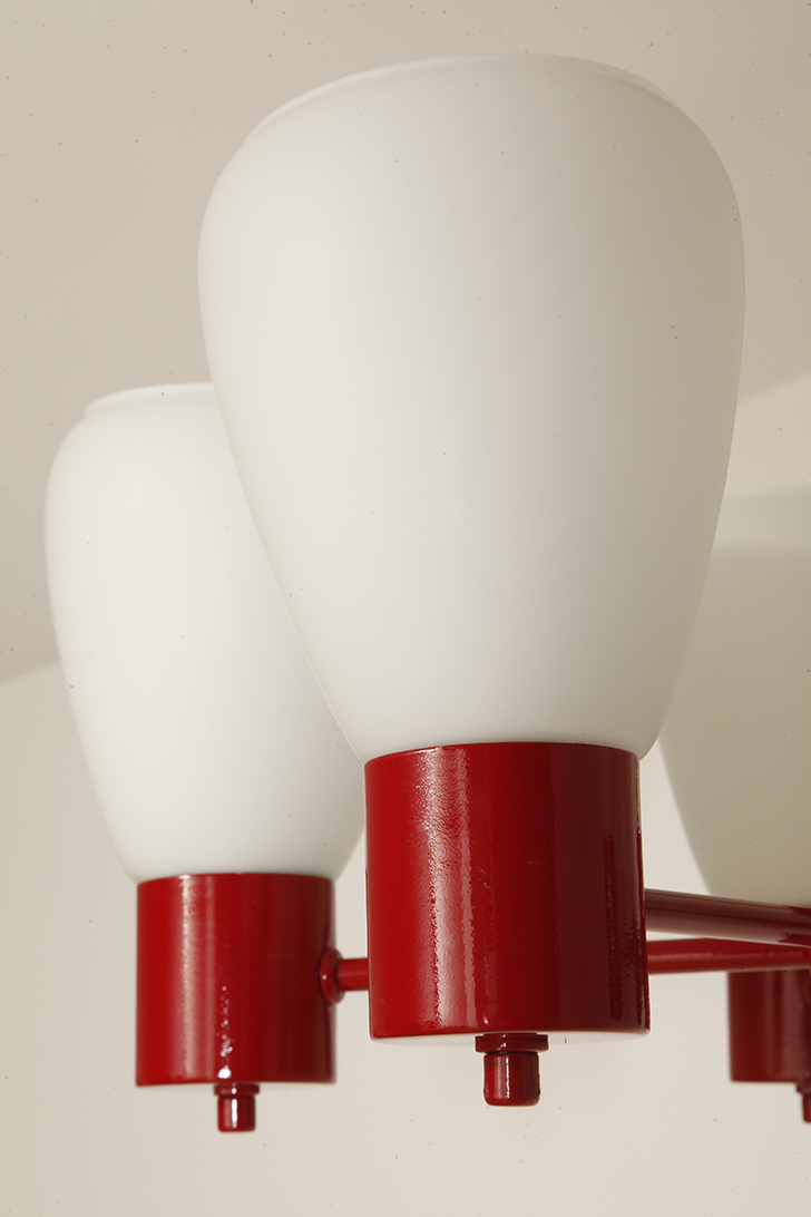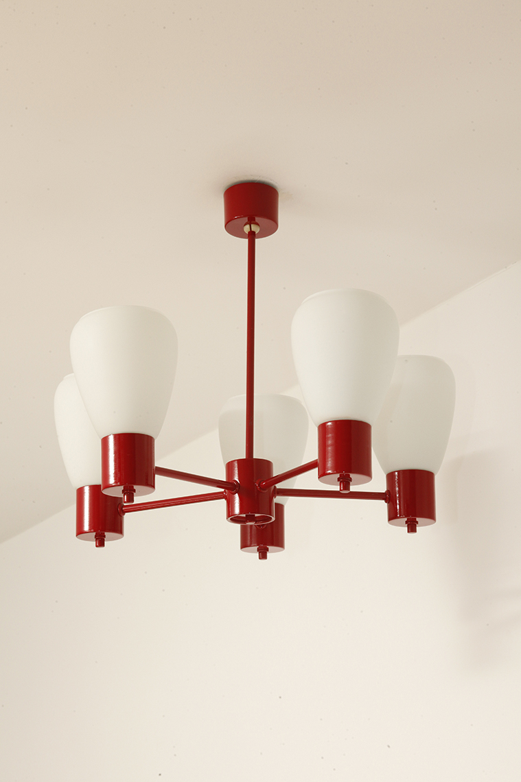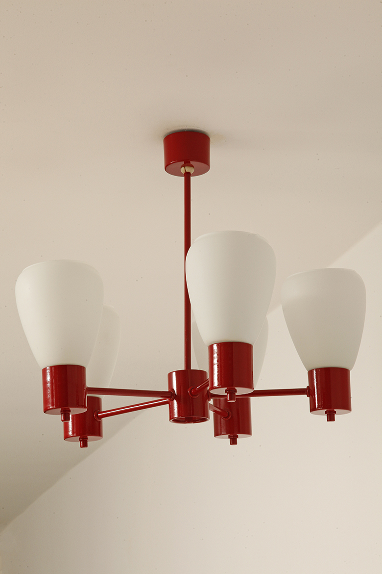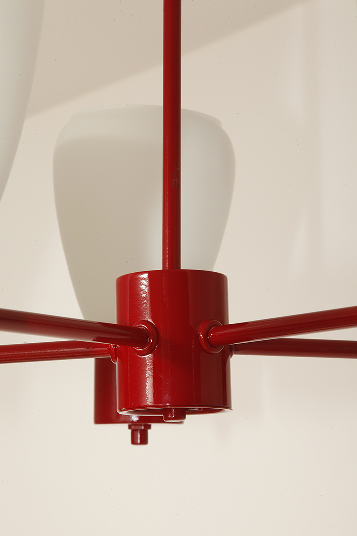 Pięciopunktowa czerwona metalowa lampa sufitowa/żyrandol ze szklanymi mlecznobiałymi kloszami, Niemcy, lata 60/70.