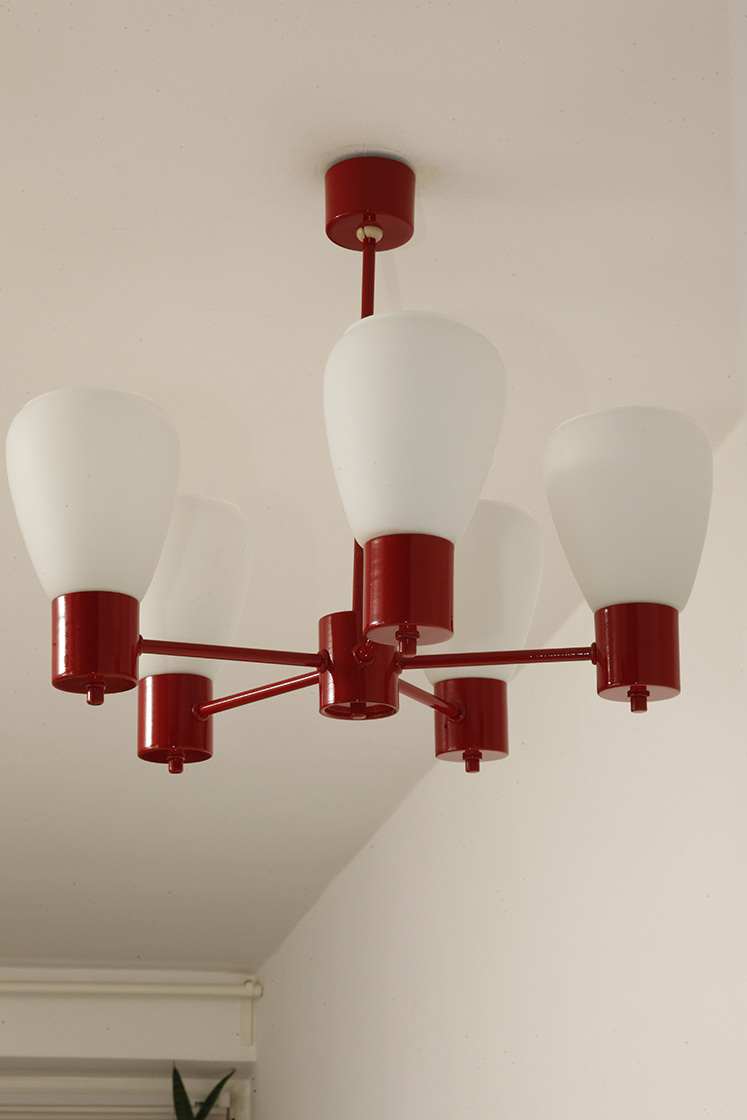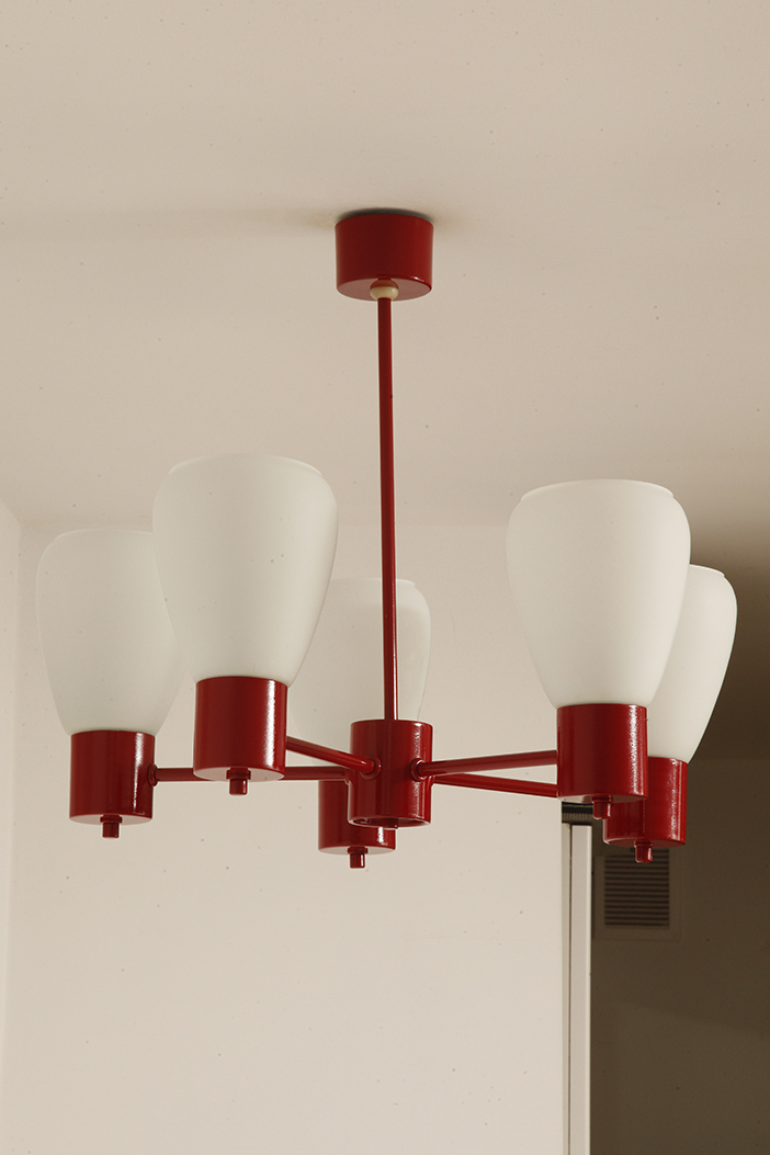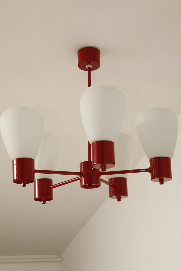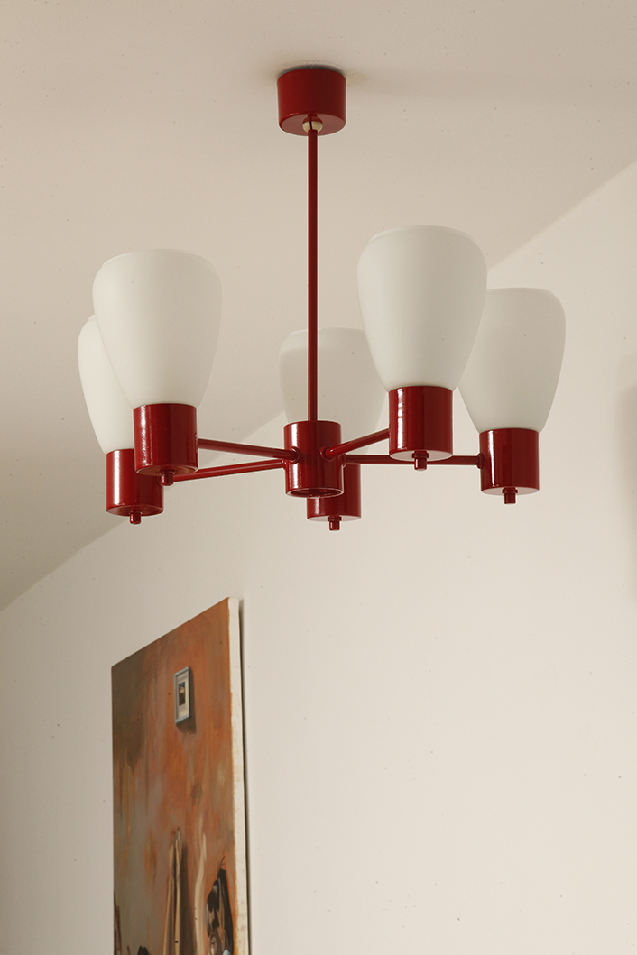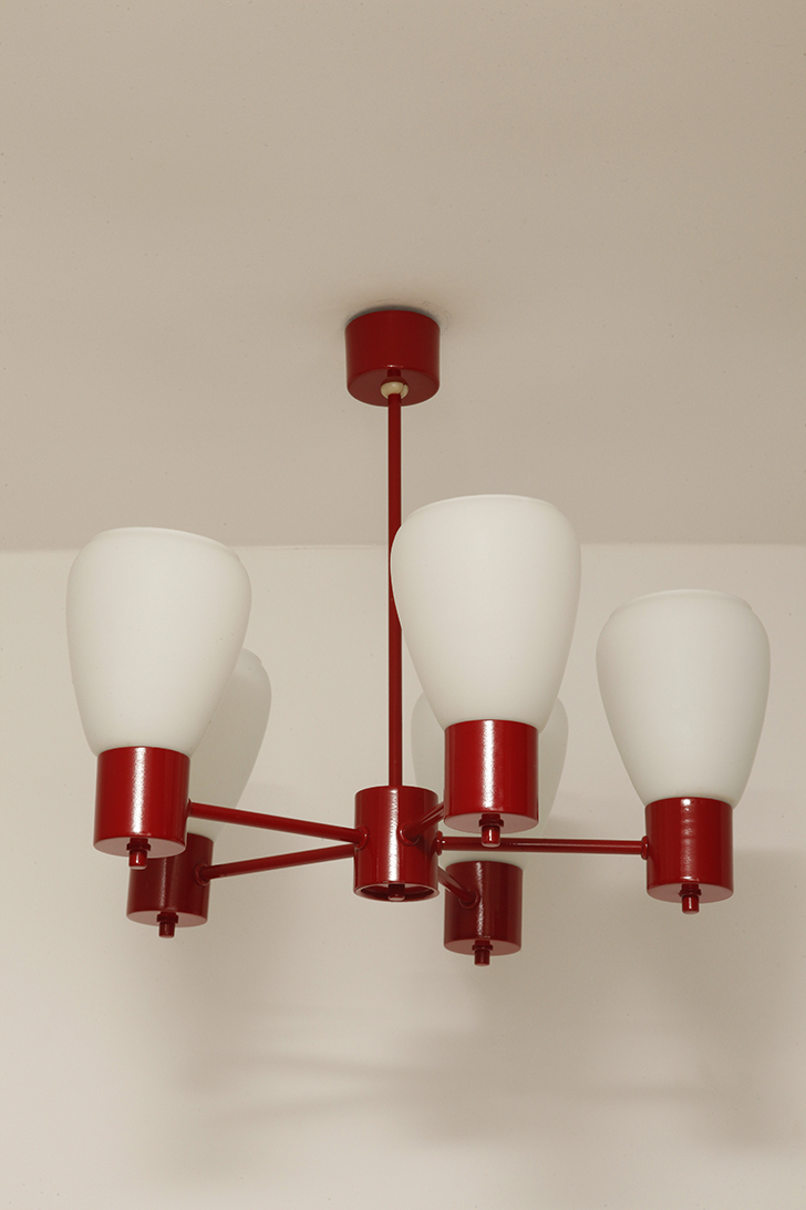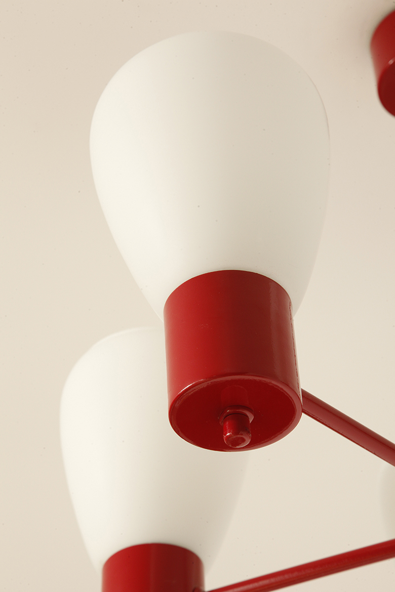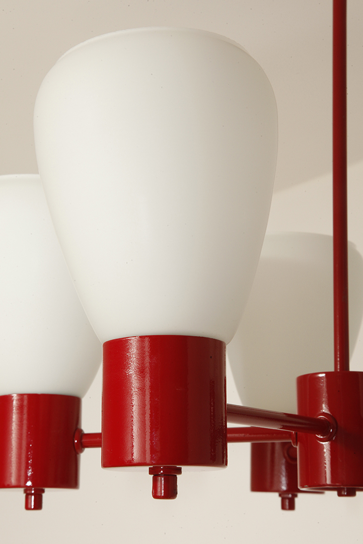 Pięciopunktowa czerwona metalowa lampa sufitowa/żyrandol ze szklanymi mlecznobiałymi kloszami, Niemcy, lata 60/70.