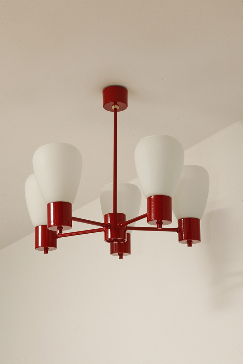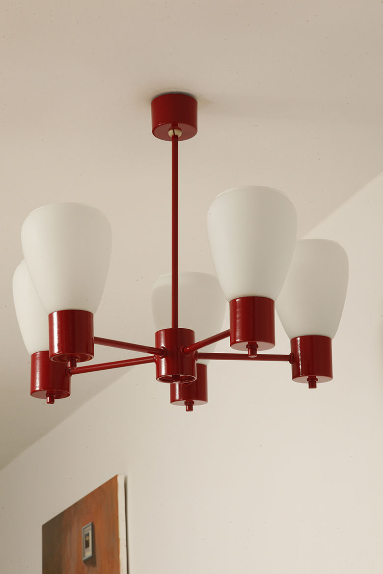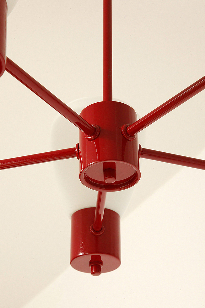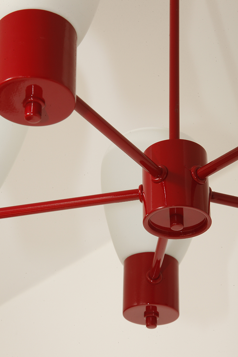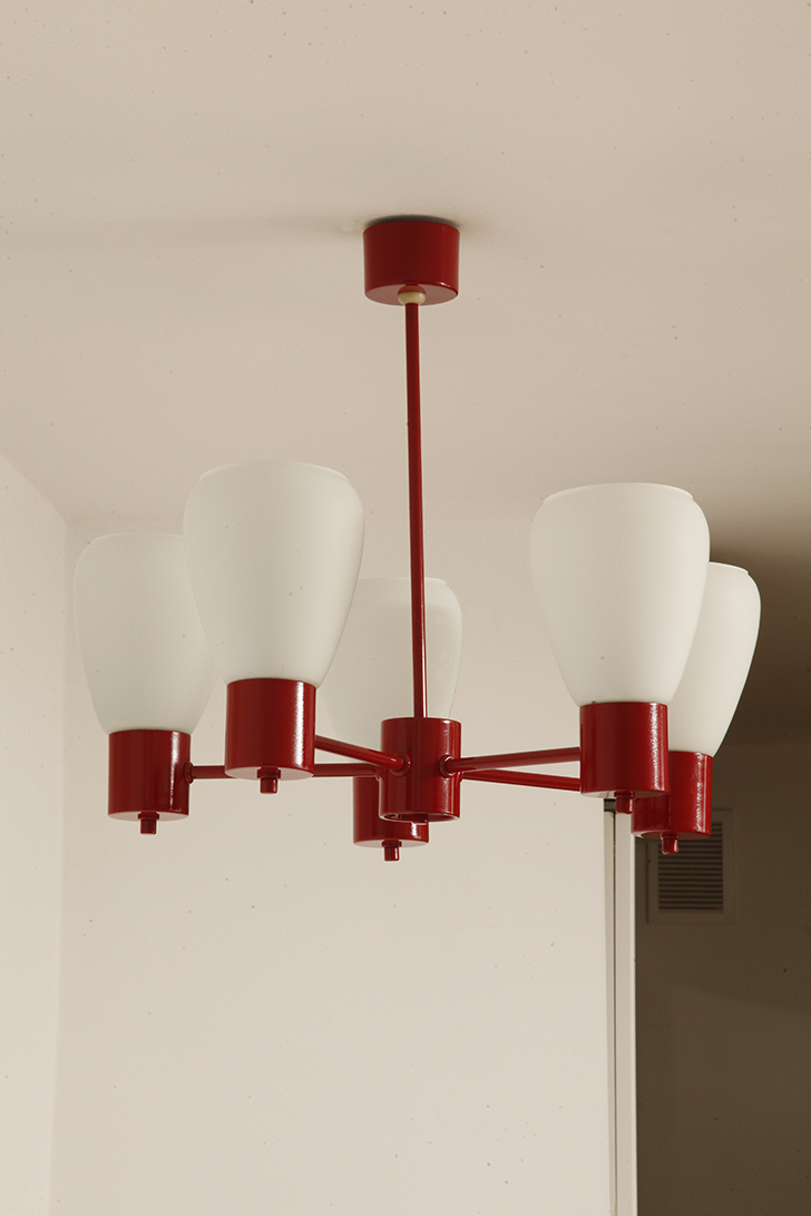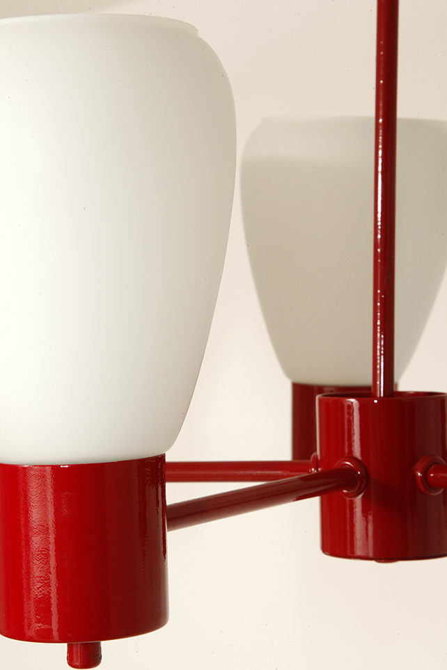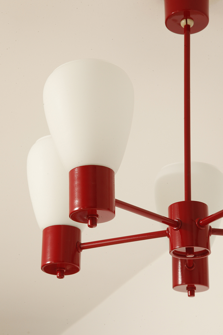Pięciopunktowa czerwona metalowa lampa sufitowa/żyrandol ze szklanymi mlecznobiałymi kloszami, Niemcy, lata 60/70.