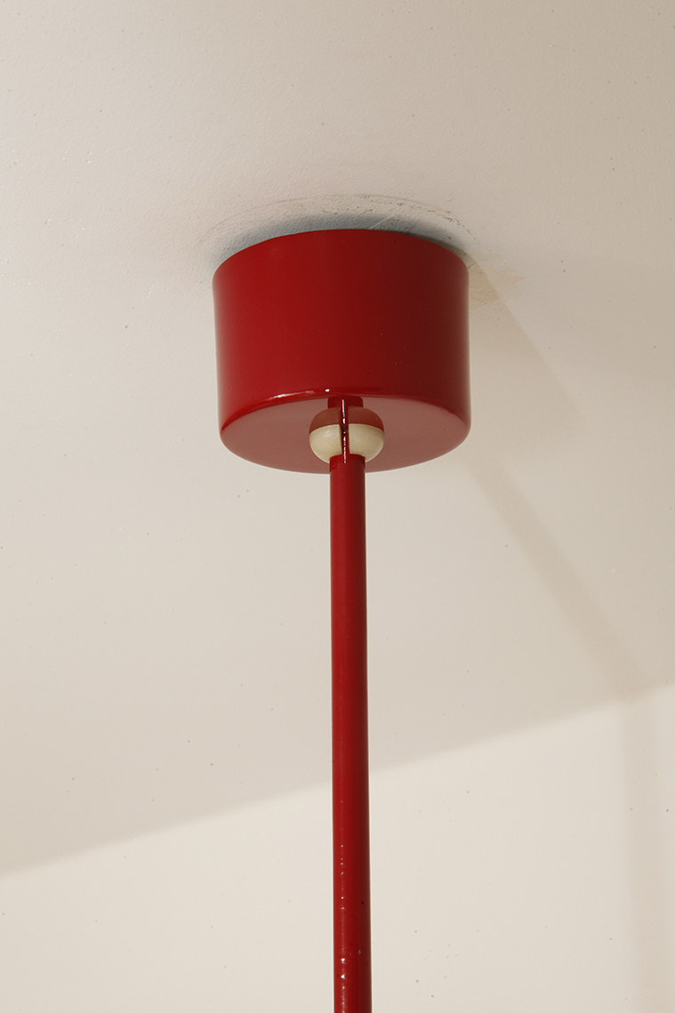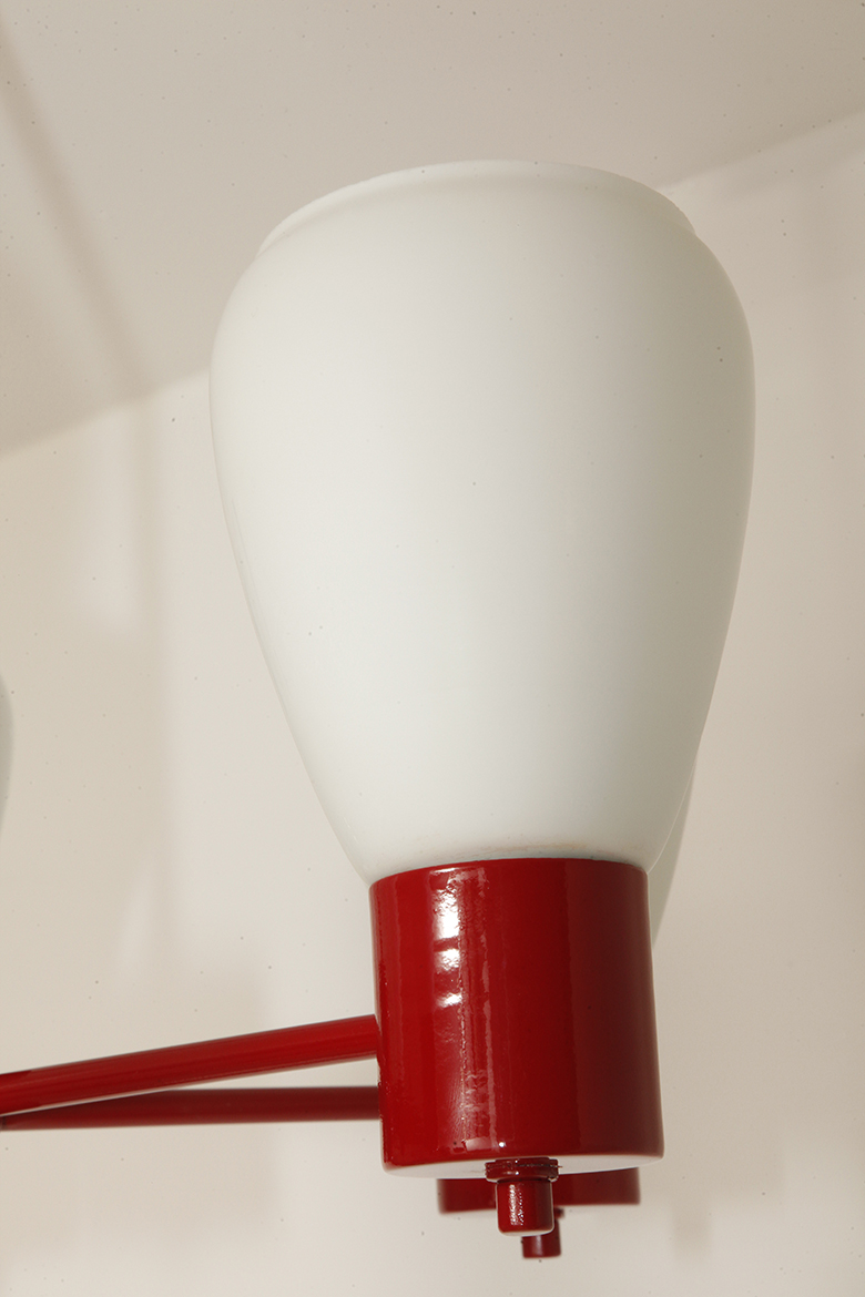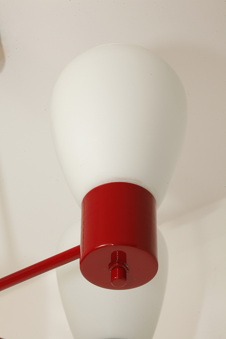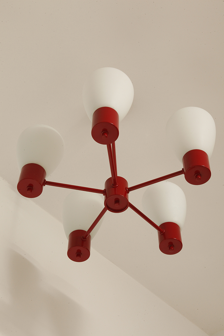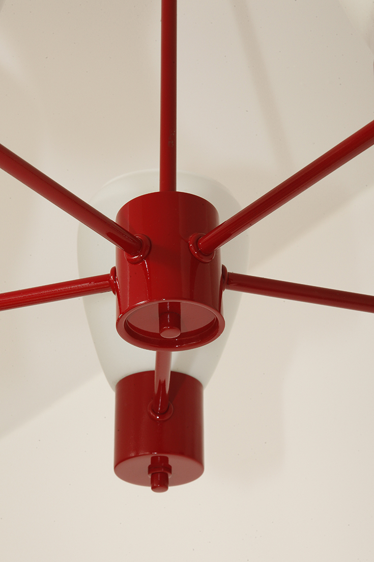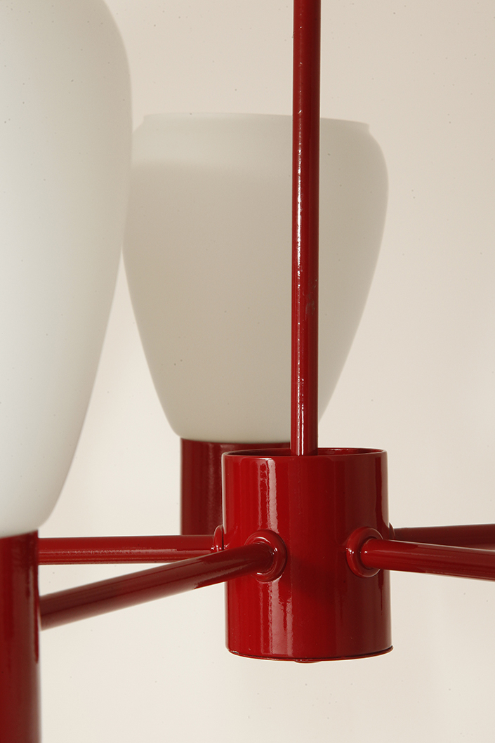 Pięciopunktowa czerwona metalowa lampa sufitowa/żyrandol ze szklanymi mlecznobiałymi kloszami, Niemcy, lata 60/70.