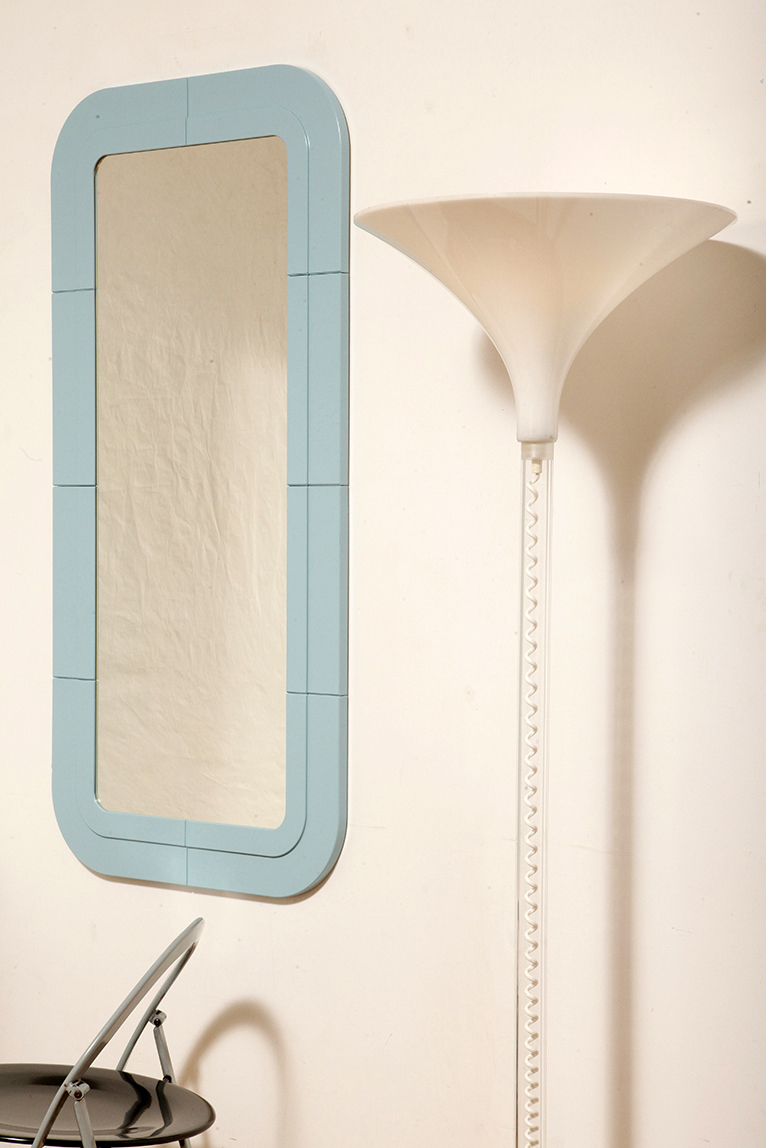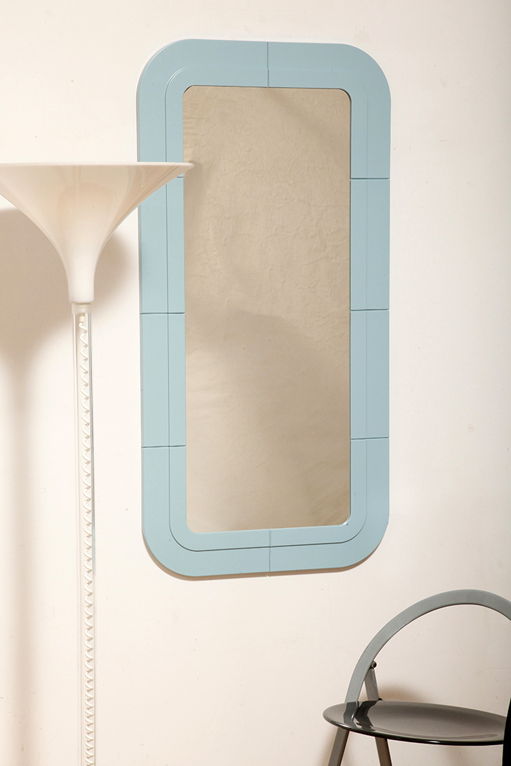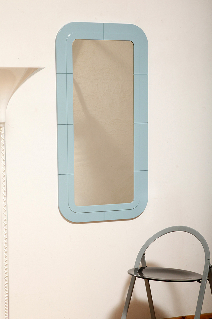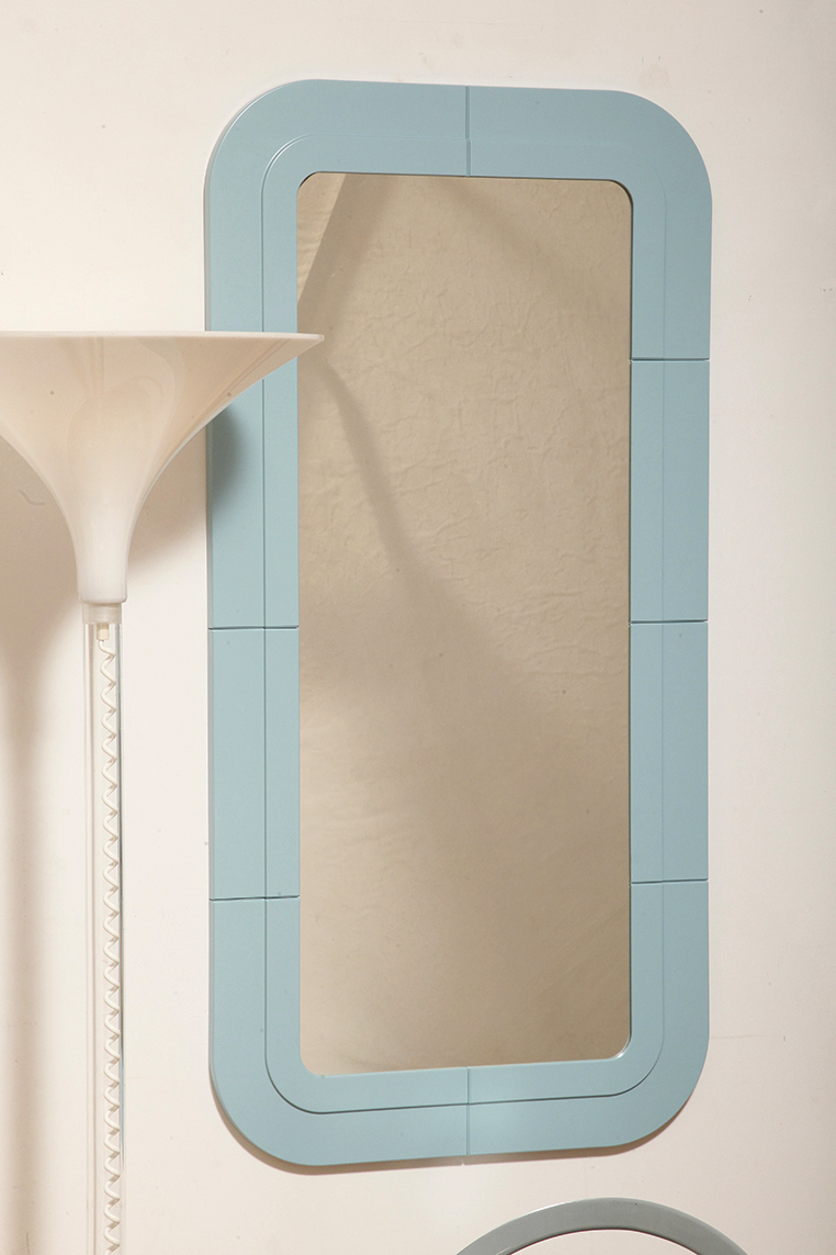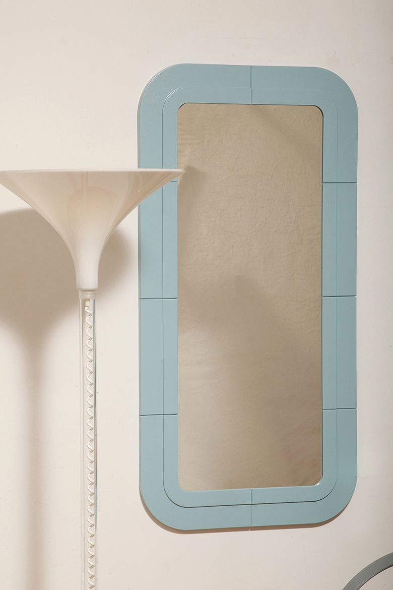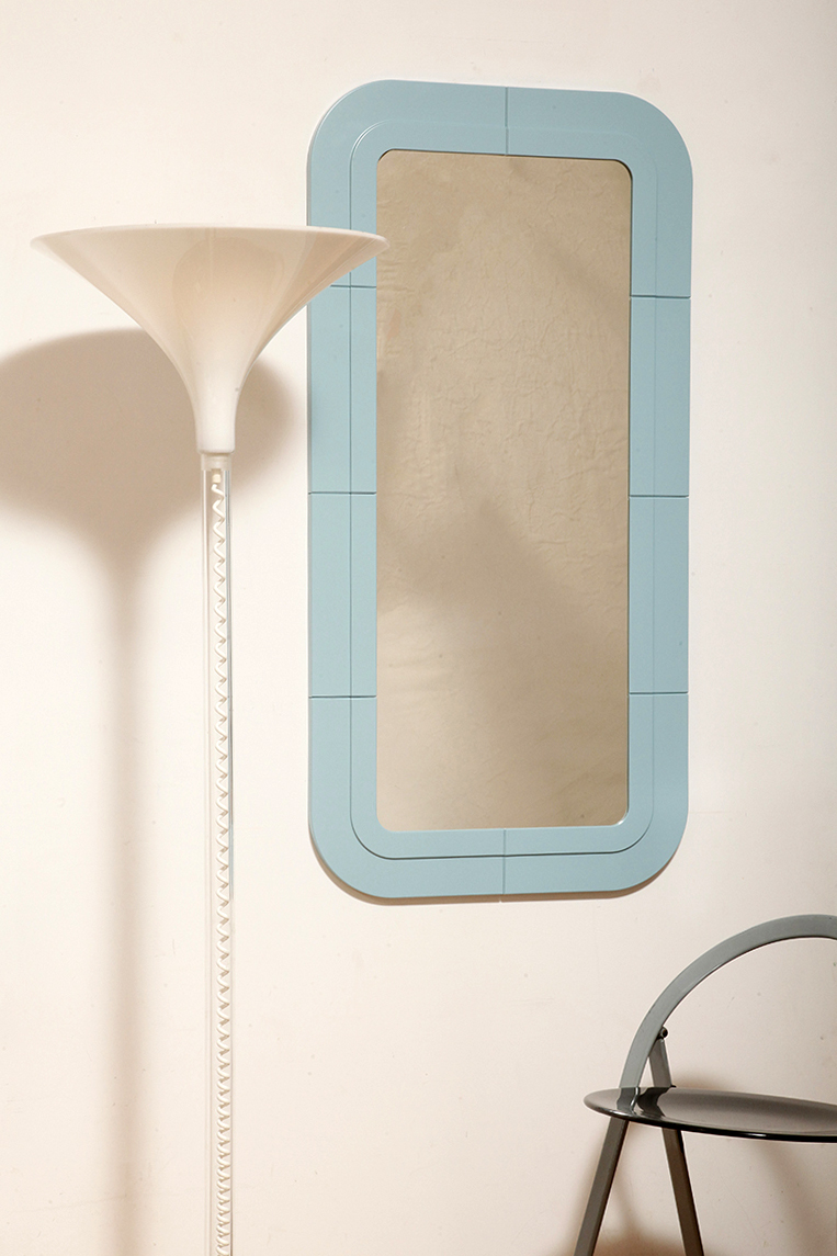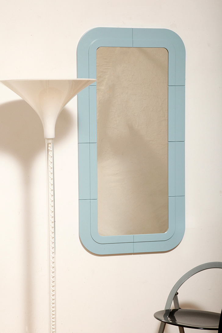 To rzadkie lustro (zwłaszcza w wersji prostokątnej) firmy Kartell z lat 60. XX wieku to doskonały przykład włoskiego, modernistycznego wzornictwa z tworzywa sztucznego. Z delikatnie zaokrągloną, ramą z lakierowanego na jasno niebieski kolor tworzywa ABS, odzwierciedla minimalistyczny, a zarazem radykalny styl zapoczątkowany przez Kartell pod kierownictwem projektantów takich jak Anna Castelli Ferrieri.