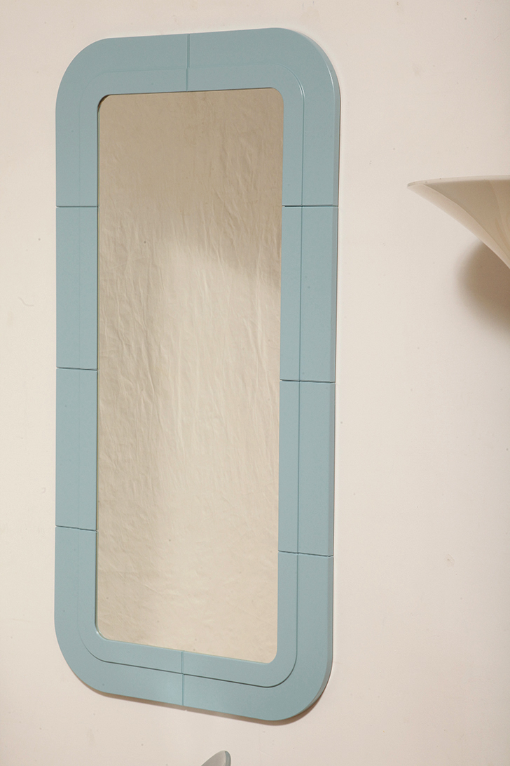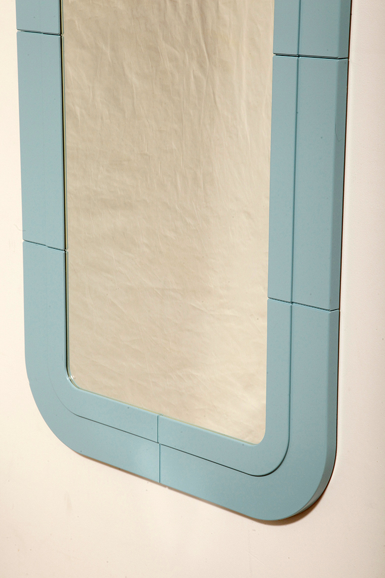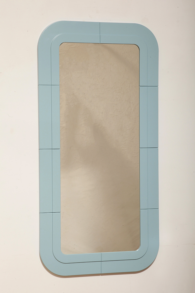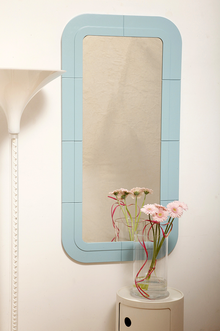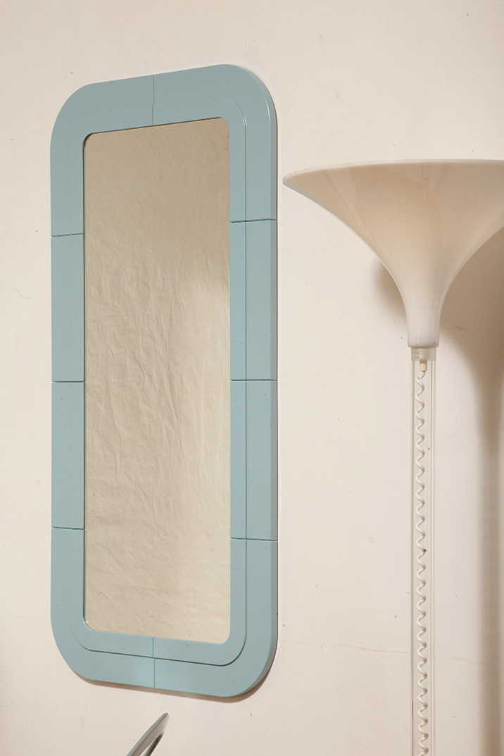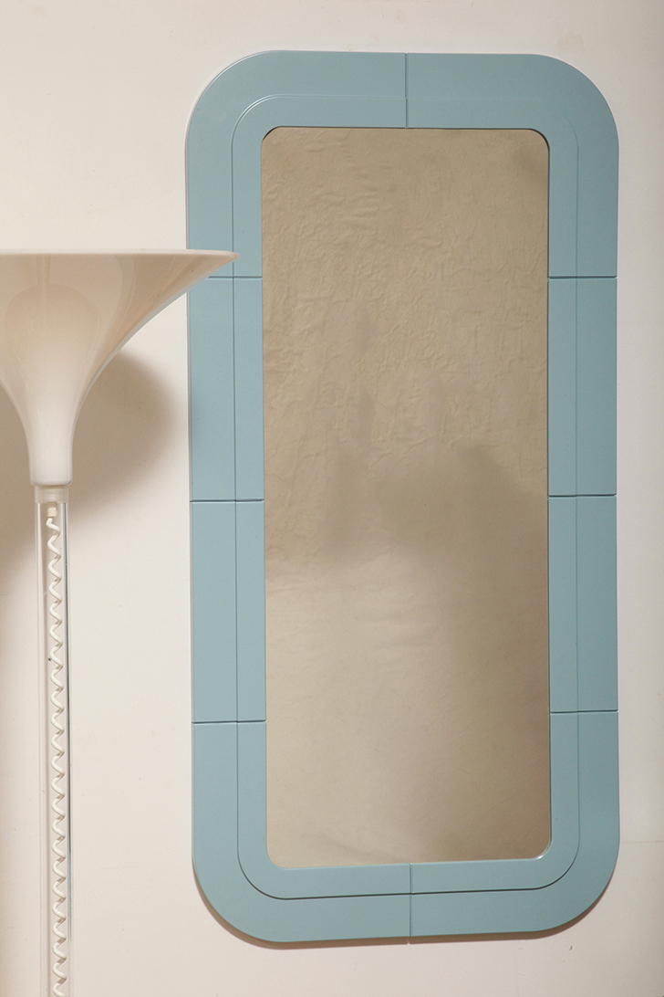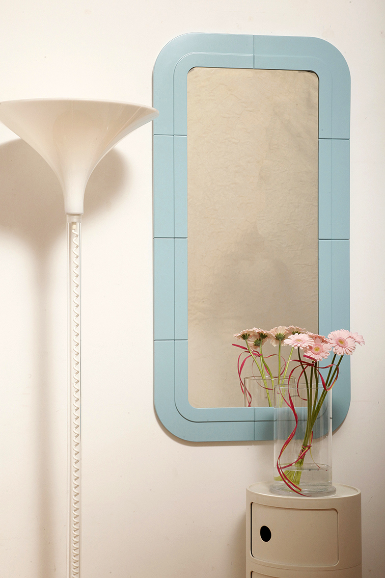 To rzadkie lustro (zwłaszcza w wersji prostokątnej) firmy Kartell z lat 60. XX wieku to doskonały przykład włoskiego, modernistycznego wzornictwa z tworzywa sztucznego. Z delikatnie zaokrągloną, ramą z lakierowanego na jasno niebieski kolor tworzywa ABS, odzwierciedla minimalistyczny, a zarazem radykalny styl zapoczątkowany przez Kartell pod kierownictwem projektantów takich jak Anna Castelli Ferrieri.