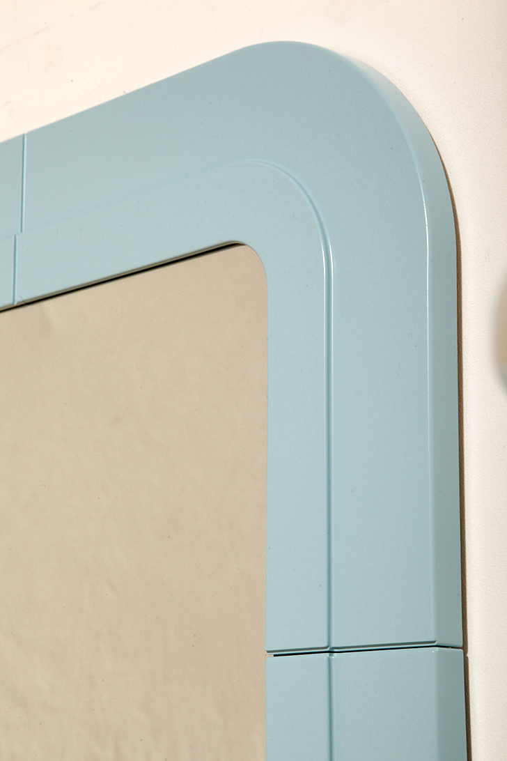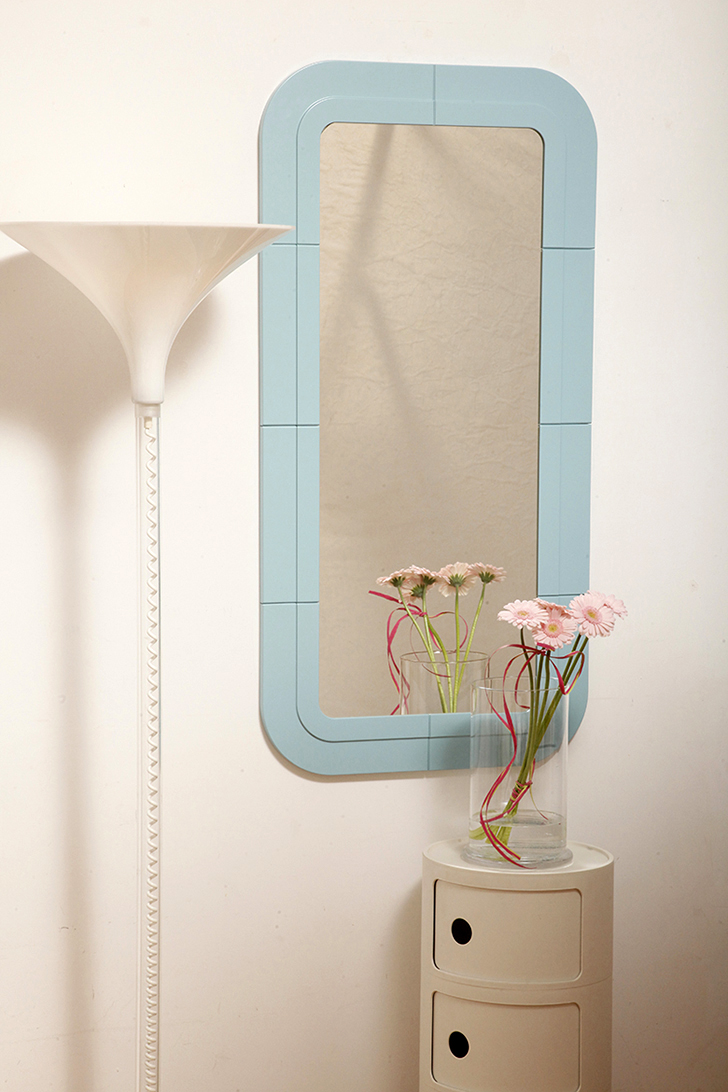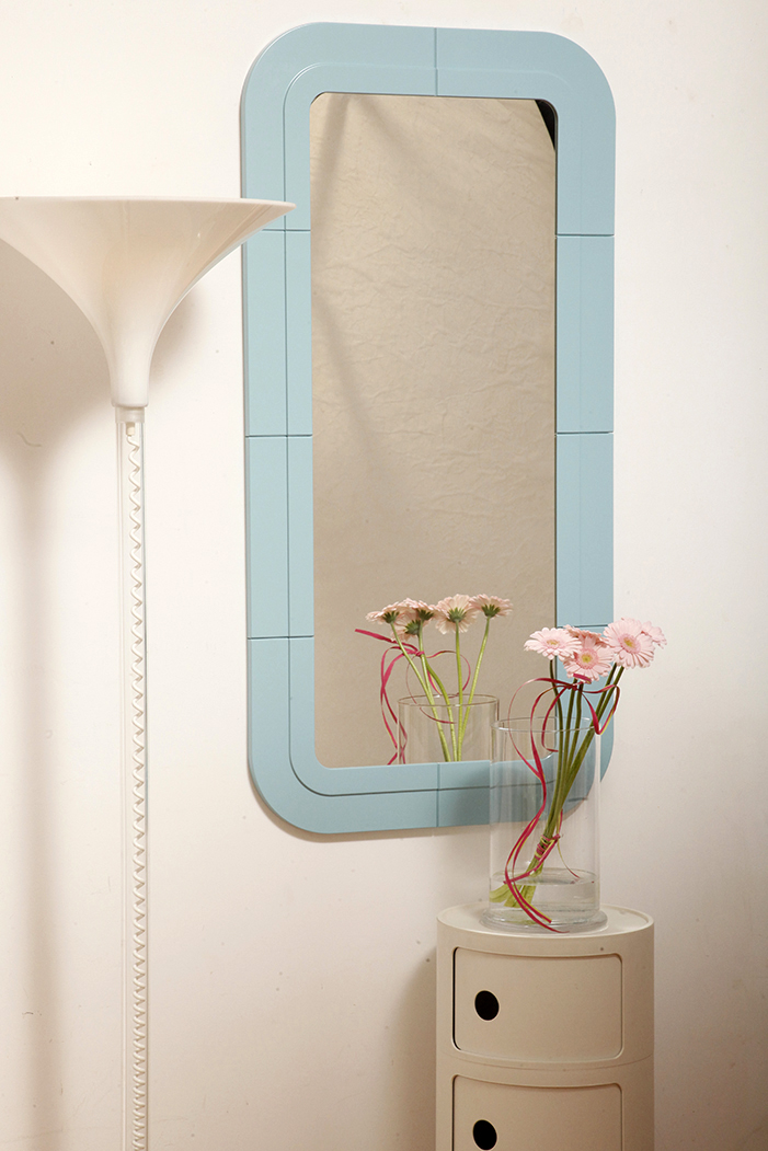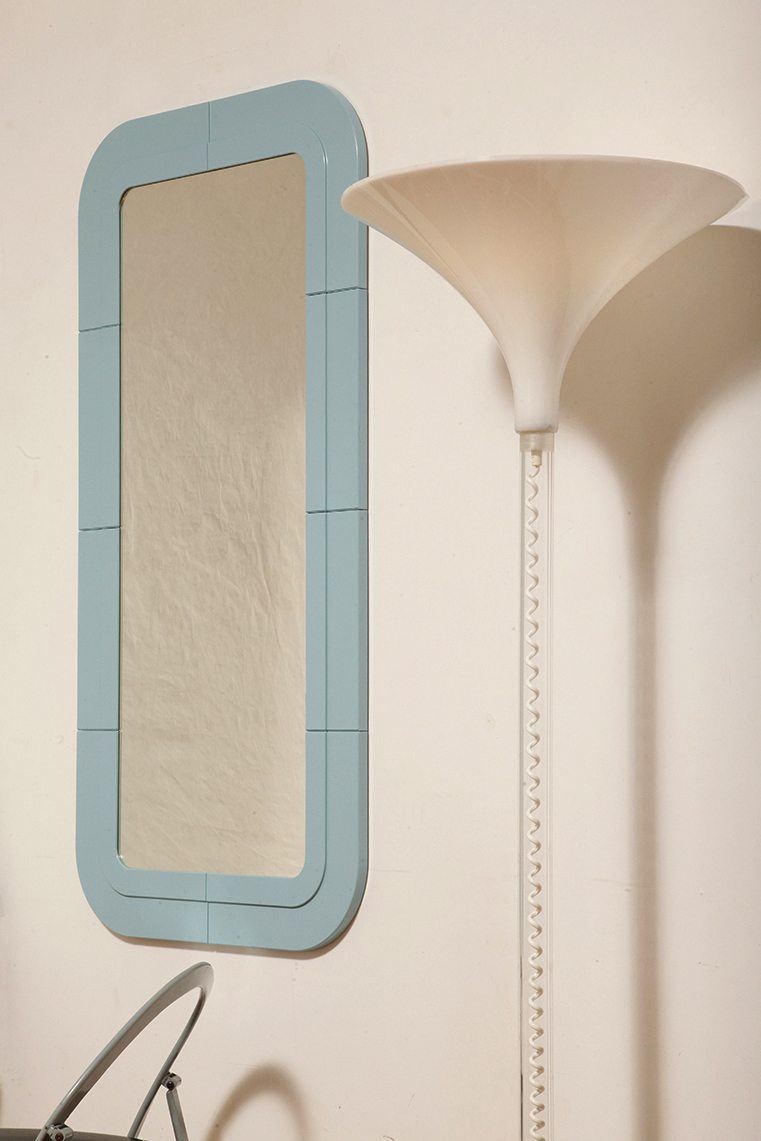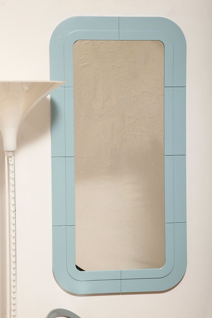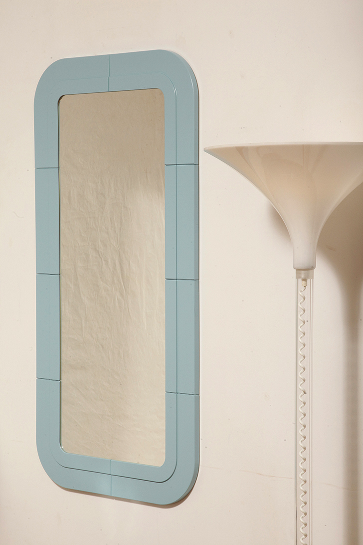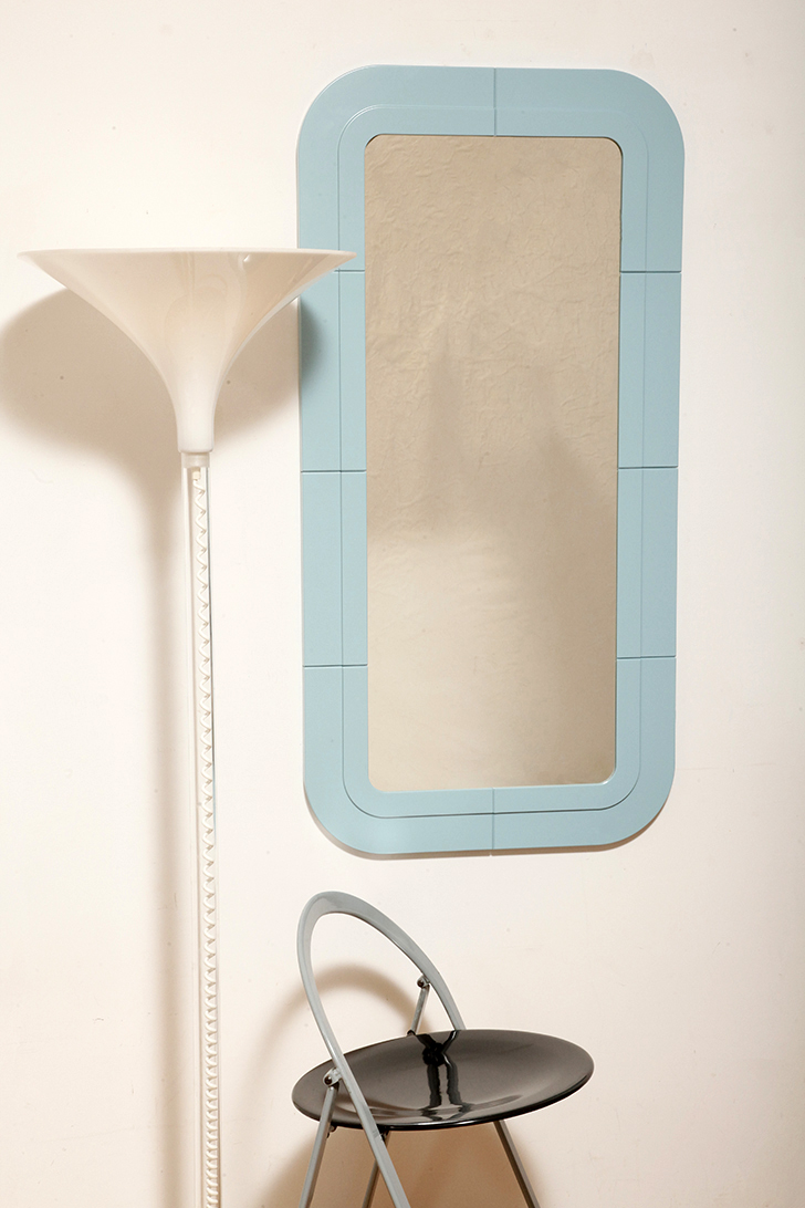 To rzadkie lustro (zwłaszcza w wersji prostokątnej) firmy Kartell z lat 60. XX wieku to doskonały przykład włoskiego, modernistycznego wzornictwa z tworzywa sztucznego. Z delikatnie zaokrągloną, ramą z lakierowanego na jasno niebieski kolor tworzywa ABS, odzwierciedla minimalistyczny, a zarazem radykalny styl zapoczątkowany przez Kartell pod kierownictwem projektantów takich jak Anna Castelli Ferrieri.