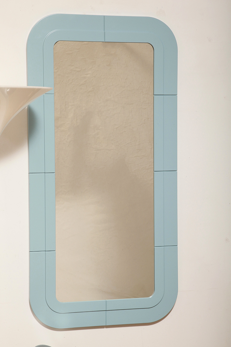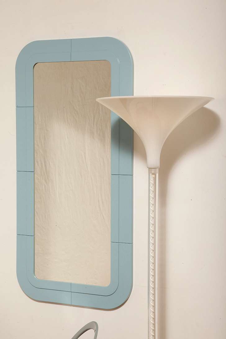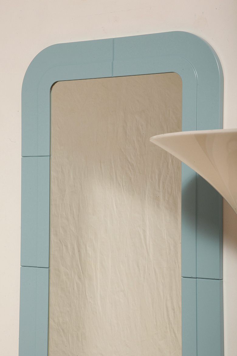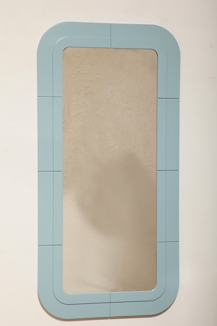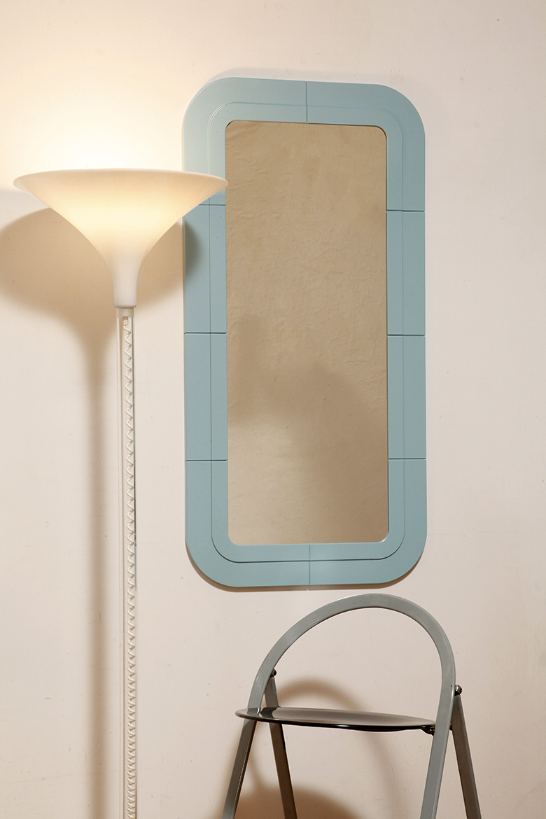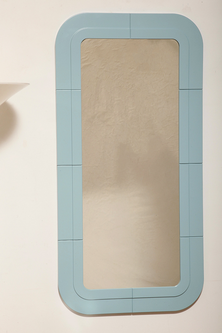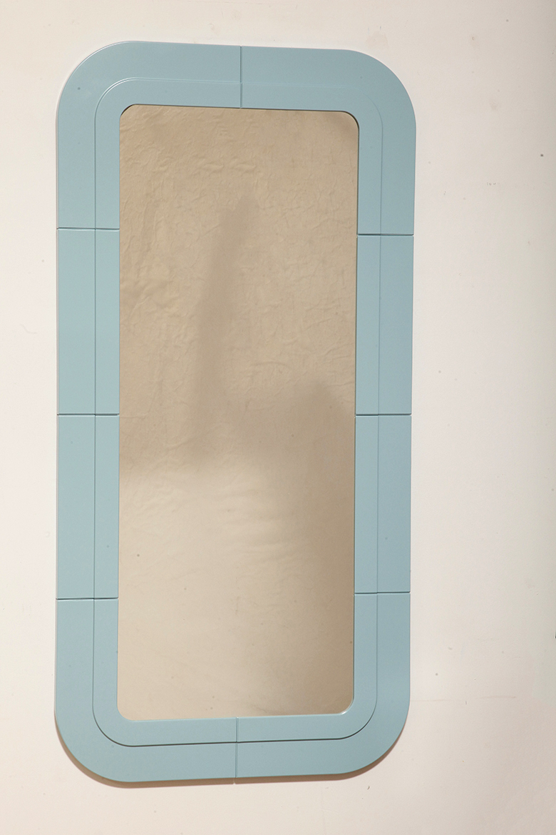 To rzadkie lustro (zwłaszcza w wersji prostokątnej) firmy Kartell z lat 60. XX wieku to doskonały przykład włoskiego, modernistycznego wzornictwa z tworzywa sztucznego. Z delikatnie zaokrągloną, ramą z lakierowanego na jasno niebieski kolor tworzywa ABS, odzwierciedla minimalistyczny, a zarazem radykalny styl zapoczątkowany przez Kartell pod kierownictwem projektantów takich jak Anna Castelli Ferrieri.
