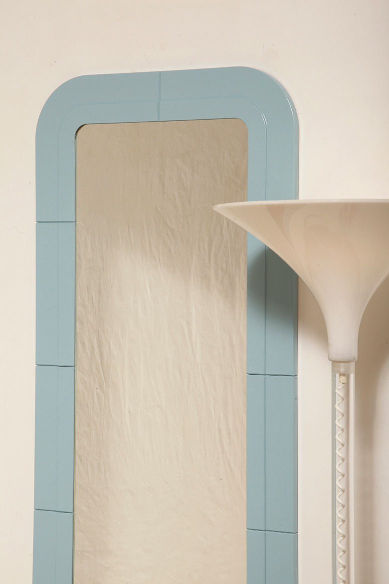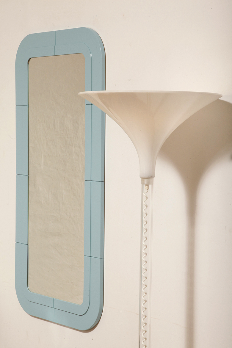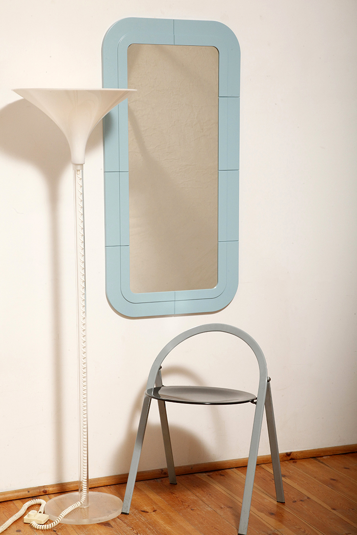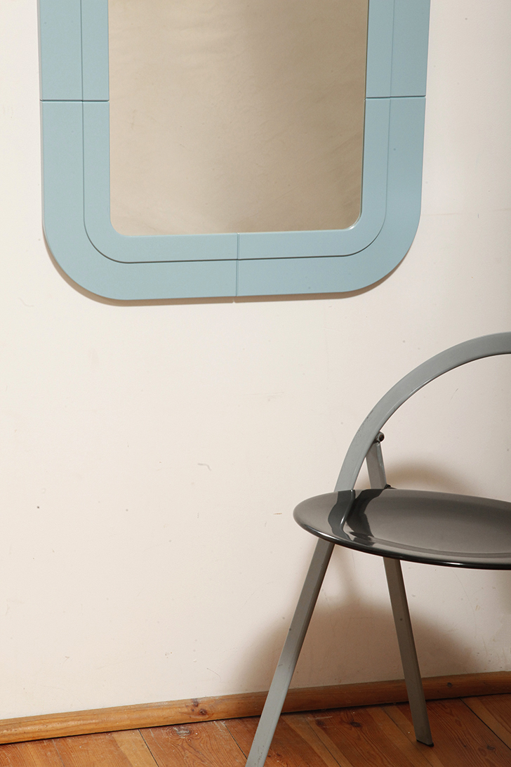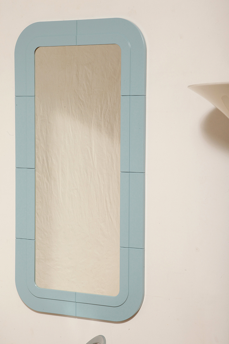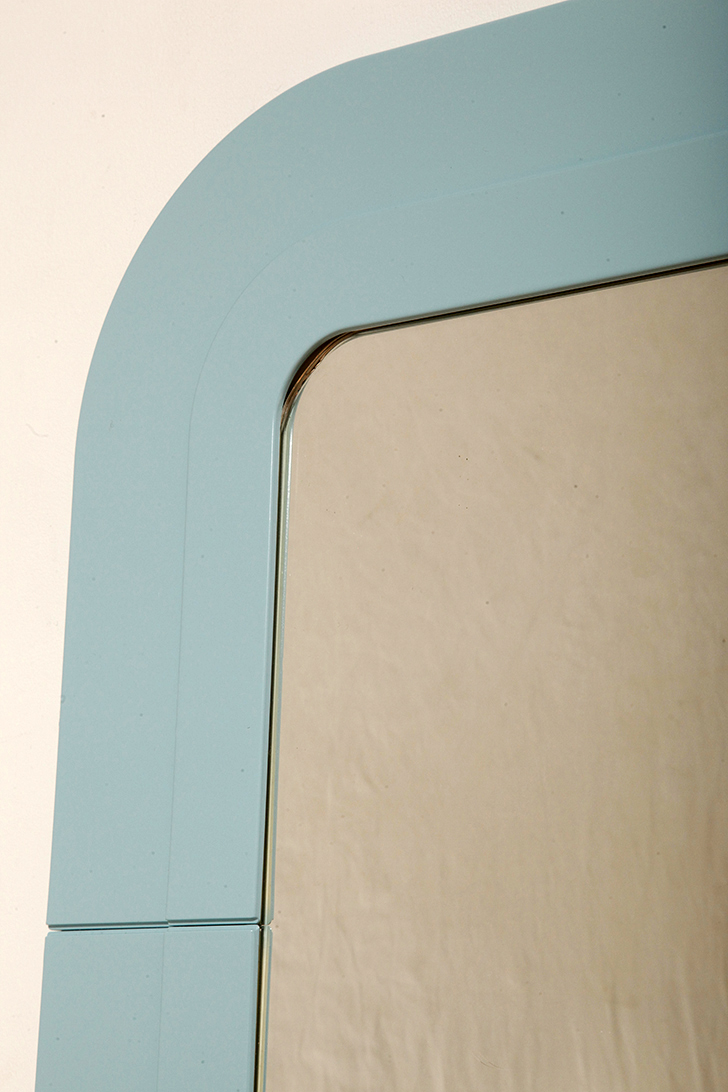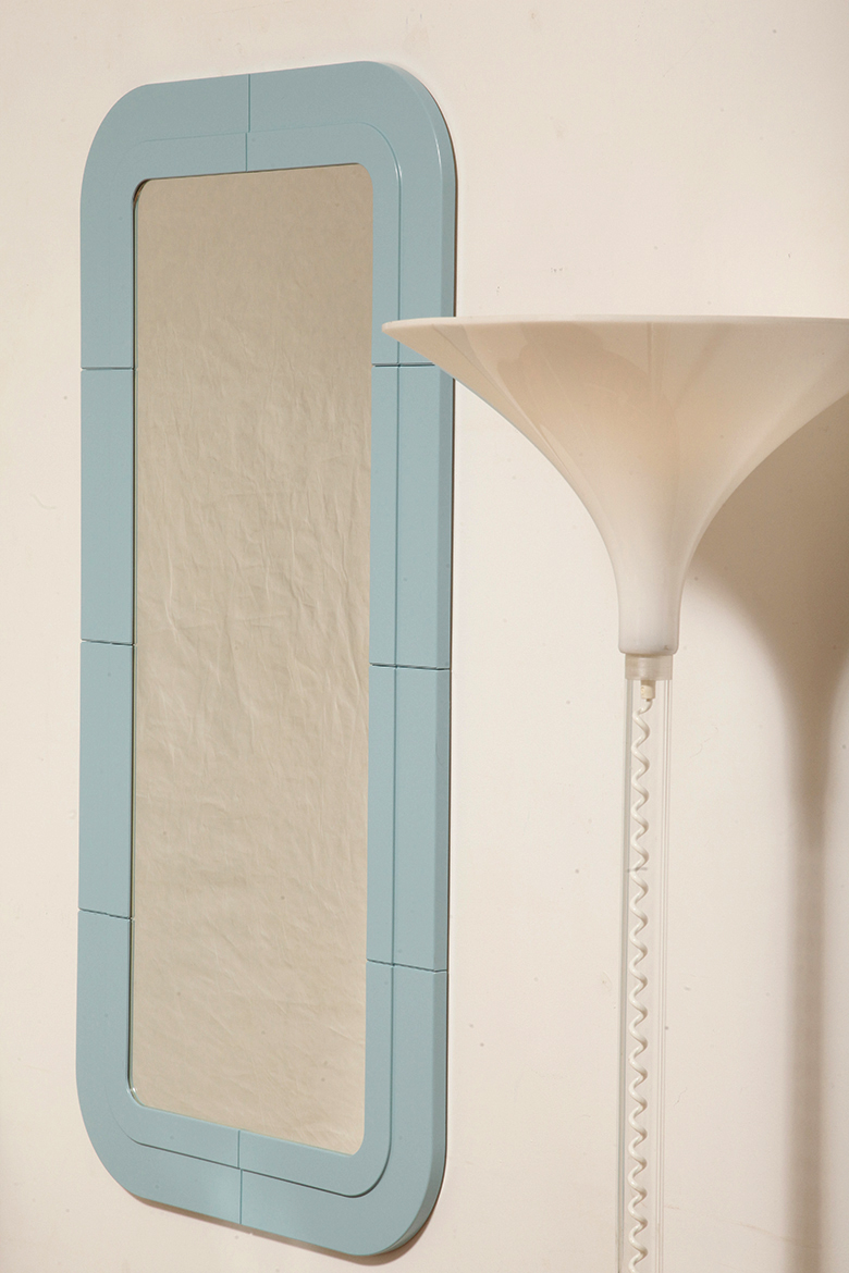 To rzadkie lustro (zwłaszcza w wersji prostokątnej) firmy Kartell z lat 60. XX wieku to doskonały przykład włoskiego, modernistycznego wzornictwa z tworzywa sztucznego. Z delikatnie zaokrągloną, ramą z lakierowanego na jasno niebieski kolor tworzywa ABS, odzwierciedla minimalistyczny, a zarazem radykalny styl zapoczątkowany przez Kartell pod kierownictwem projektantów takich jak Anna Castelli Ferrieri.