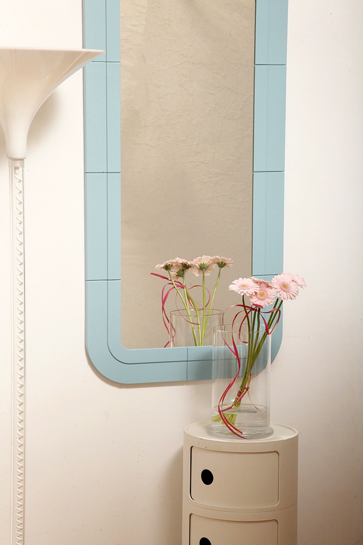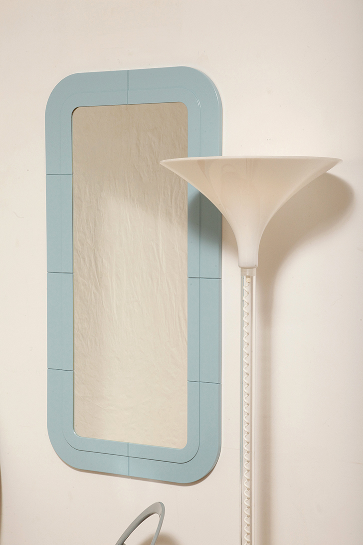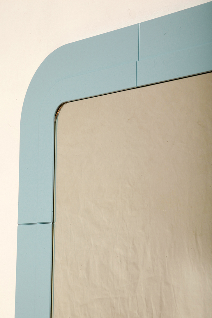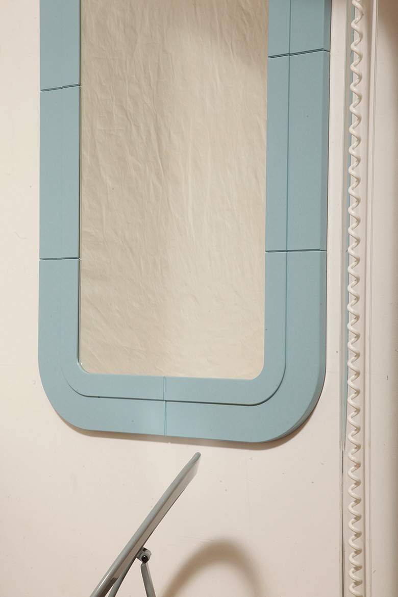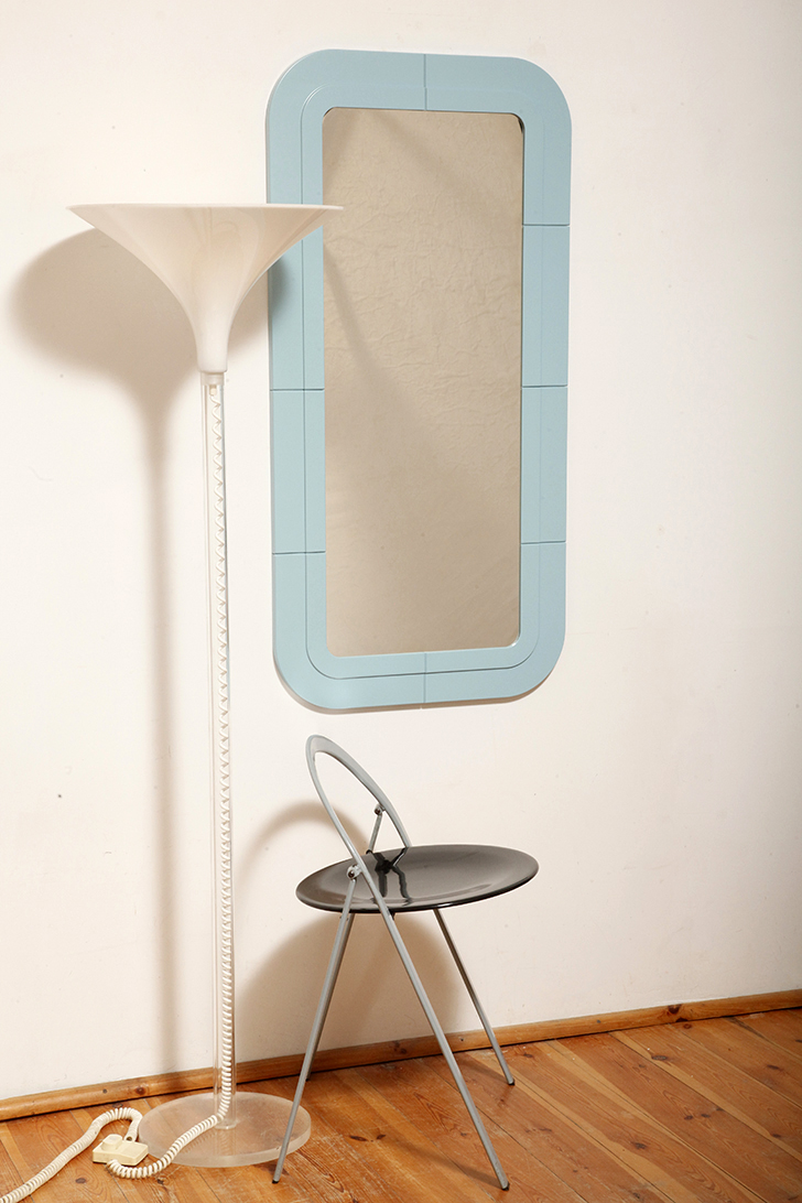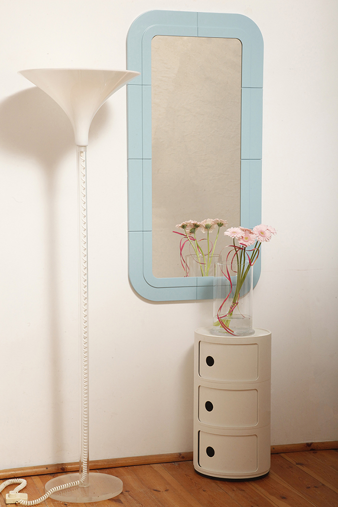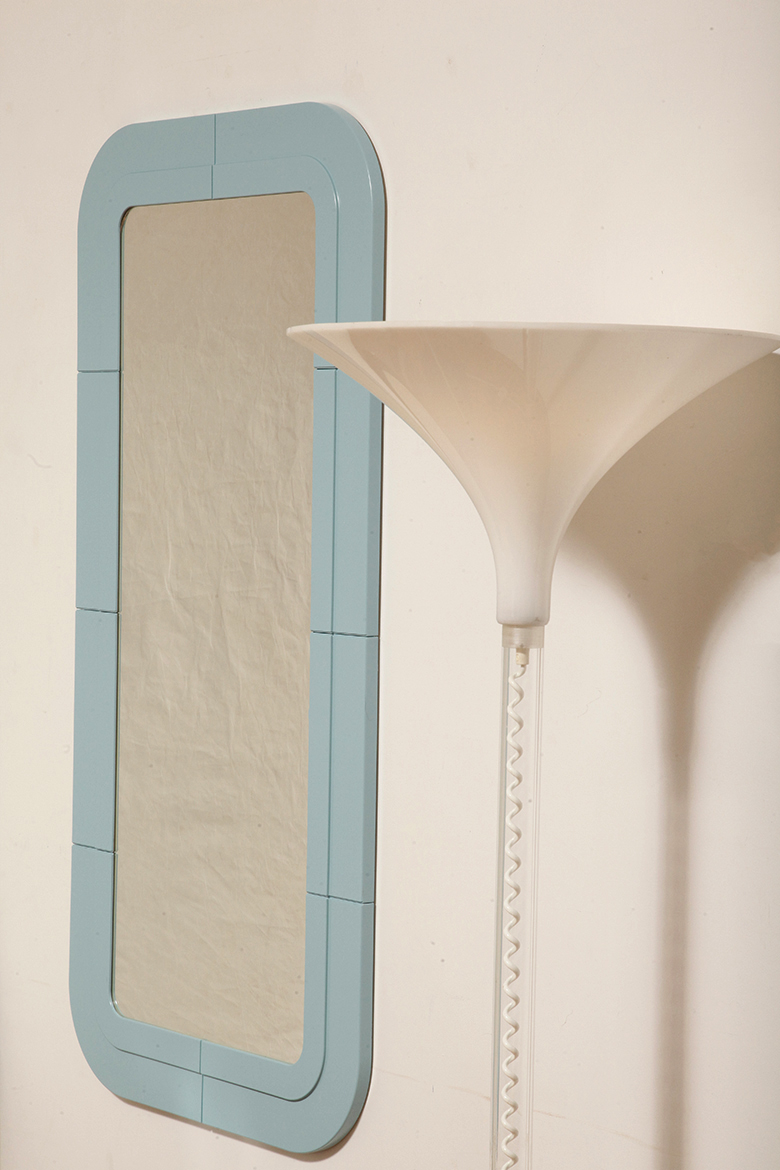 To rzadkie lustro (zwłaszcza w wersji prostokątnej) firmy Kartell z lat 60. XX wieku to doskonały przykład włoskiego, modernistycznego wzornictwa z tworzywa sztucznego. Z delikatnie zaokrągloną, ramą z lakierowanego na jasno niebieski kolor tworzywa ABS, odzwierciedla minimalistyczny, a zarazem radykalny styl zapoczątkowany przez Kartell pod kierownictwem projektantów takich jak Anna Castelli Ferrieri.
