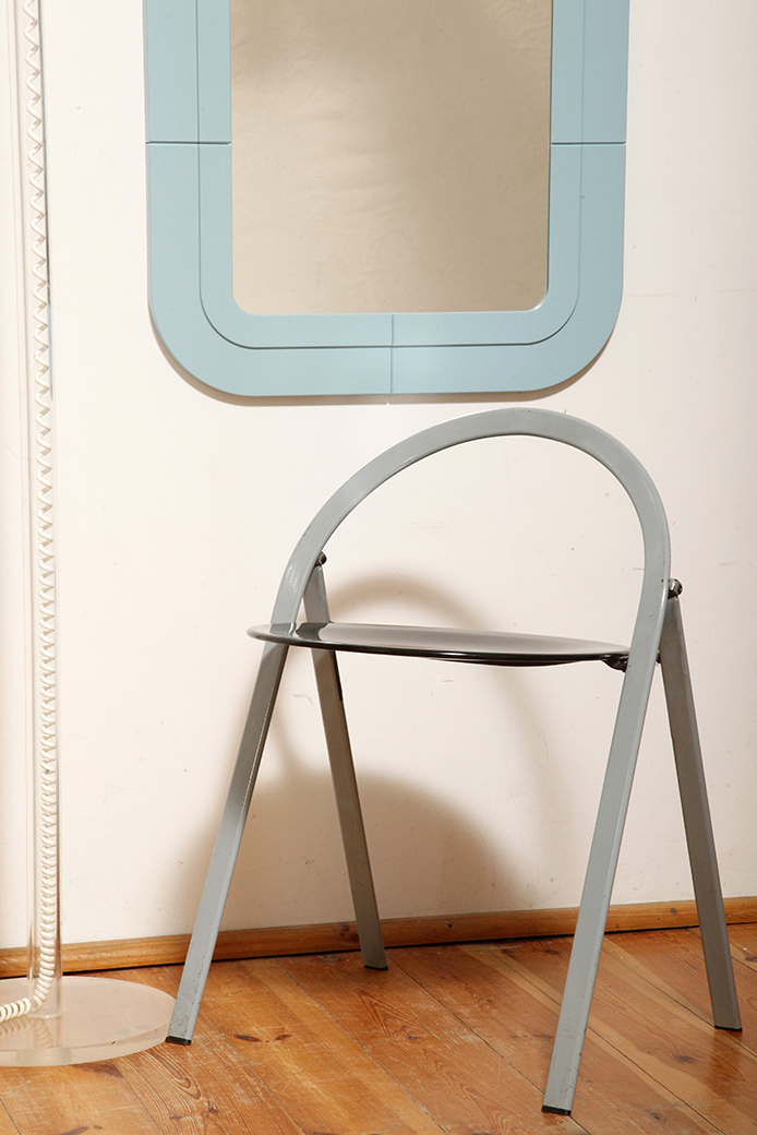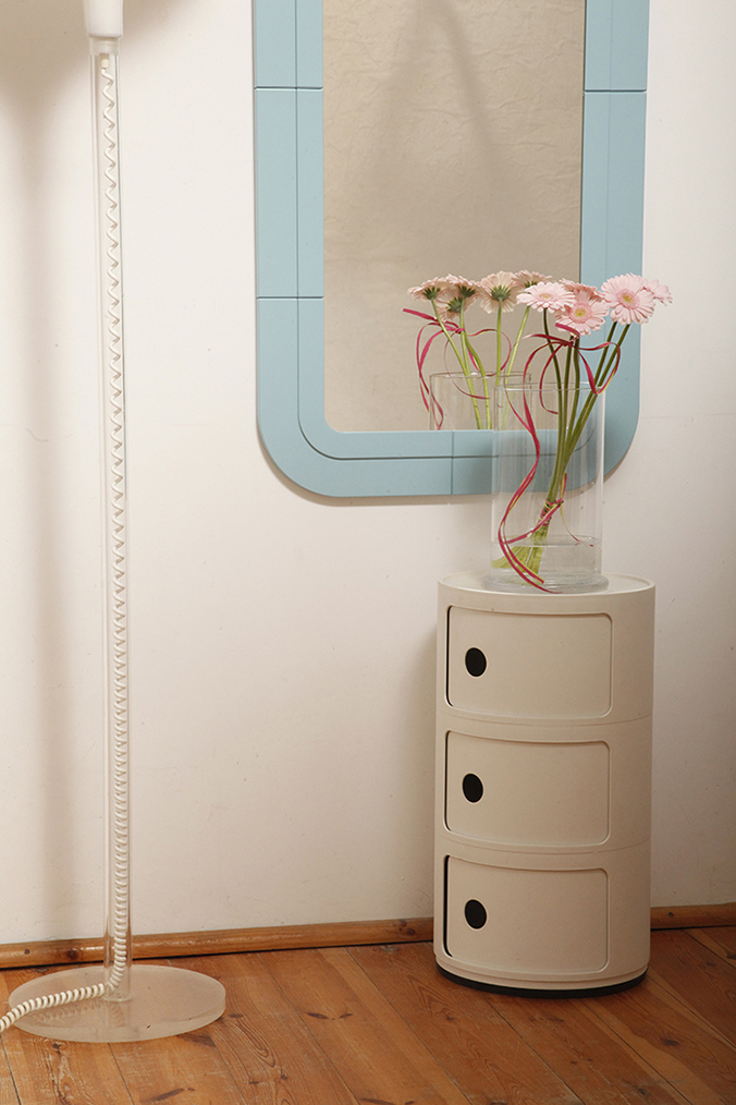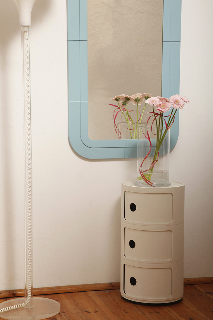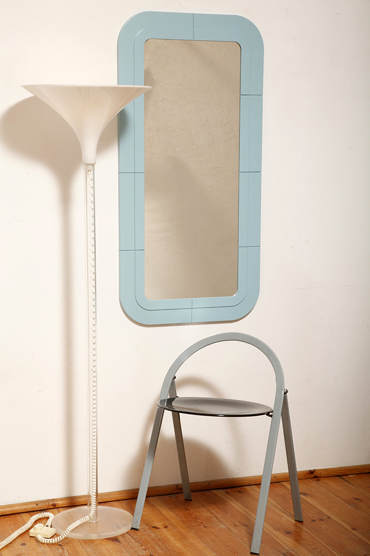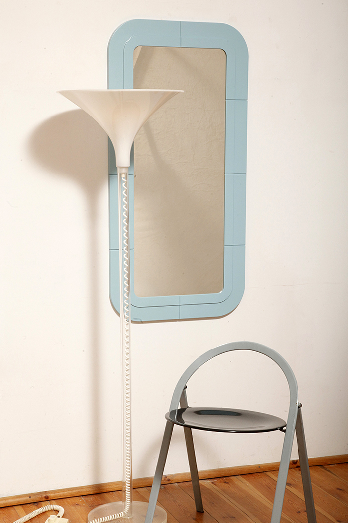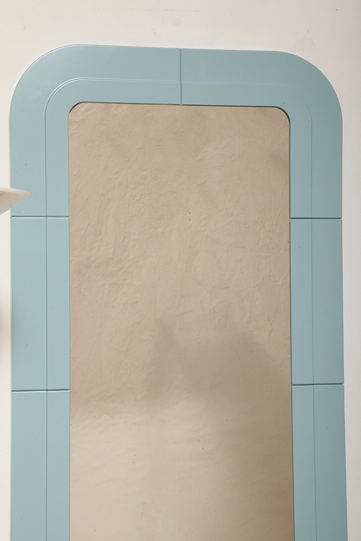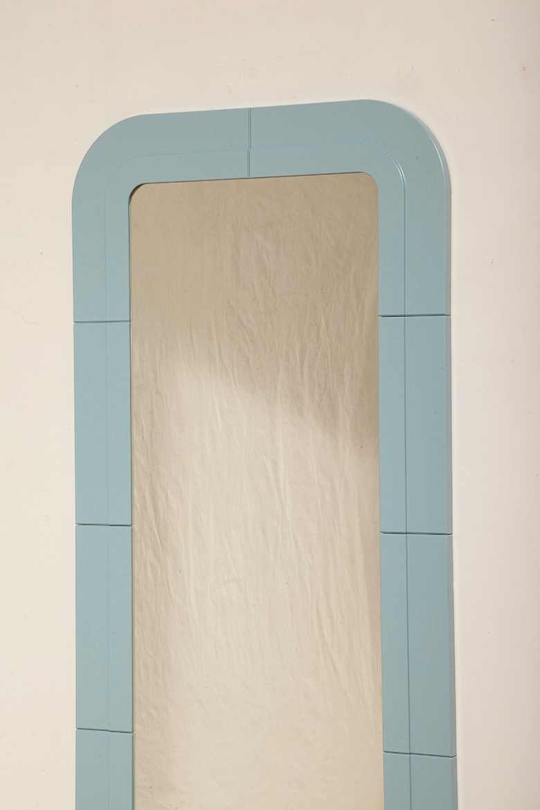 To rzadkie lustro (zwłaszcza w wersji prostokątnej) firmy Kartell z lat 60. XX wieku to doskonały przykład włoskiego, modernistycznego wzornictwa z tworzywa sztucznego. Z delikatnie zaokrągloną, ramą z lakierowanego na jasno niebieski kolor tworzywa ABS, odzwierciedla minimalistyczny, a zarazem radykalny styl zapoczątkowany przez Kartell pod kierownictwem projektantów takich jak Anna Castelli Ferrieri.