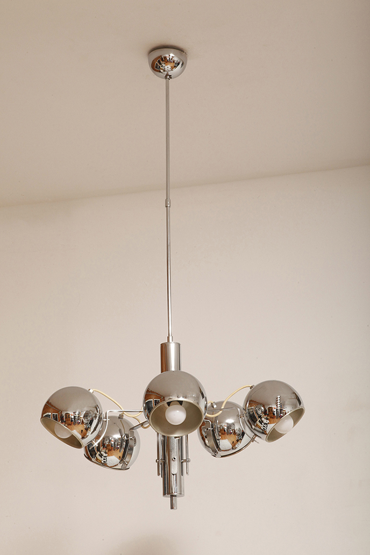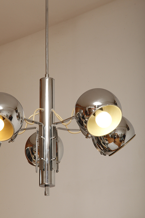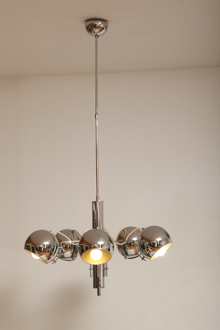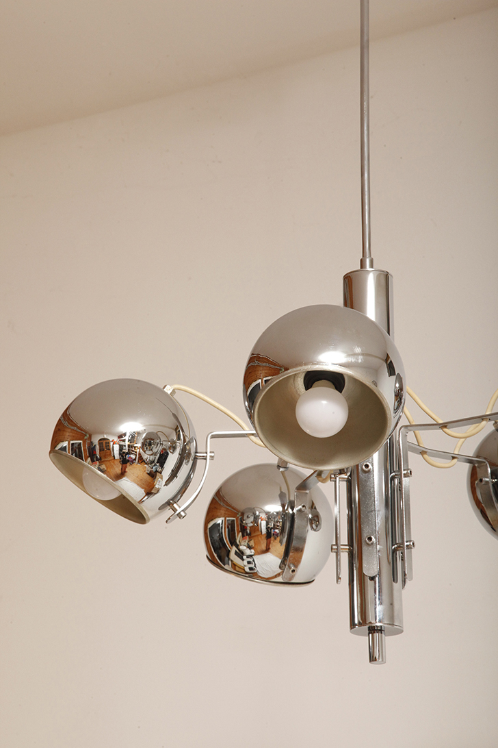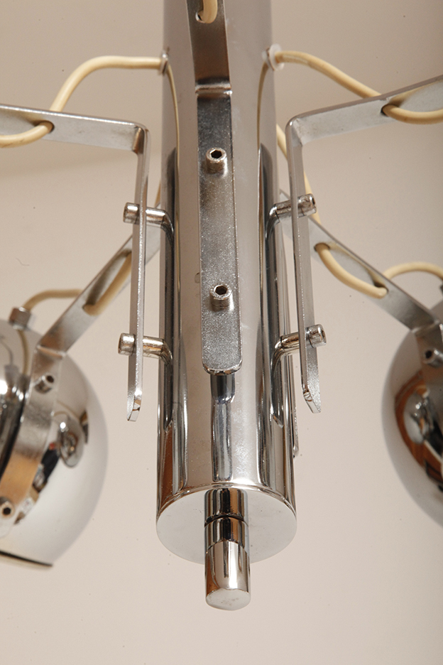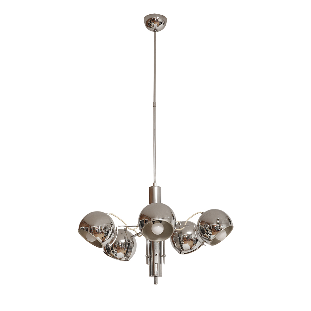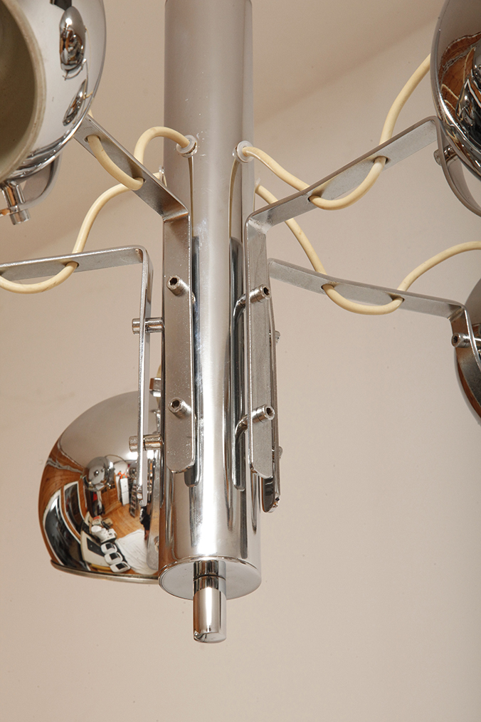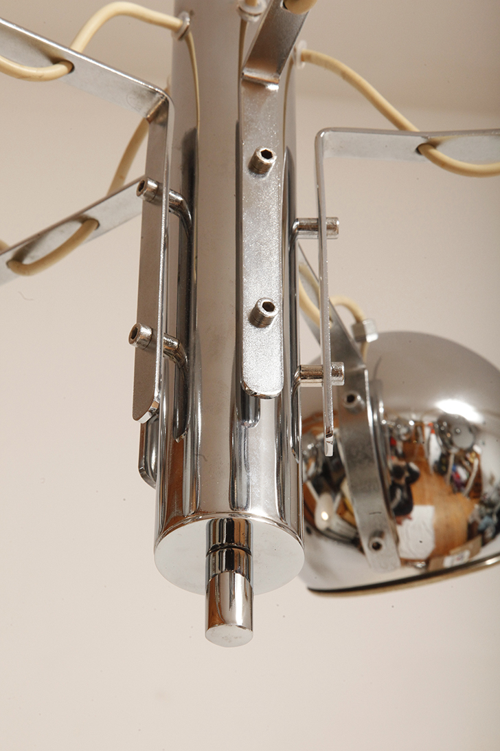 Rozłożysta cała metalowa długa pięciopunktowa chromowana lampa sufitowa z regulowaną długością zwisu, Space Age, Włochy, lata 60/70.