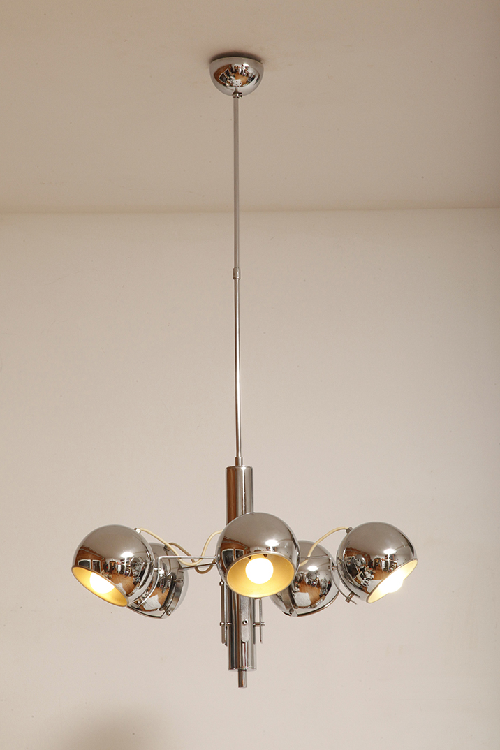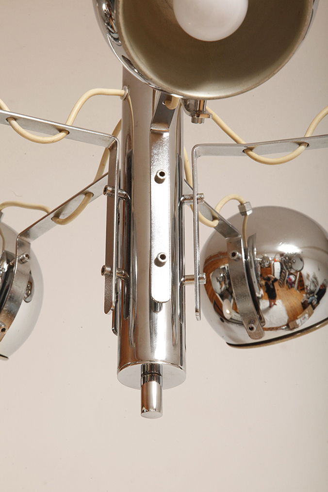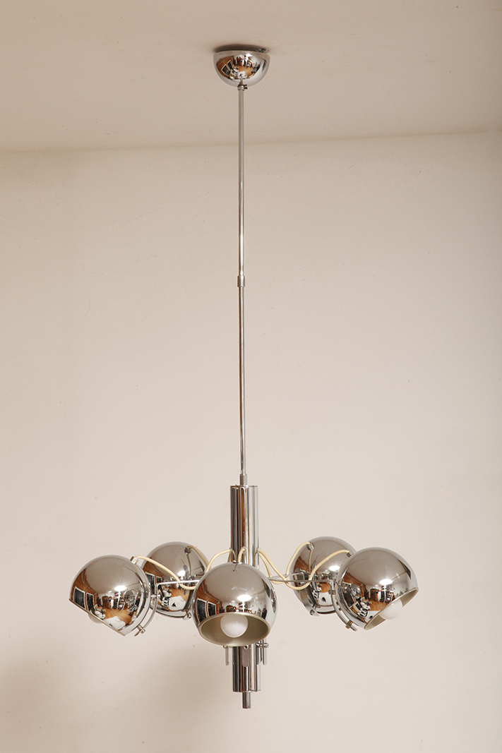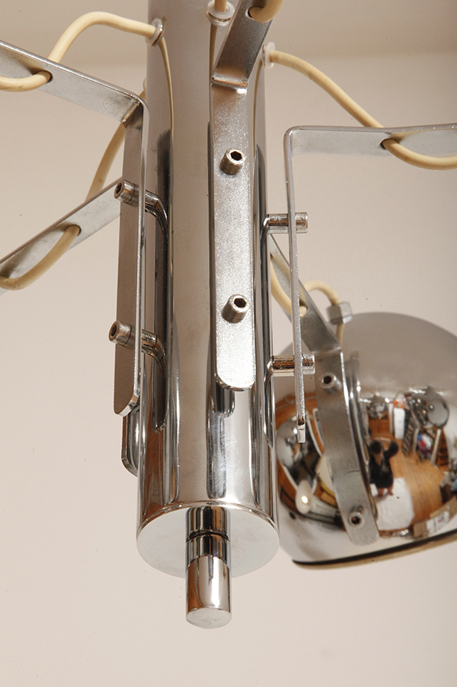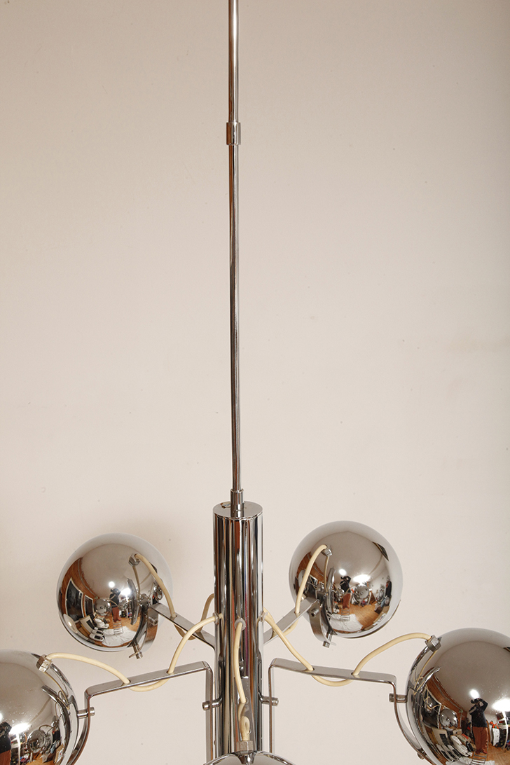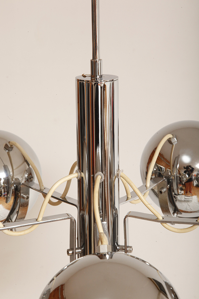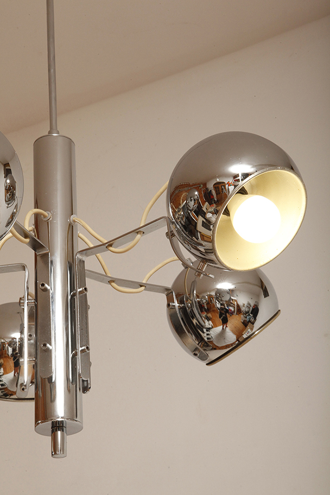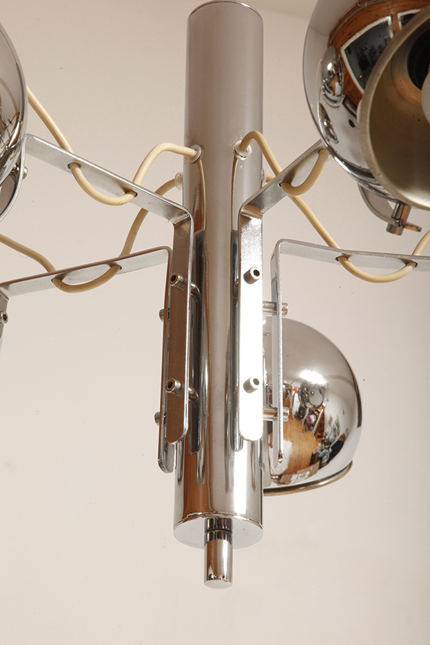 Rozłożysta cała metalowa długa pięciopunktowa chromowana lampa sufitowa z regulowaną długością zwisu, Space Age, Włochy, lata 60/70.