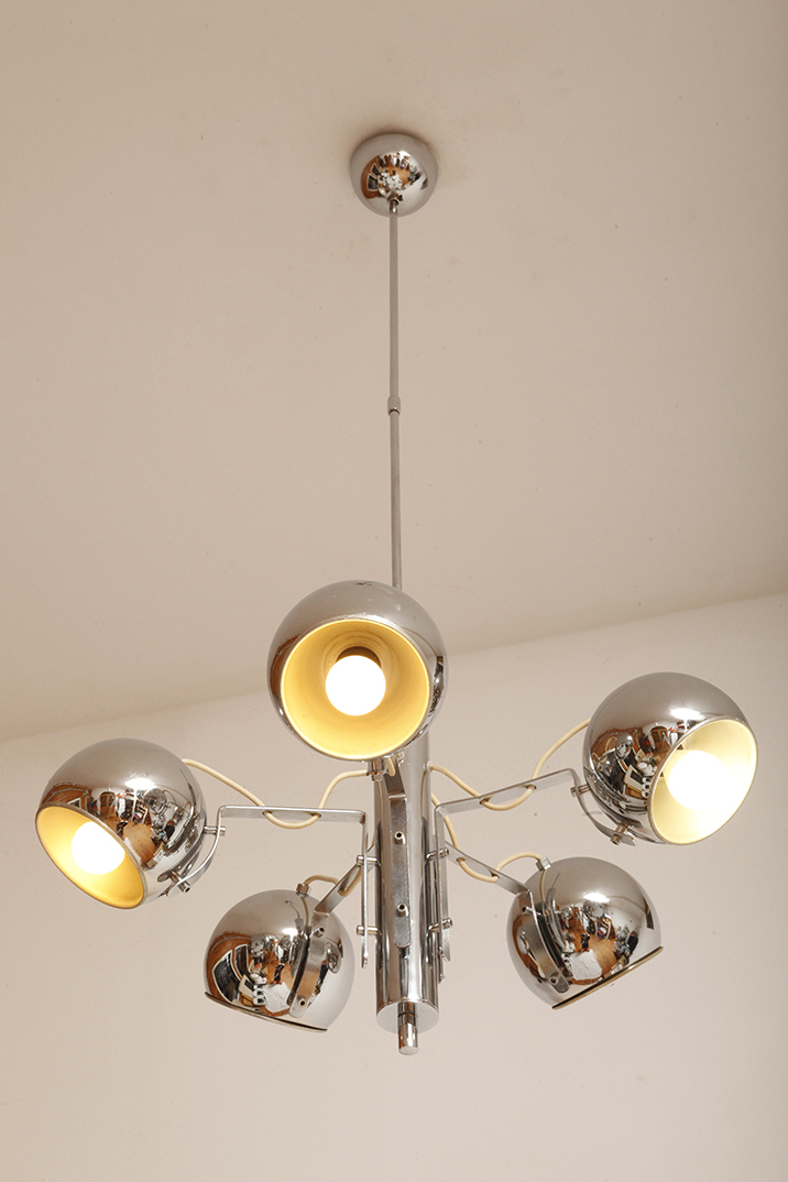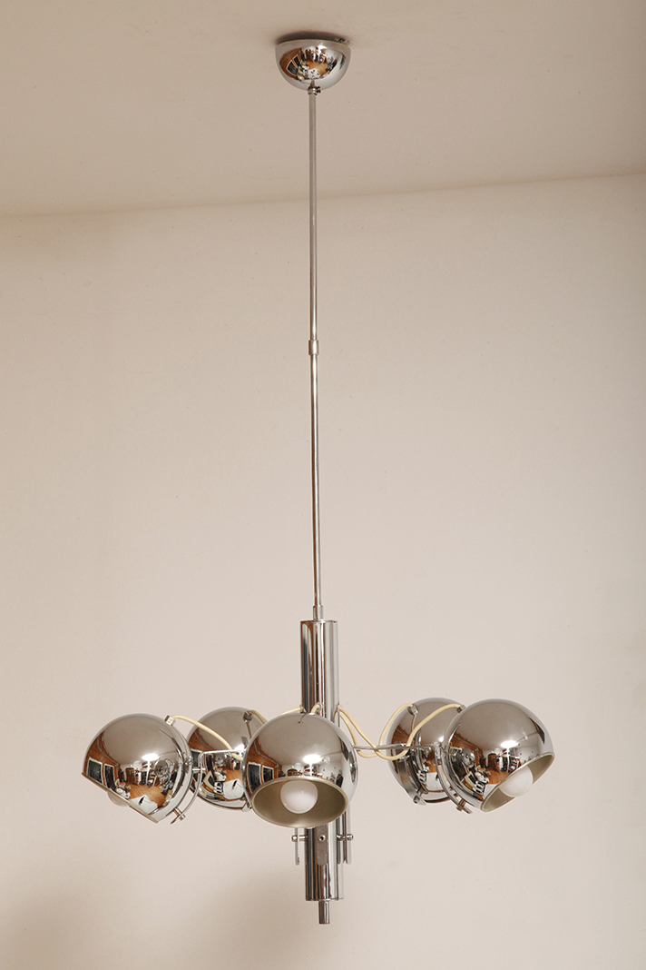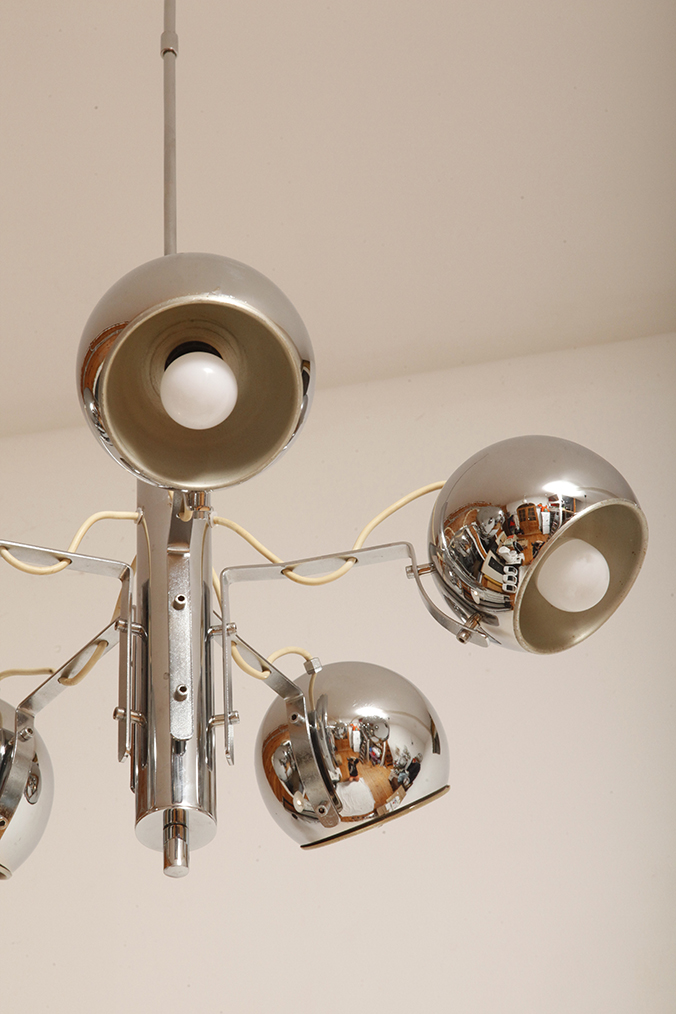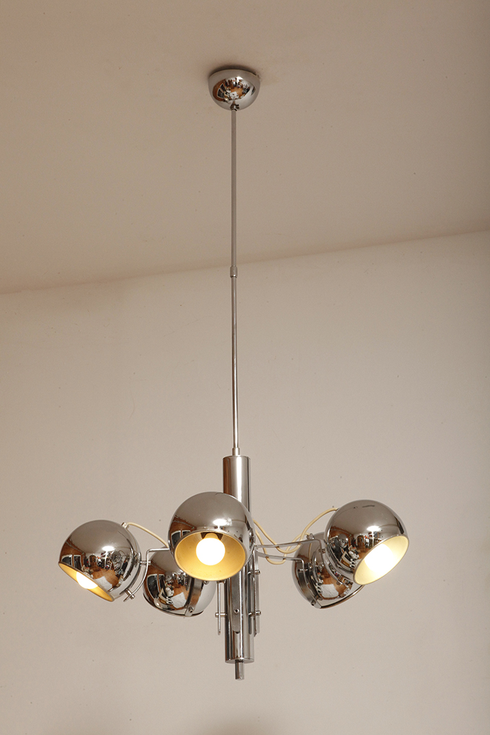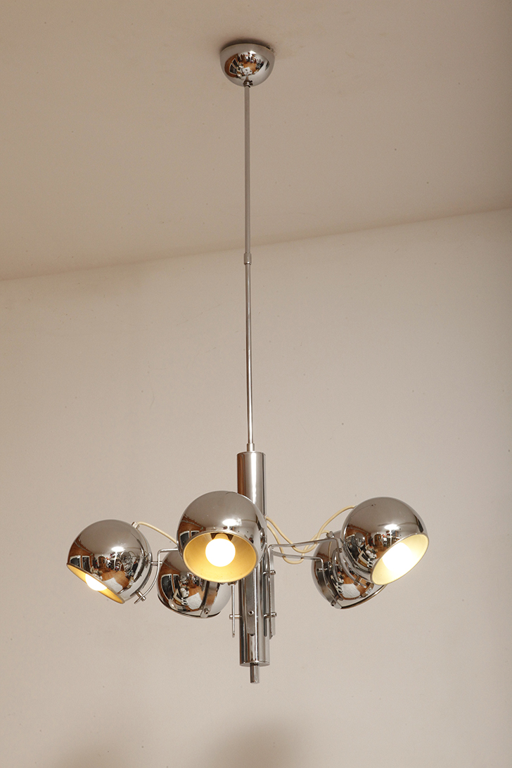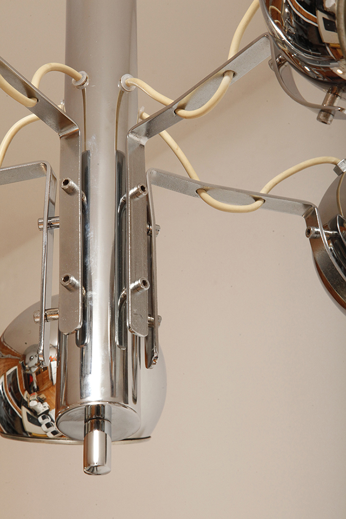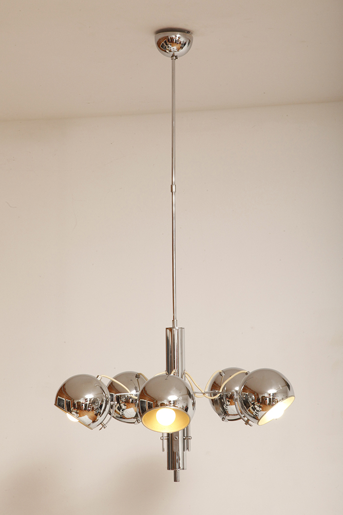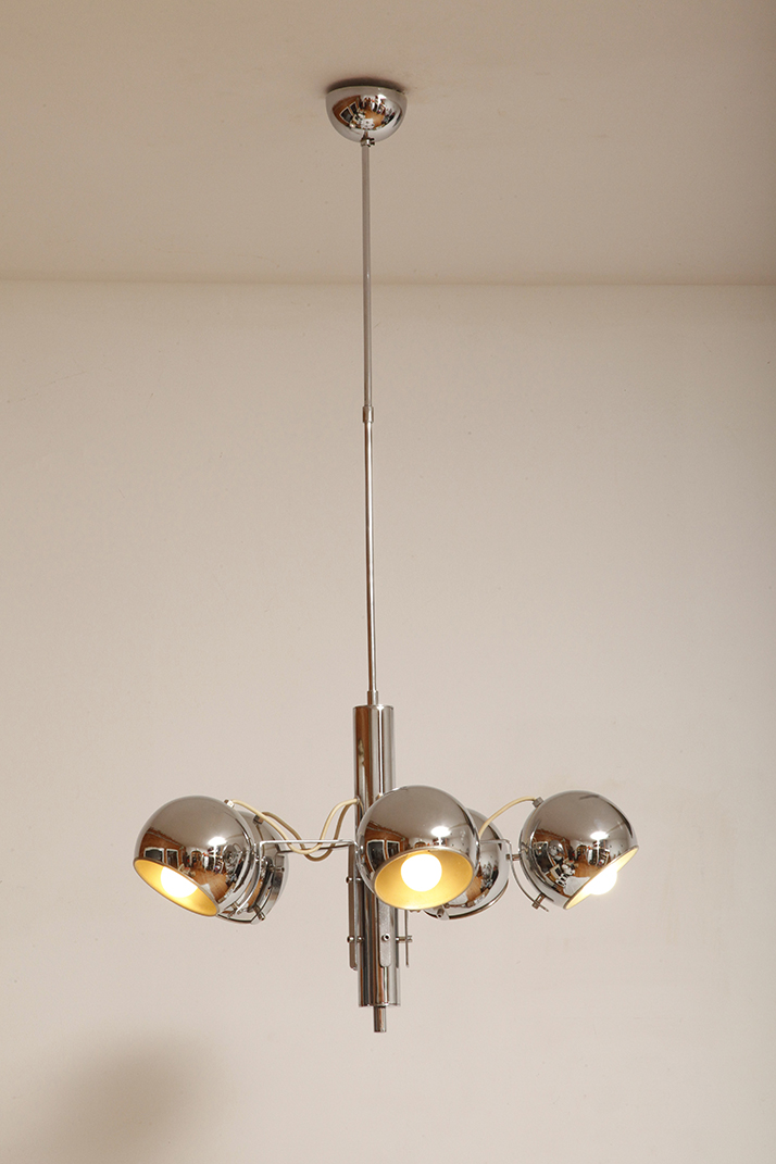 Rozłożysta cała metalowa długa pięciopunktowa chromowana lampa sufitowa z regulowaną długością zwisu, Space Age, Włochy, lata 60/70.