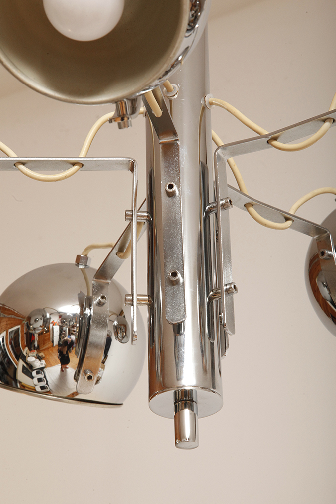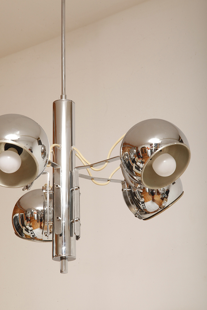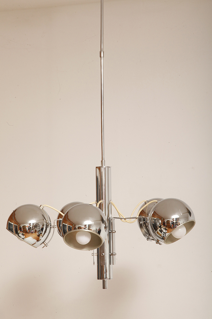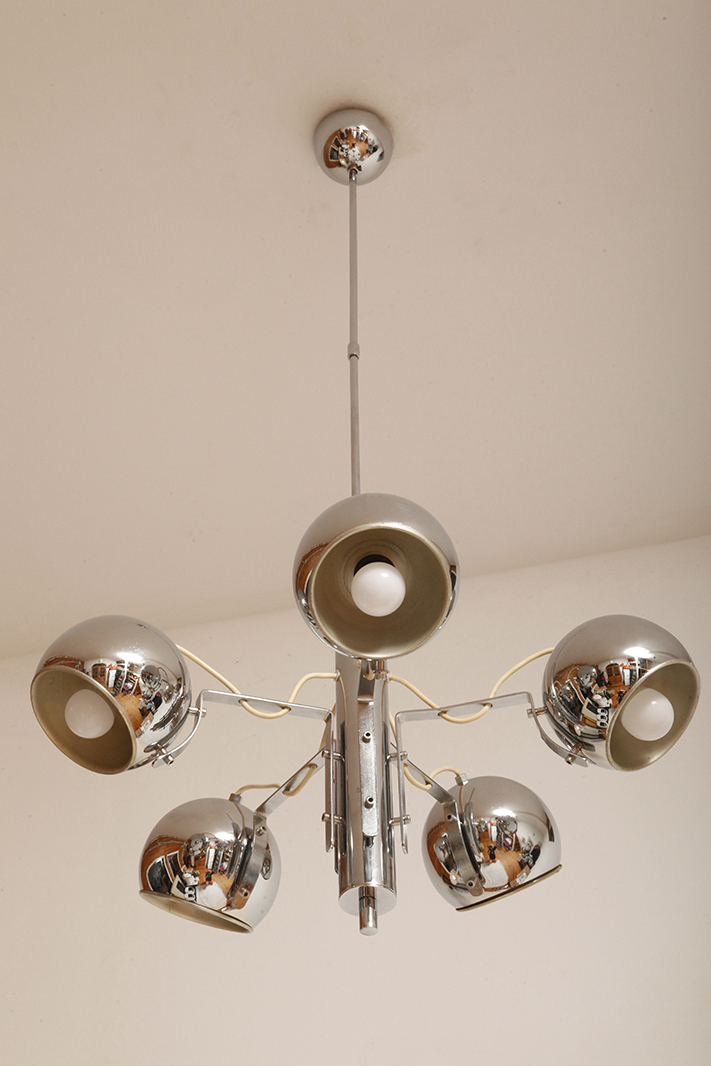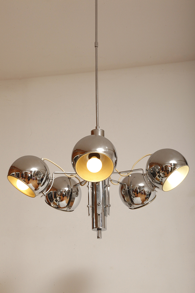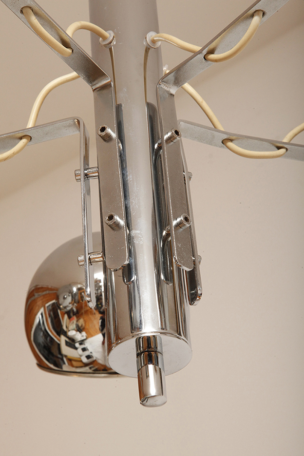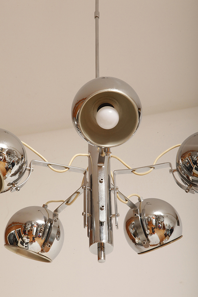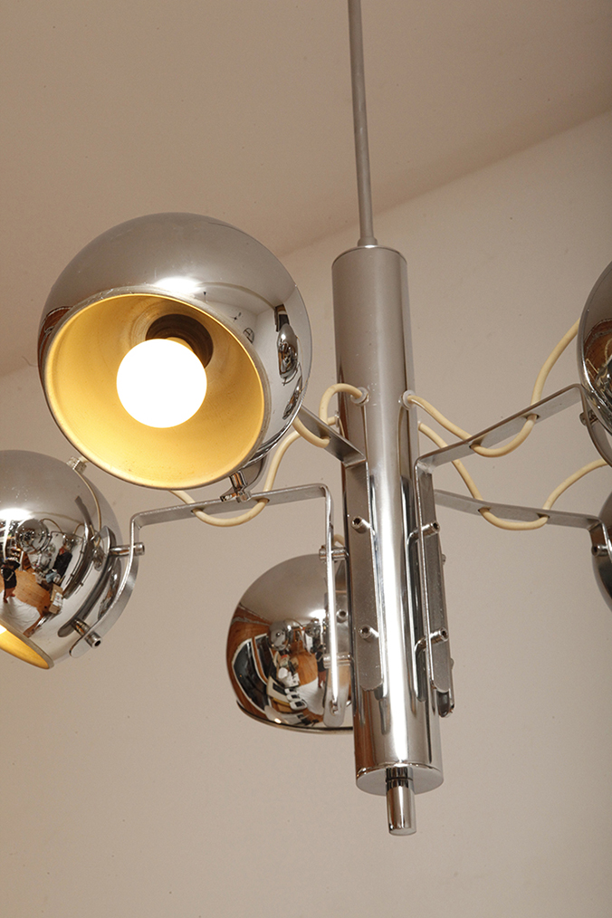 Rozłożysta cała metalowa długa pięciopunktowa chromowana lampa sufitowa z regulowaną długością zwisu, Space Age, Włochy, lata 60/70.