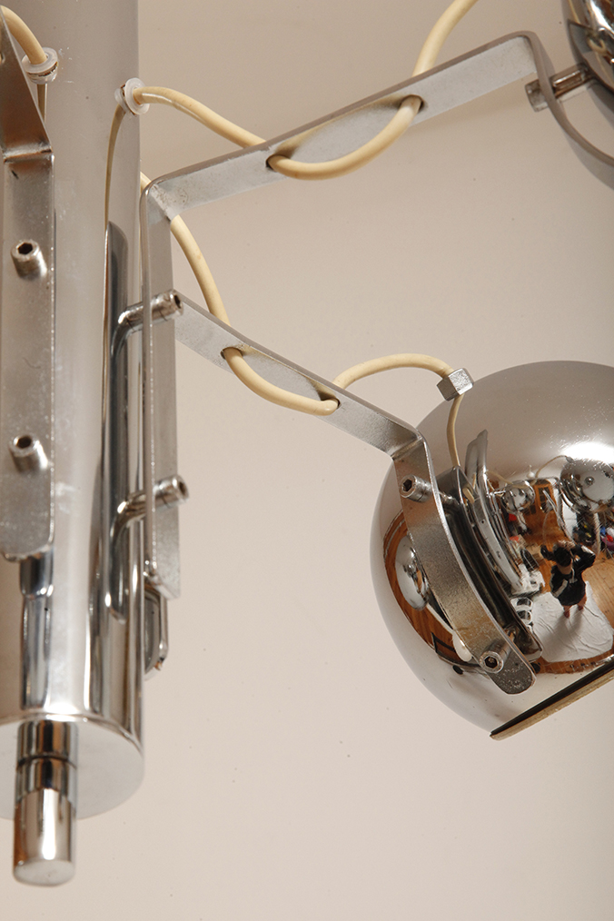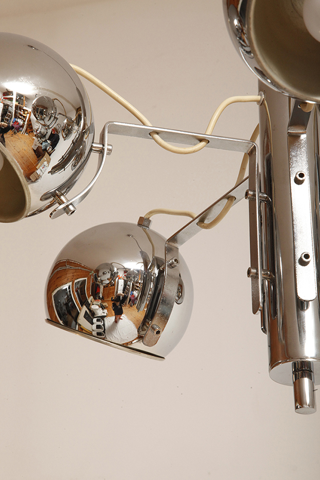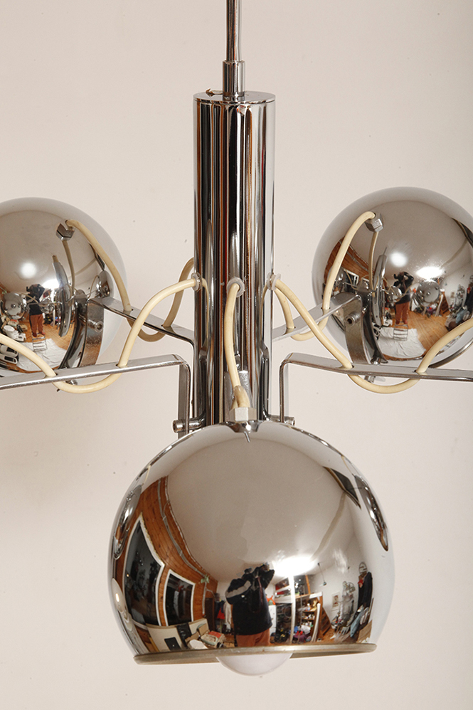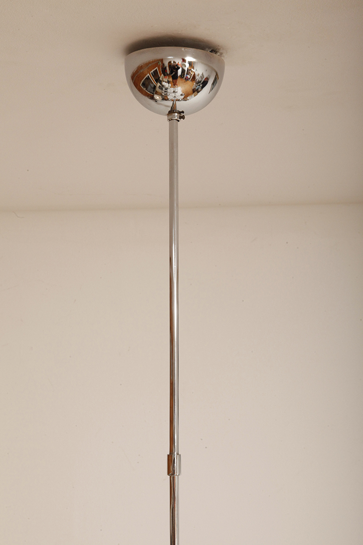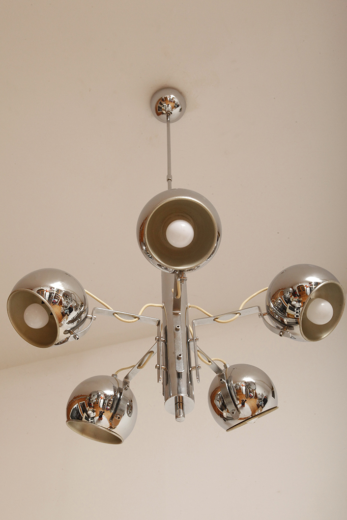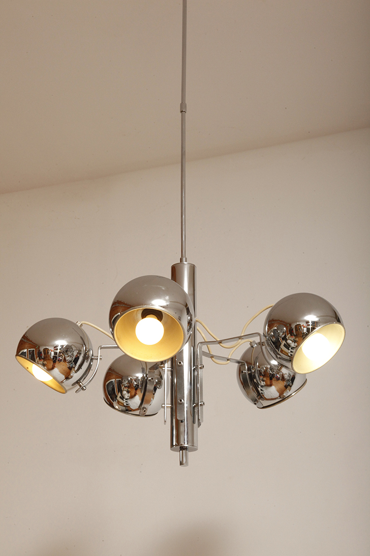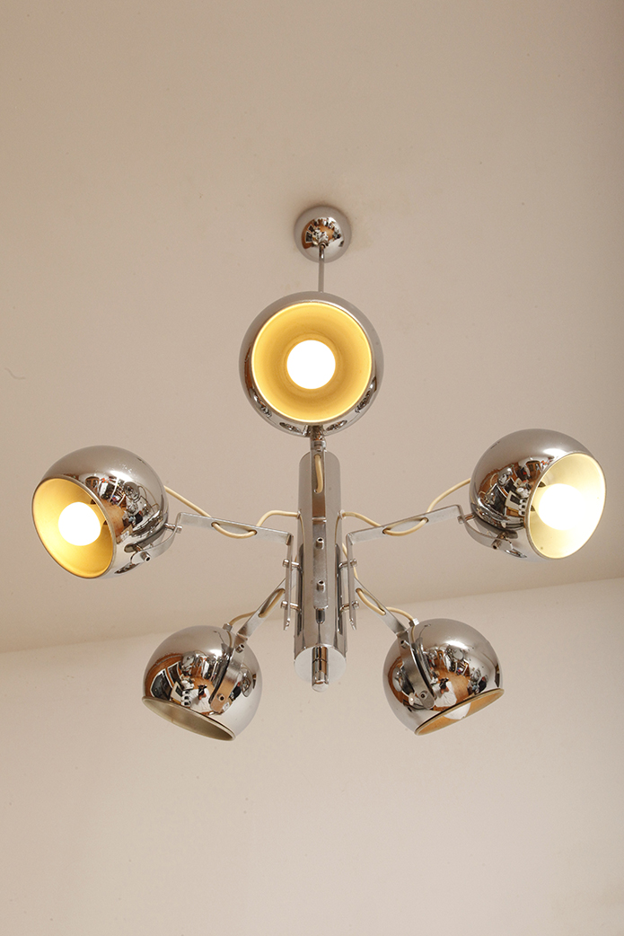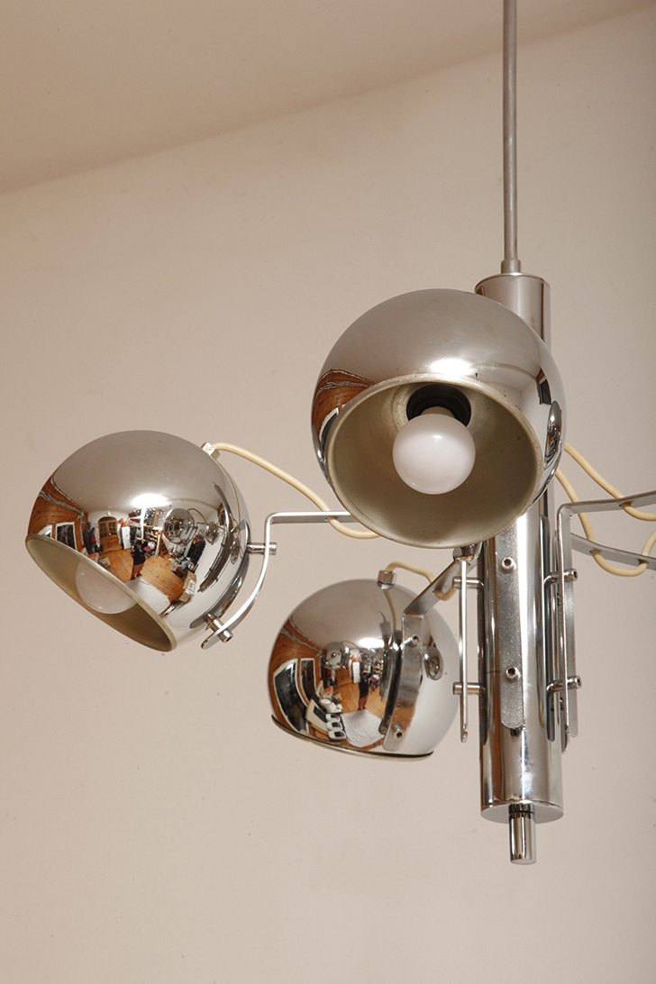 Rozłożysta cała metalowa długa pięciopunktowa chromowana lampa sufitowa z regulowaną długością zwisu, Space Age, Włochy, lata 60/70.