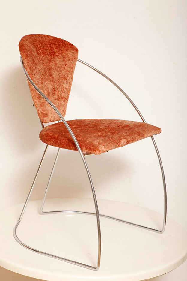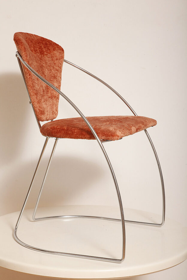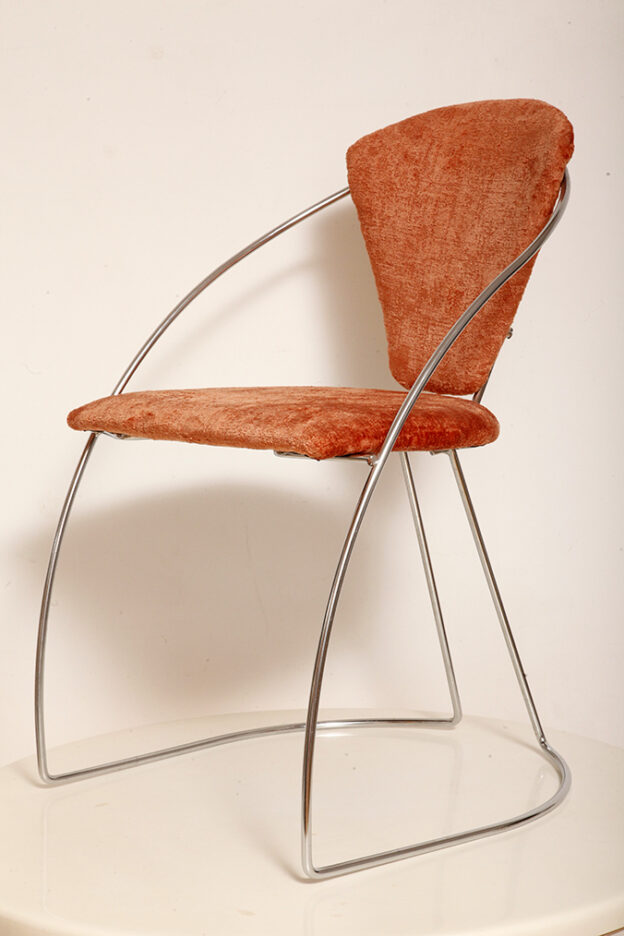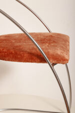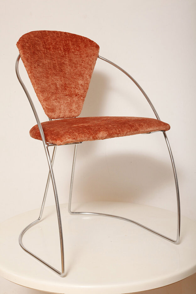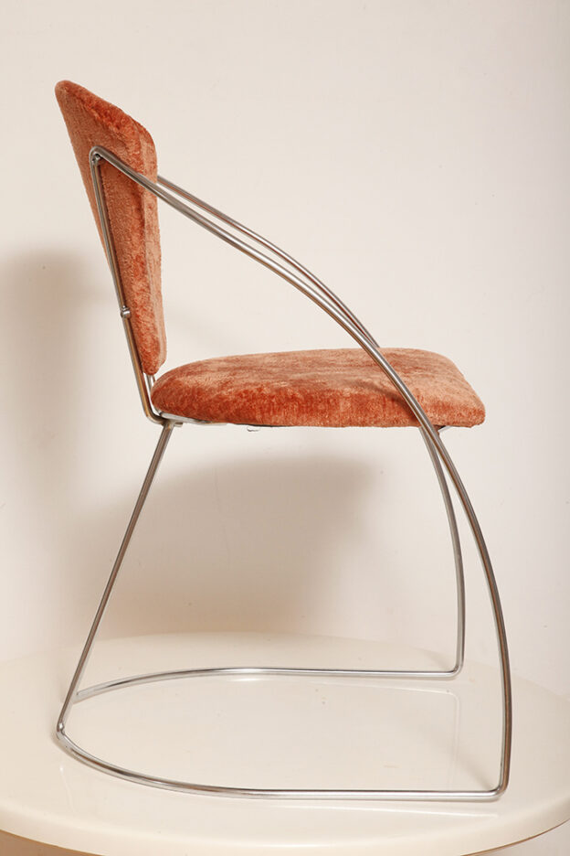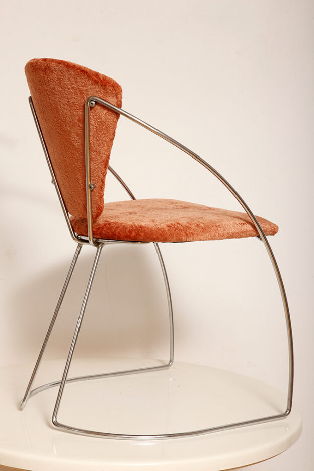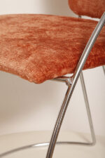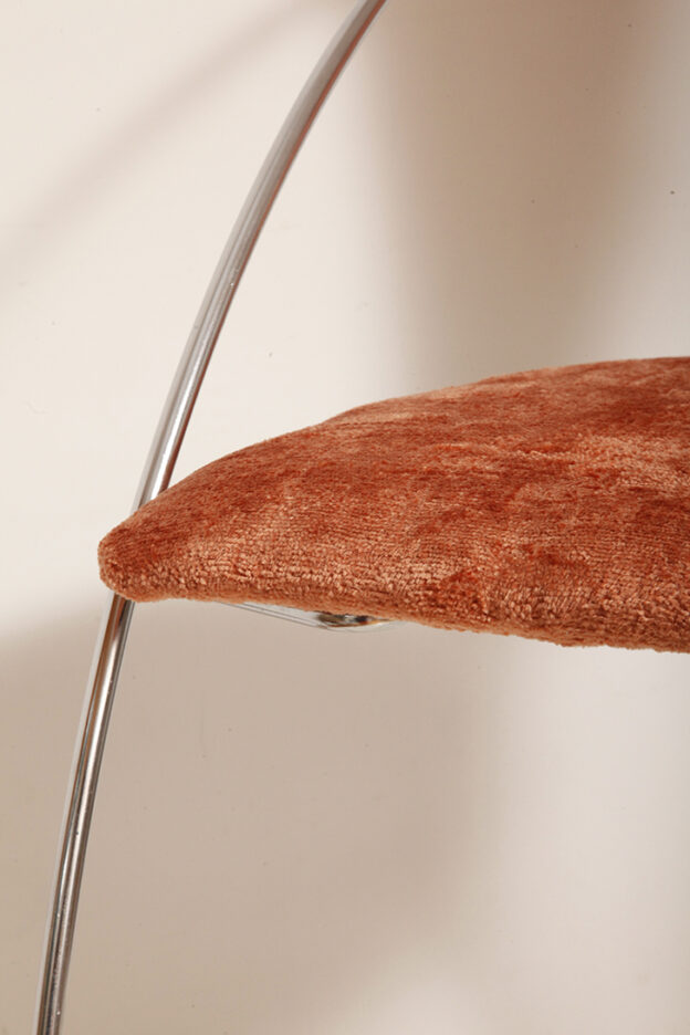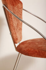 Stalowa chromowana konstrukcja + rudo morelowa mięsista tkanina zupełnie na nowo położona, czyli włoskie krzesła „Linda” firmy Arrben Italy z lat 80.