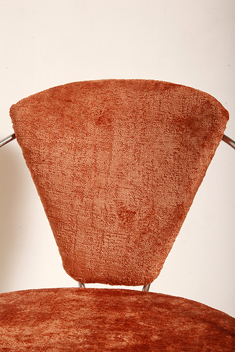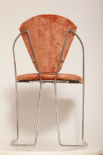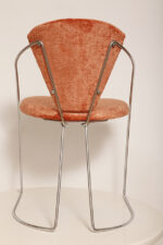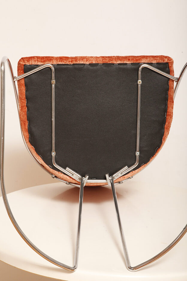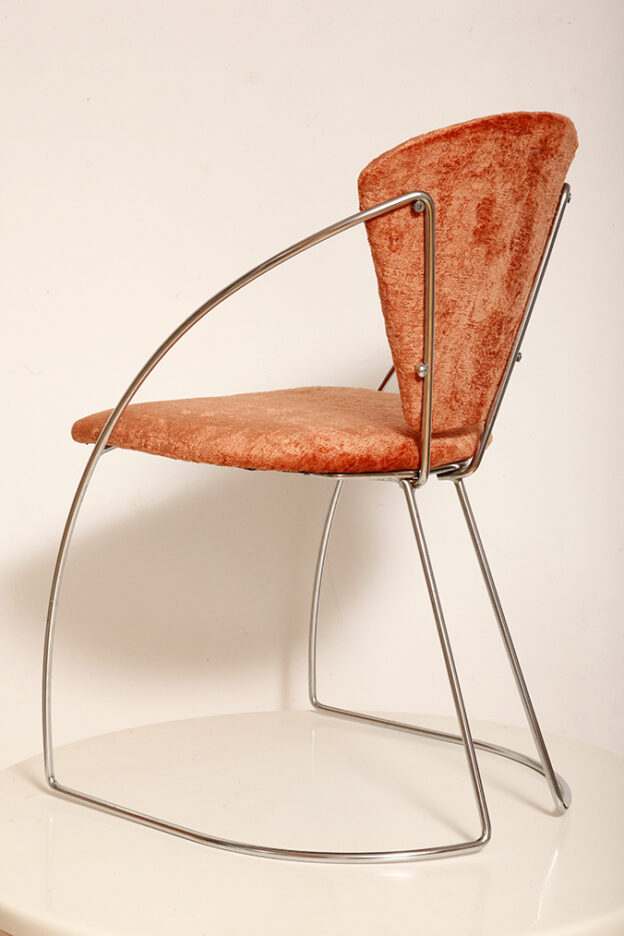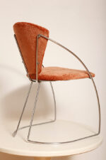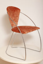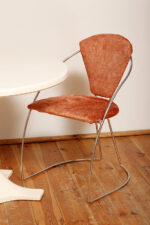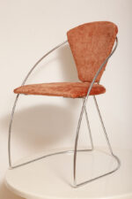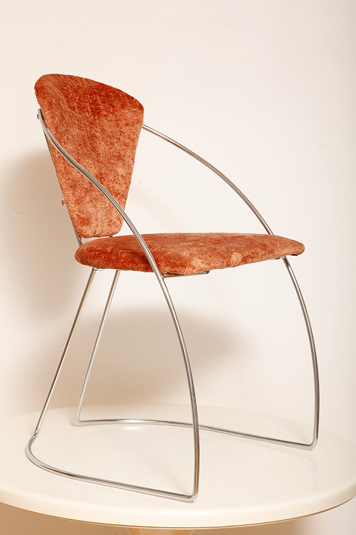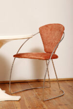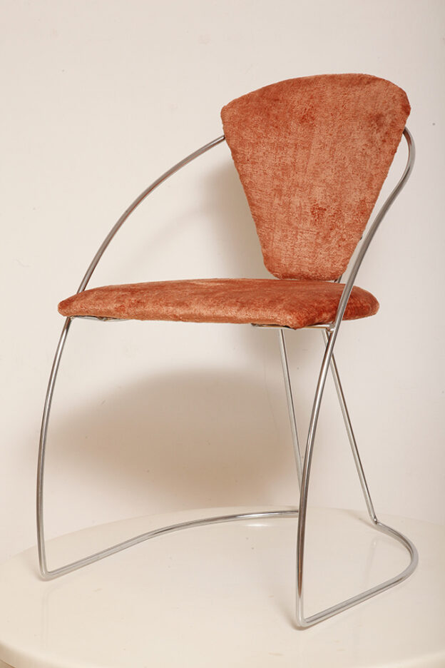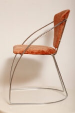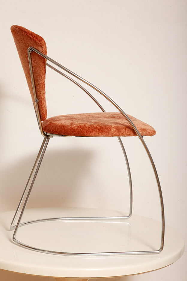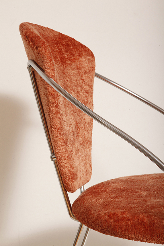 Stalowa chromowana konstrukcja + rudo morelowa mięsista tkanina zupełnie na nowo położona, czyli włoskie krzesła „Linda” firmy Arrben Italy z lat 80.
