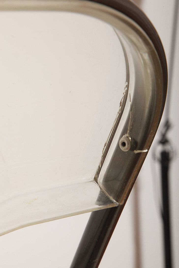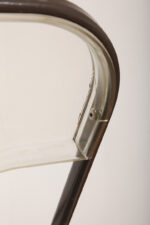 Stan dobry vintage, liczne powierzchniowe rysy użytkowe na siedzisku i oparciu co jest nieuniknione ze względu na użyty materiał. Jest stosunkowo miękki, przez co przyjemny w użytkowaniu, ale podatny na ząb czasu. W każdym razi nic spektakularnego. W zasadzie widać je tylko z bliska przy dokładnym oglądaniu. Lakierowana metalowa rama ma się podobnie. Co się dało pokazaliśmy.