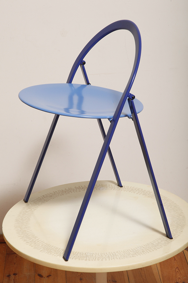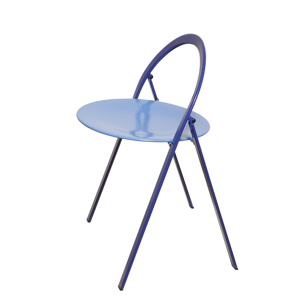 Składane metalowe krzesło „Clio” okrągłym granatowym siedziskiem i niebieskim oparciem i nogami, projekt Giorgio Cattelan dla firmy Cidue, Włochy, lata 70.