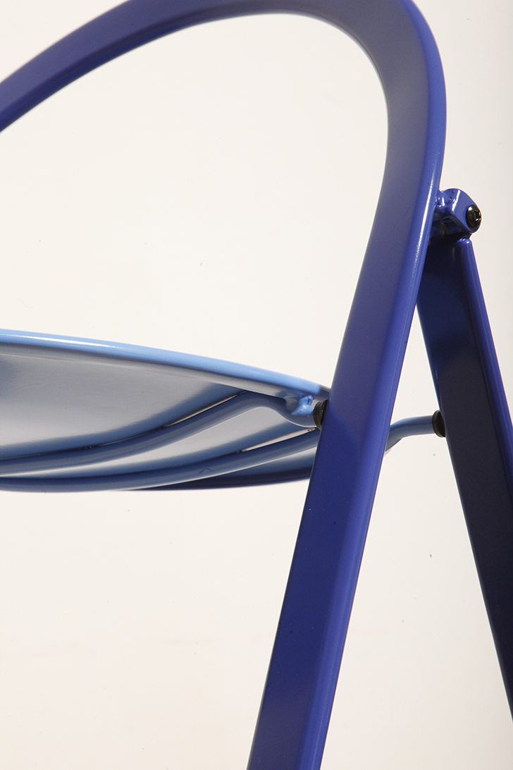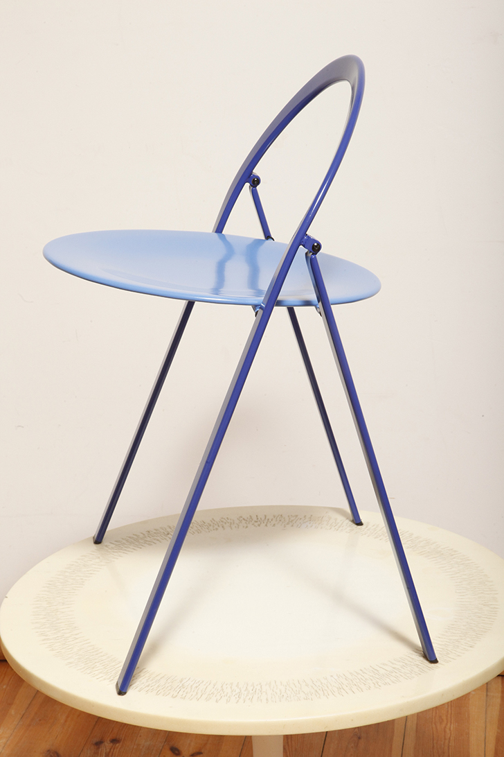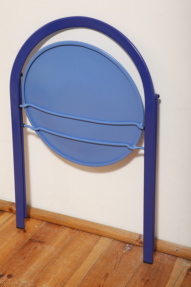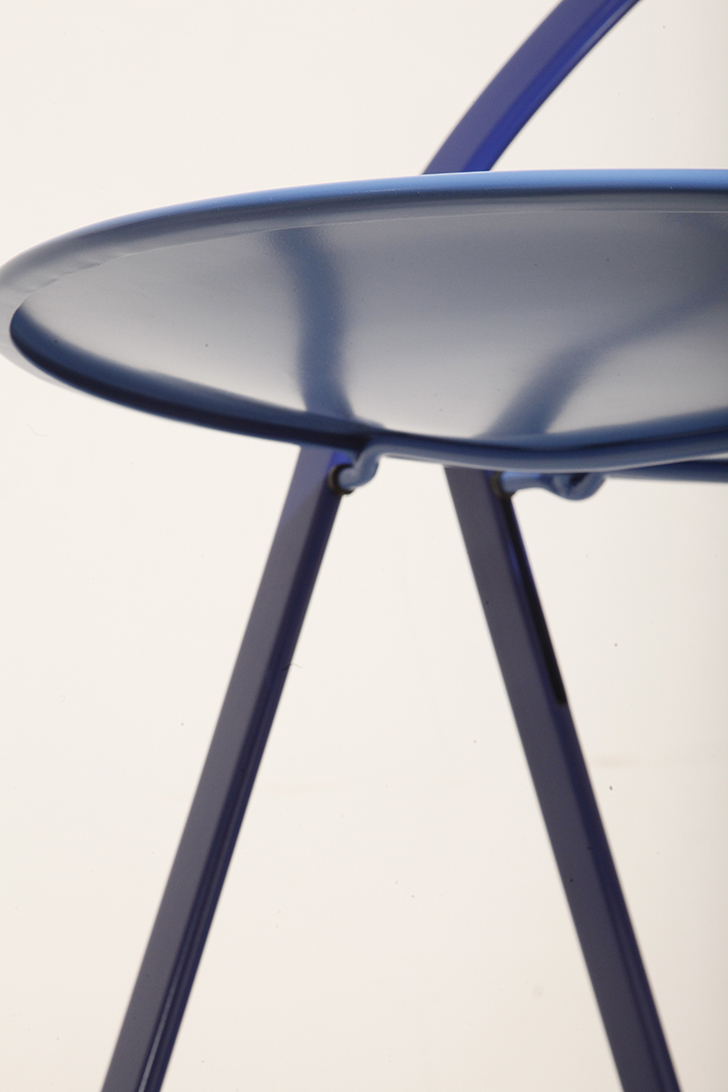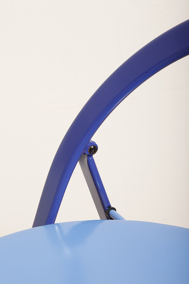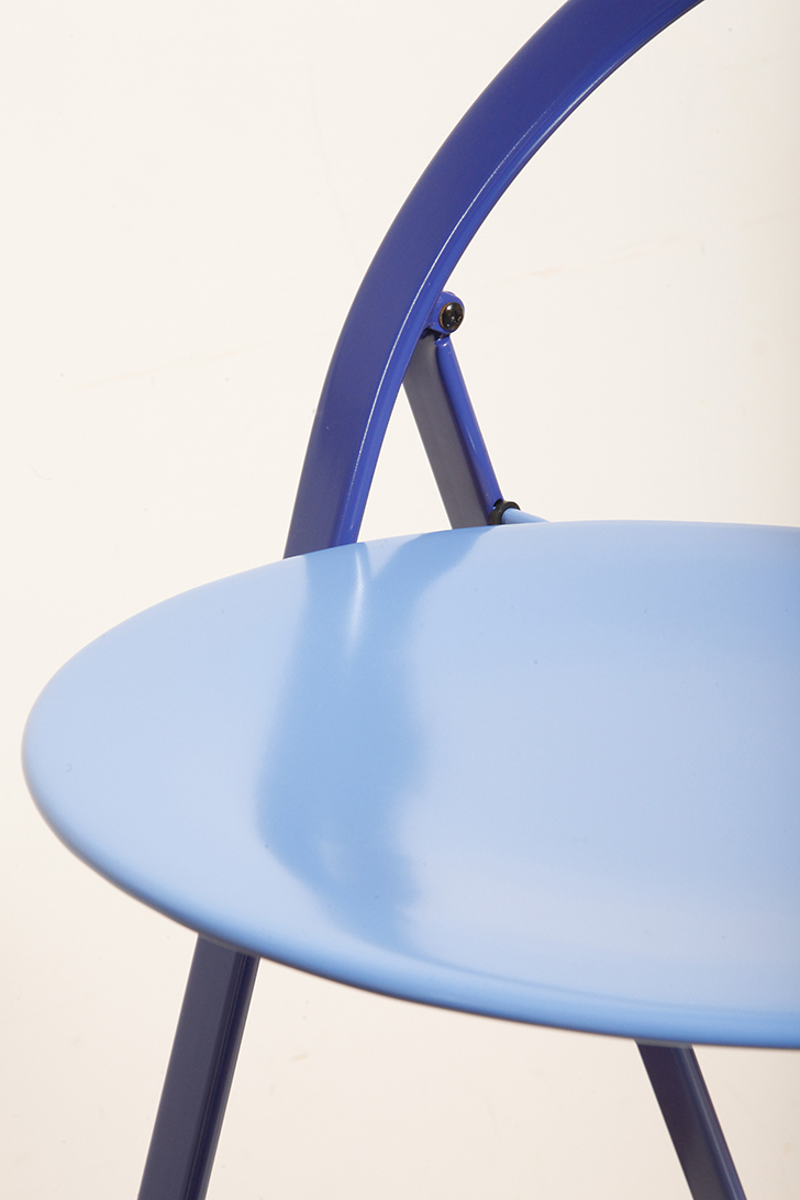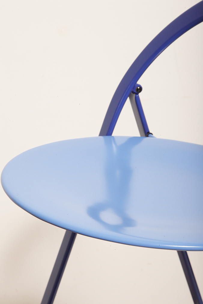 Składane metalowe krzesło „Clio” okrągłym lakierowanym w satynie niebieskim siedziskiem i granatowym oparciem i nogami, projekt Giorgio Cattelan dla firmy Cidue, Włochy, lata 70.