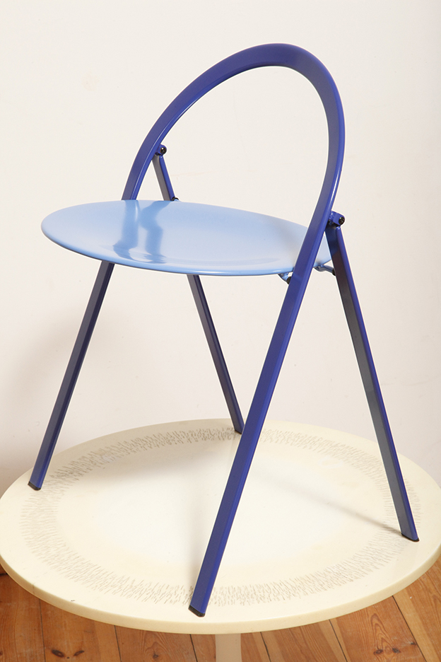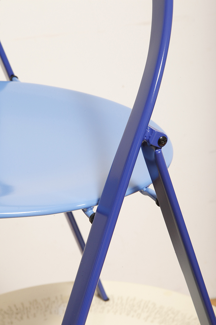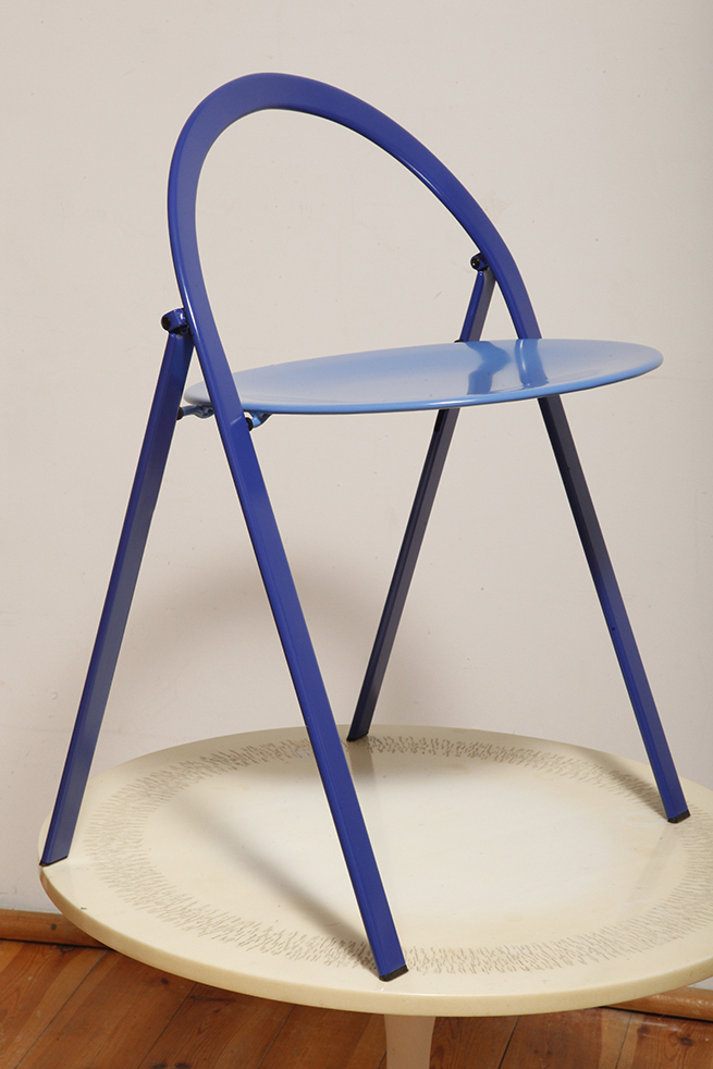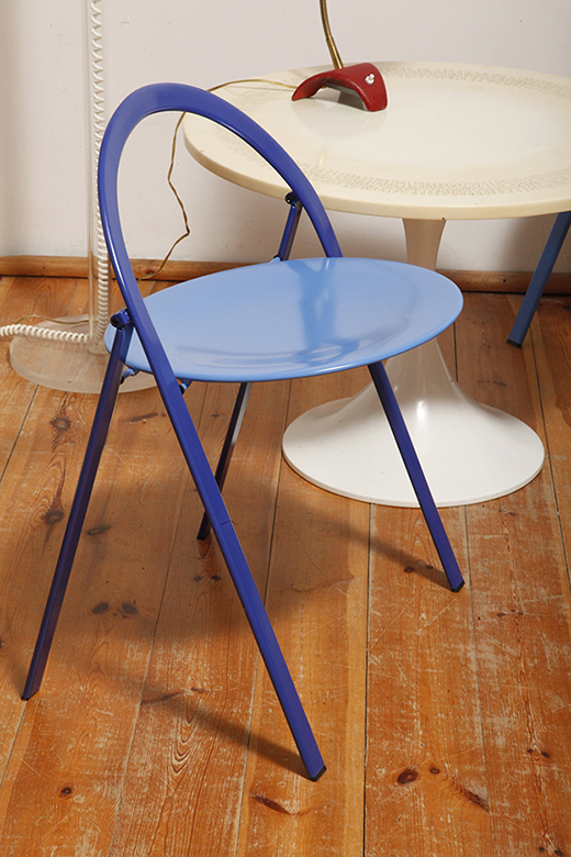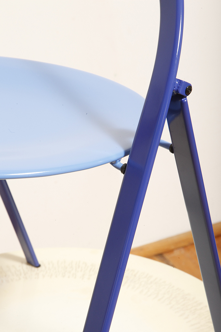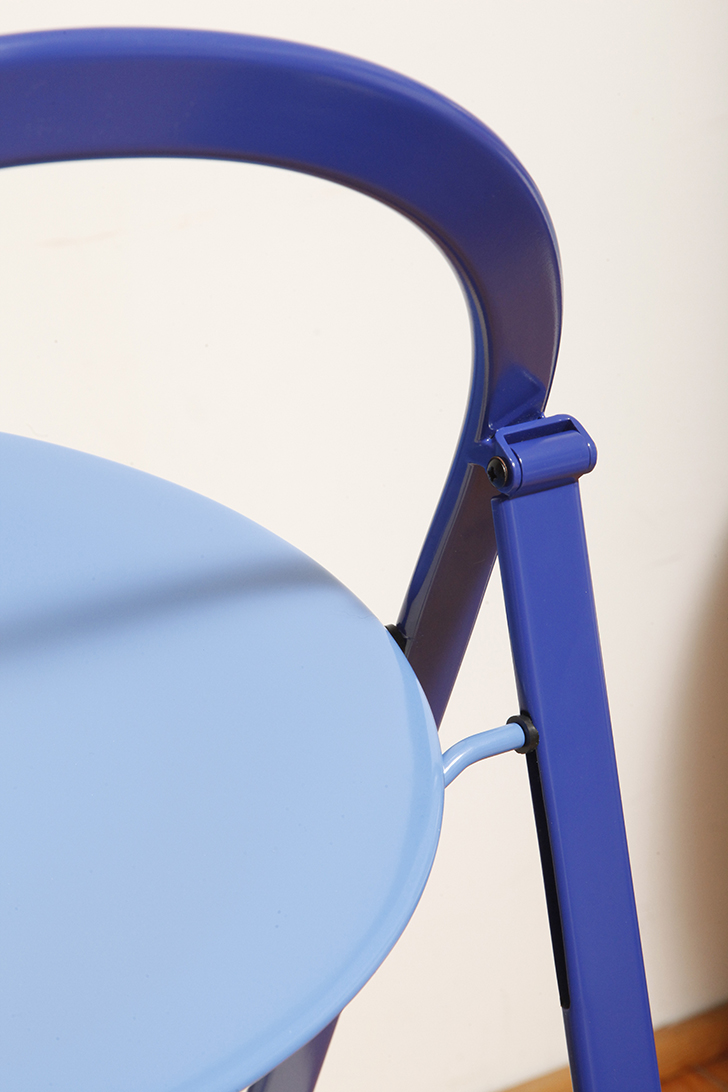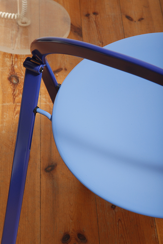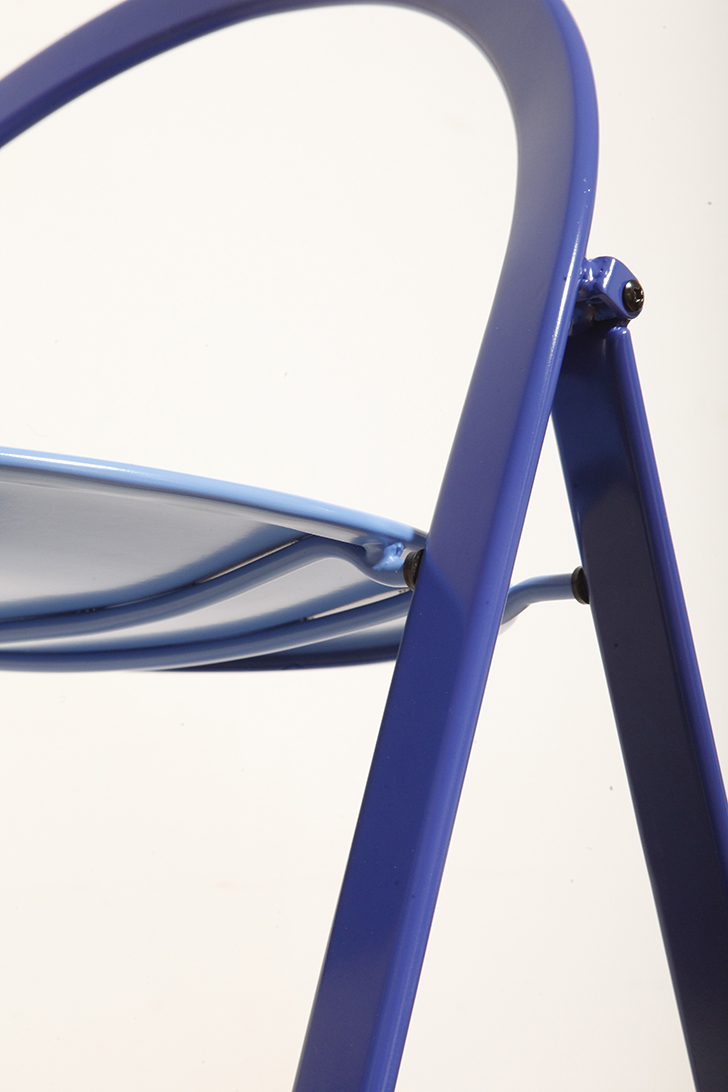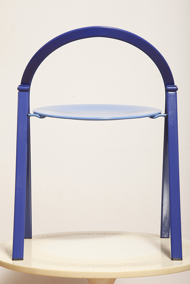 Składane metalowe krzesło „Clio” okrągłym lakierowanym w satynie niebieskim siedziskiem i granatowym oparciem i nogami, projekt Giorgio Cattelan dla firmy Cidue, Włochy, lata 70.