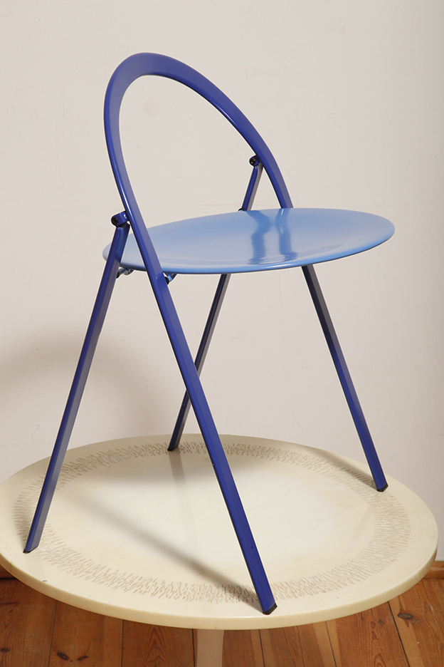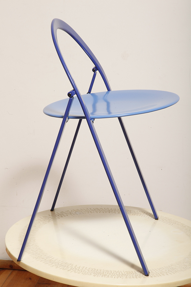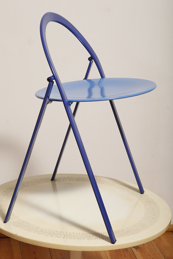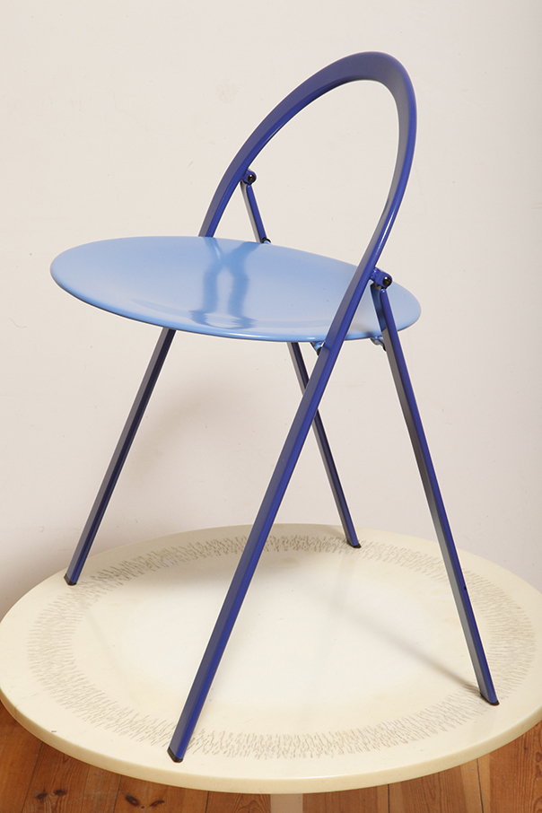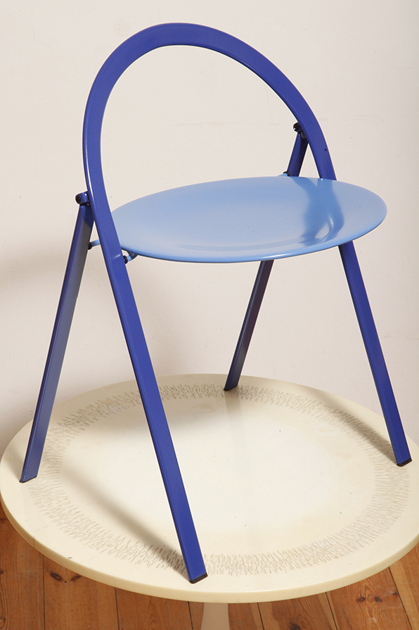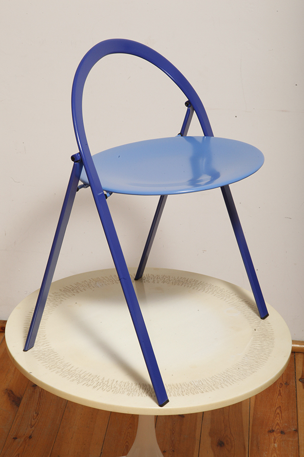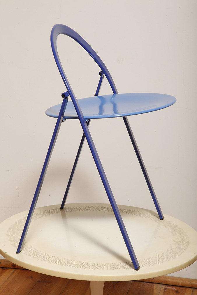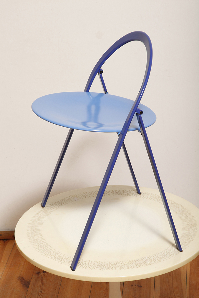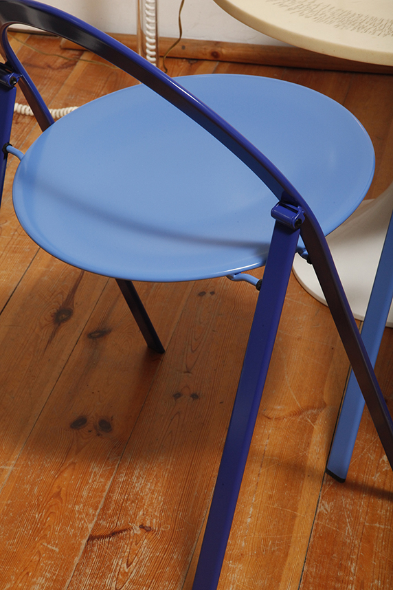Składane metalowe krzesło „Clio” okrągłym lakierowanym w satynie niebieskim siedziskiem i granatowym oparciem i nogami, projekt Giorgio Cattelan dla firmy Cidue, Włochy, lata 70.