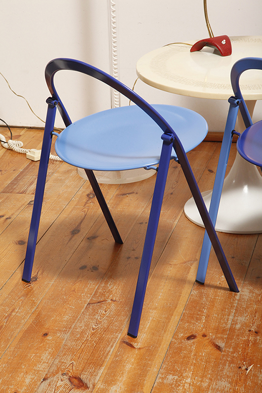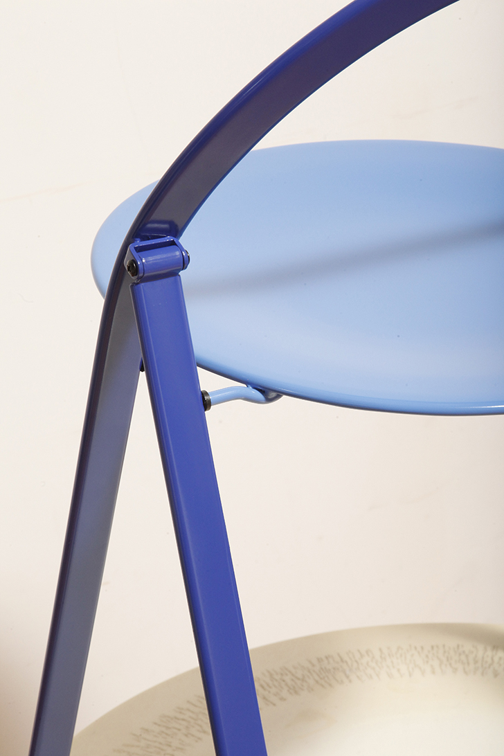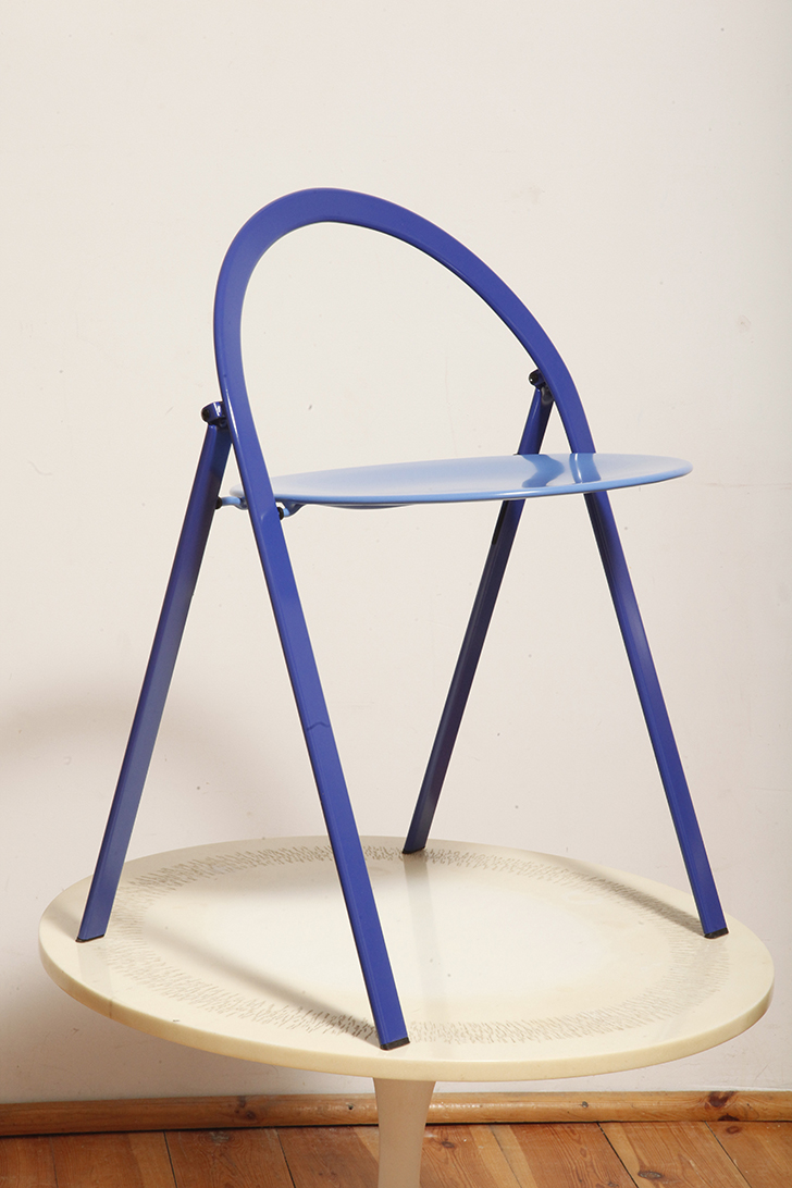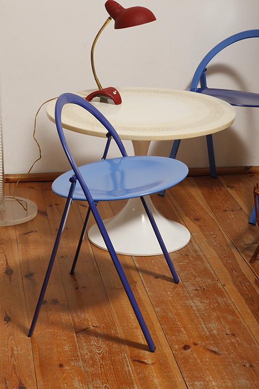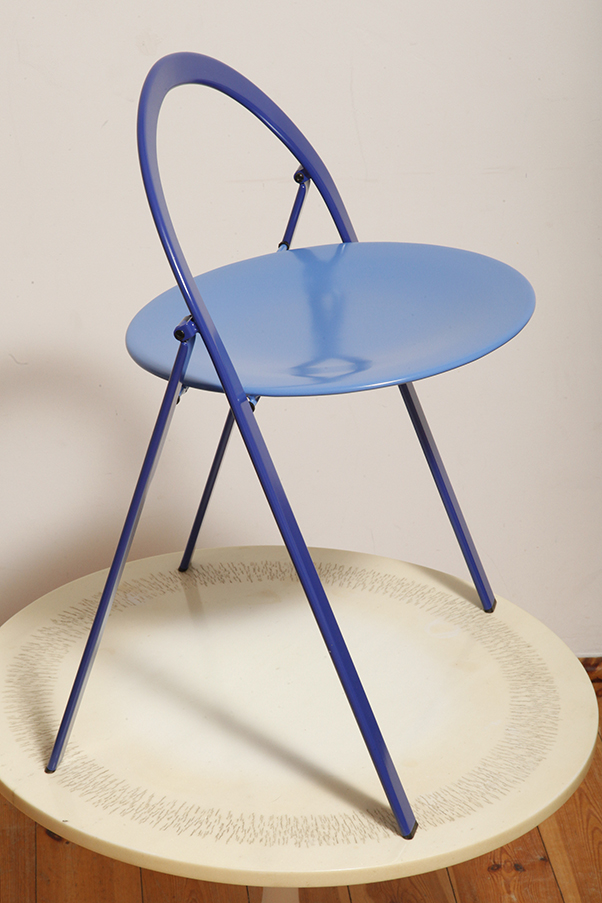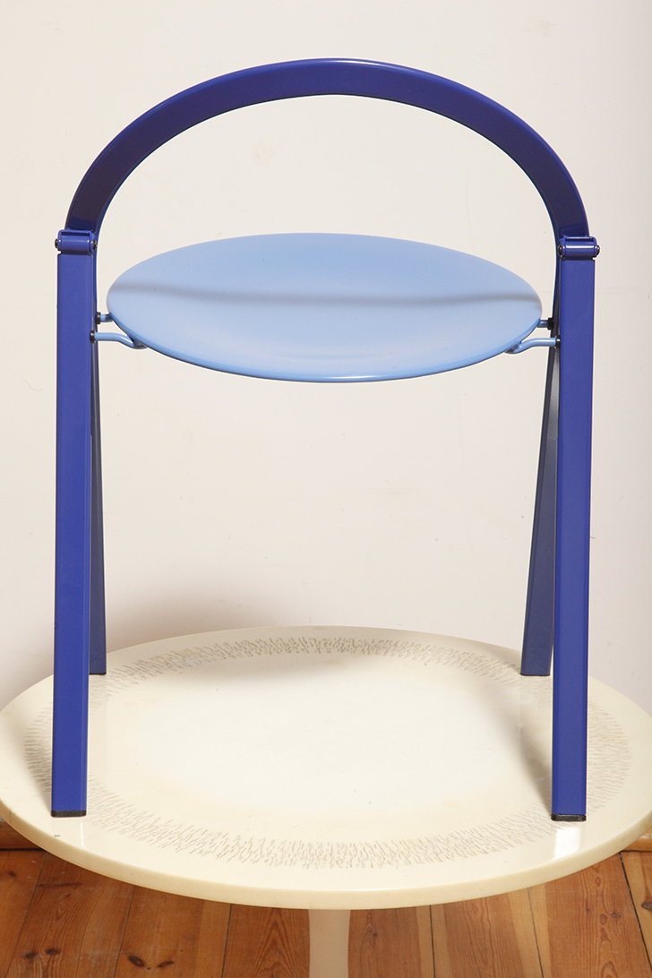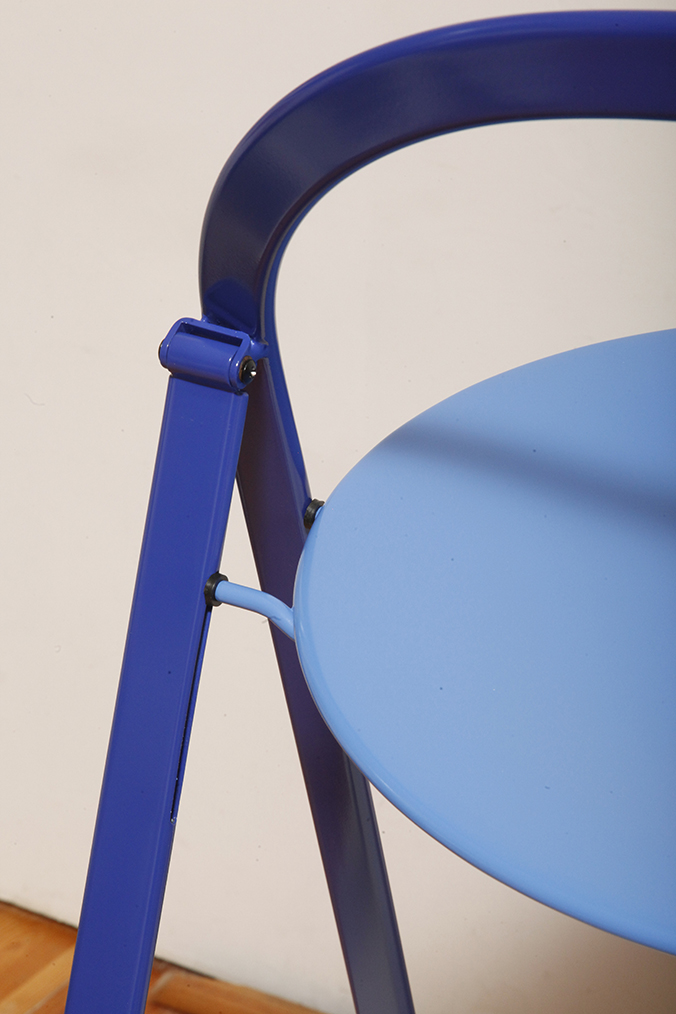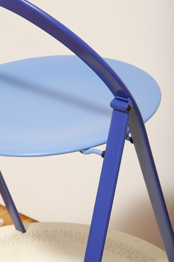 Składane metalowe krzesło „Clio” okrągłym lakierowanym w satynie niebieskim siedziskiem i granatowym oparciem i nogami, projekt Giorgio Cattelan dla firmy Cidue, Włochy, lata 70.