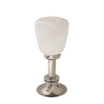 Lampa efektowna swą nienachalną elegancją, że tak to ujmę. Czyli szkło und metal, Czyli szkło und metal, a ściśle mówiąc z metalową polerowaną podstawą i szklanym kloszem częściowo transparentnym, częściowo w niesymetryczny sposób mleczno białym.