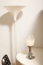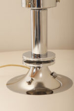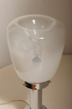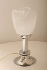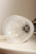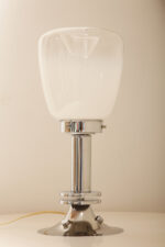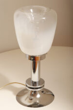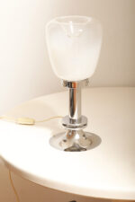 Smukła jednopunktowa lampa biurkowa/nocna/stołowa ze szklanym mleczno białym półprzezroczystym kloszem i metalową polerowaną podstawą, Włochy, lata 70.