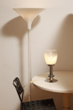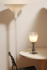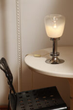 Lampa efektowna swą nienachalną elegancją, że tak to ujmę. Czyli szkło und metal, a ściśle mówiąc z metalową polerowaną podstawą i szklanym kloszem częściowo transparentnym, częściowo w niesymetryczny sposób mleczno białym.