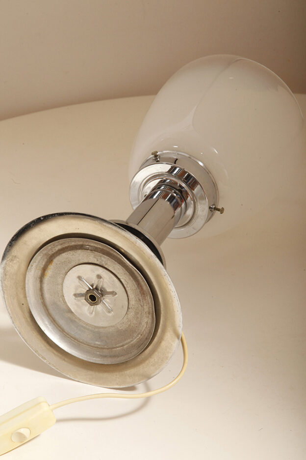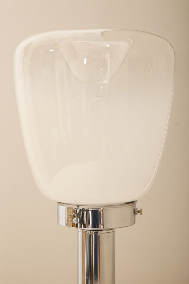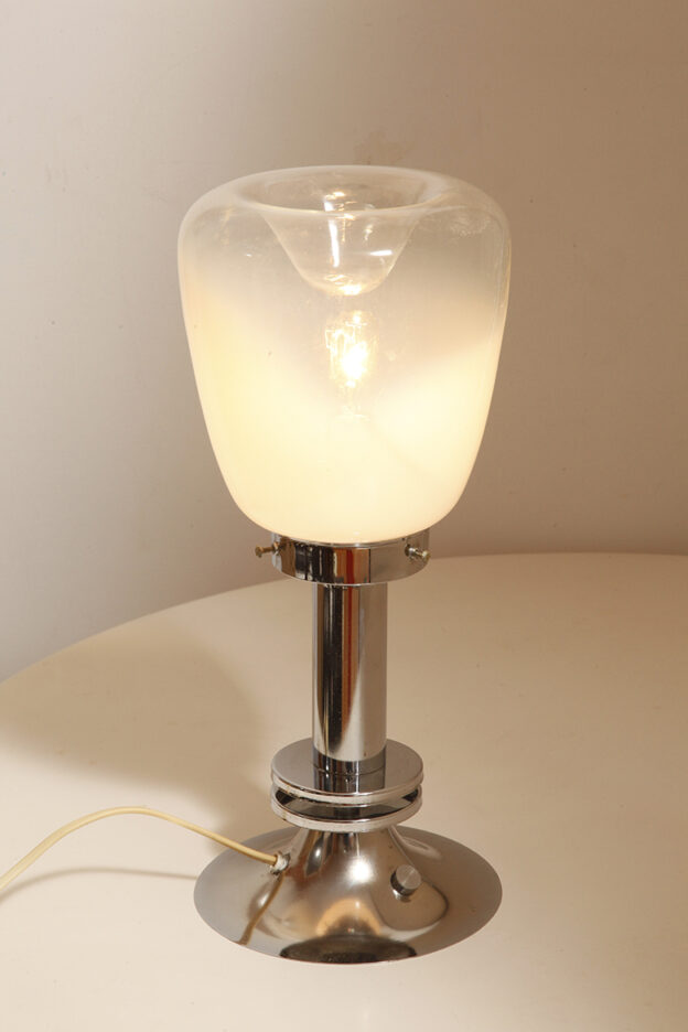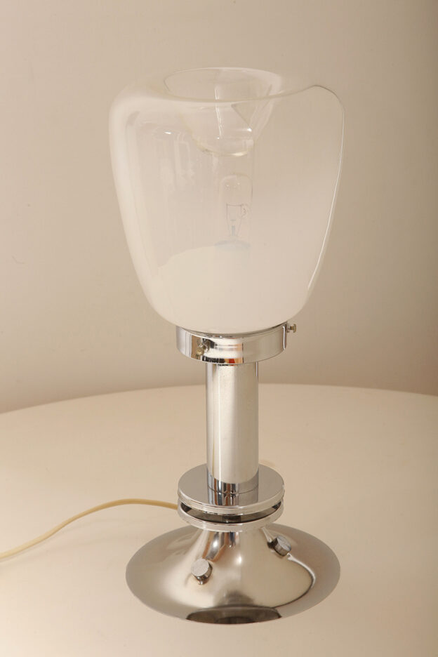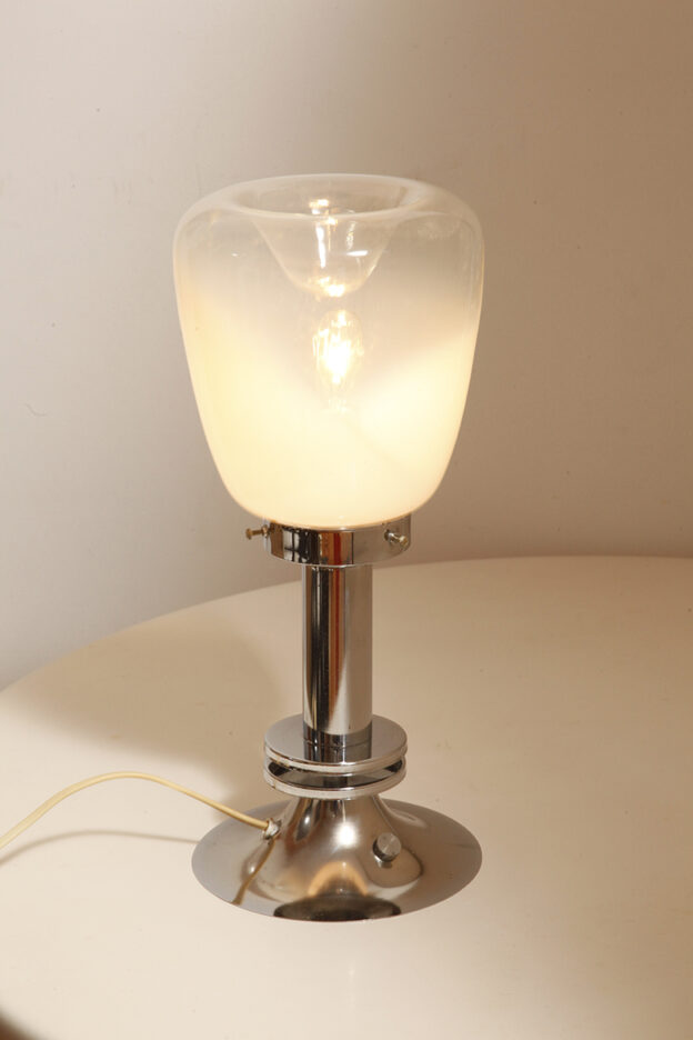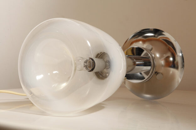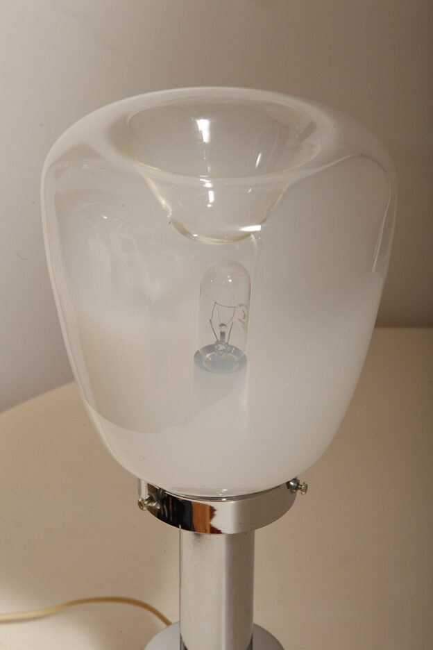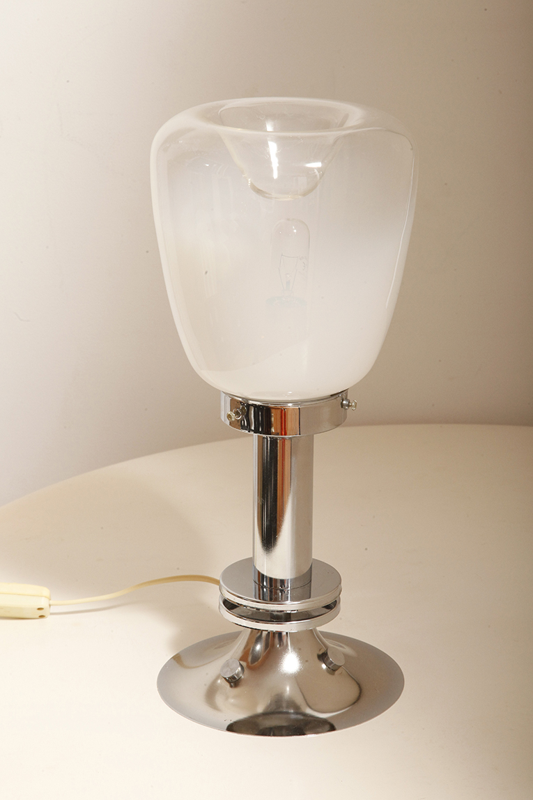 Smukła jednopunktowa lampa biurkowa/nocna/stołowa ze szklanym mleczno białym półprzezroczystym kloszem i metalową polerowaną podstawą, Włochy, lata 70.