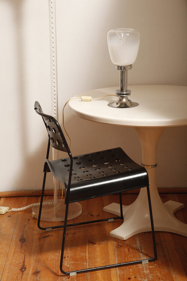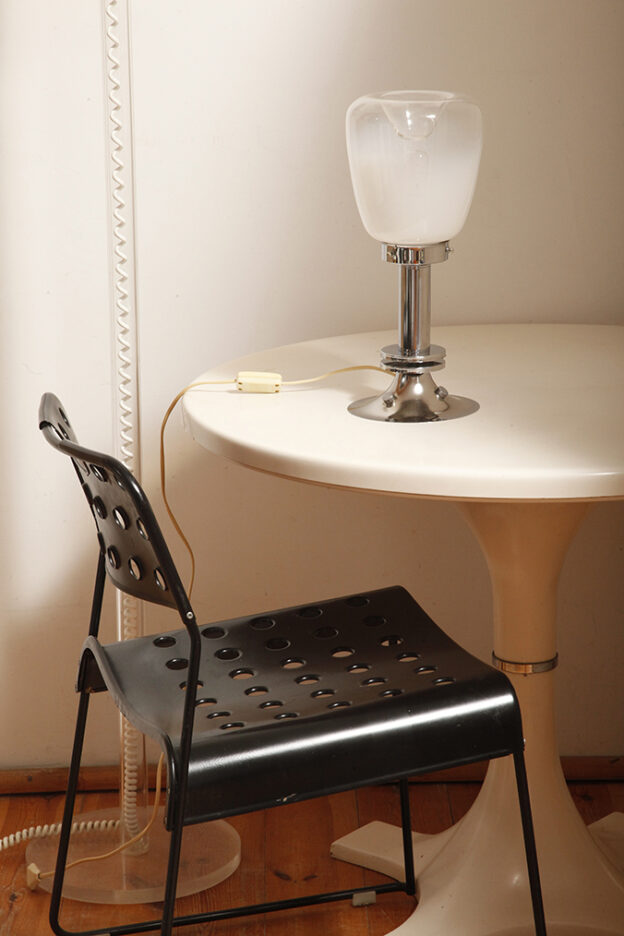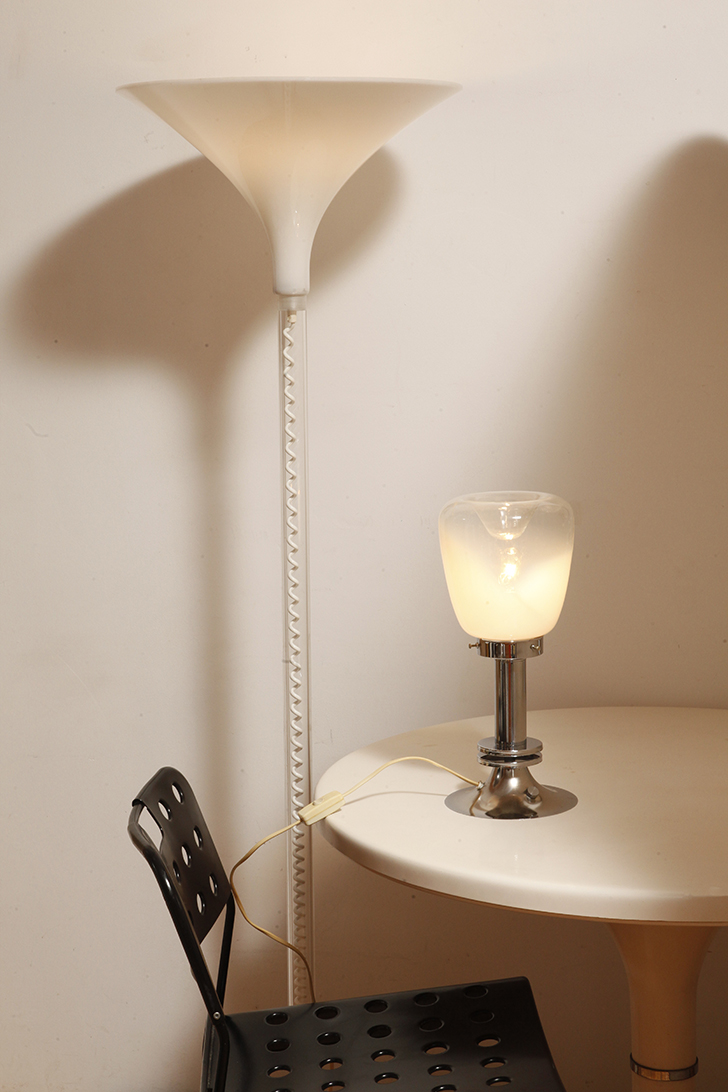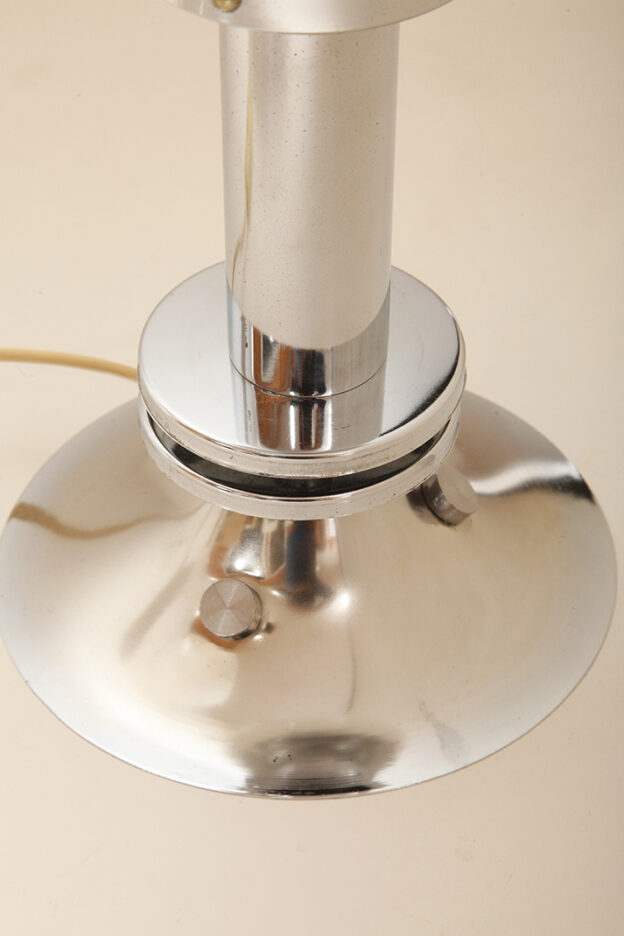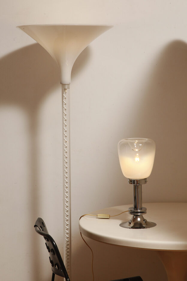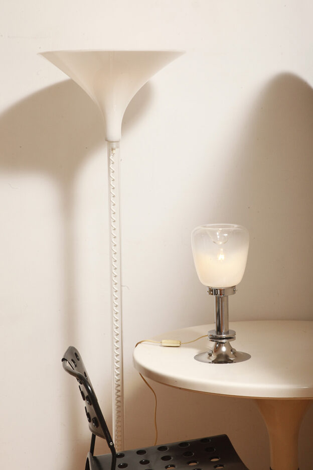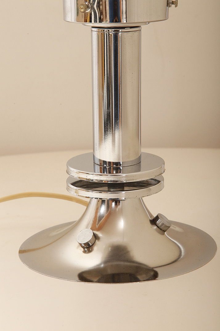 Smukła jednopunktowa lampa biurkowa/nocna/stołowa ze szklanym mleczno białym półprzezroczystym kloszem i metalową polerowaną podstawą, Włochy, lata 70.
