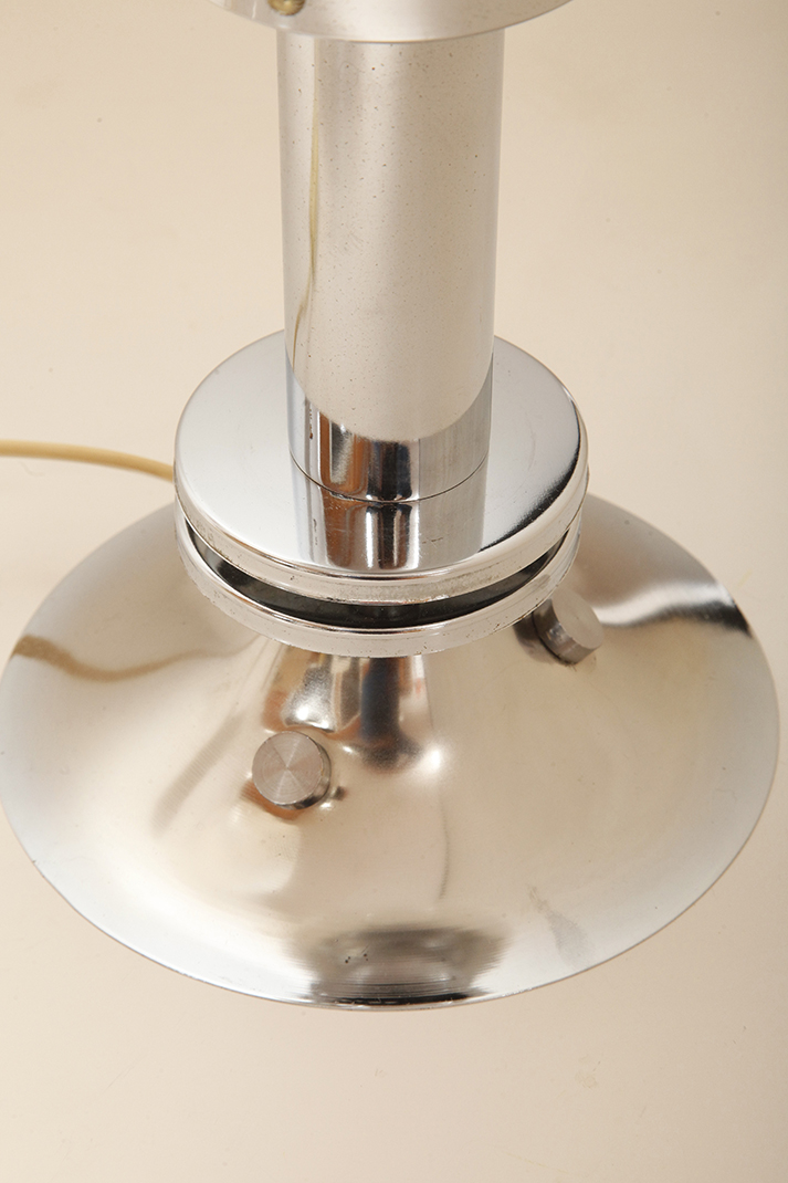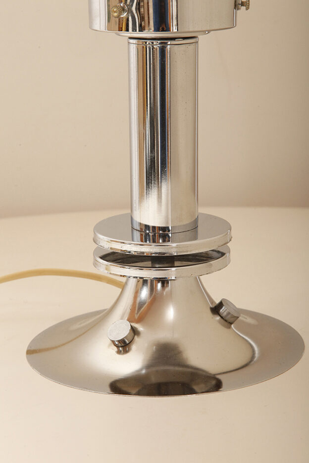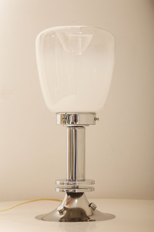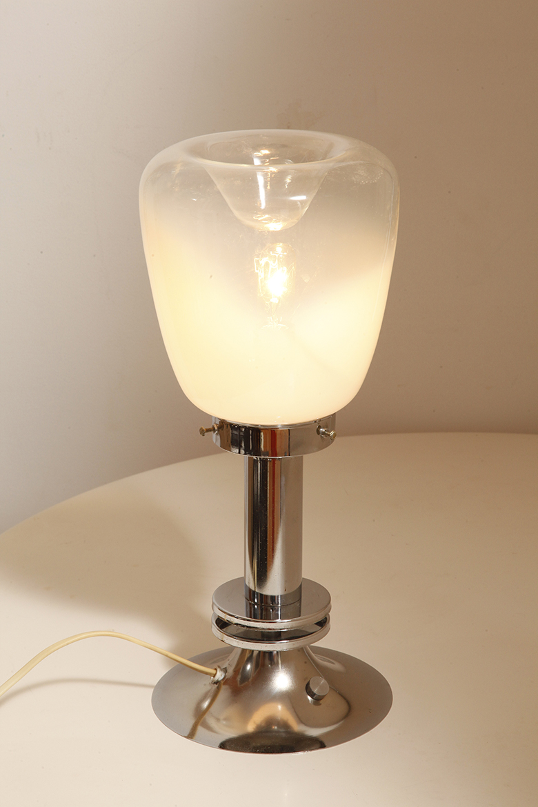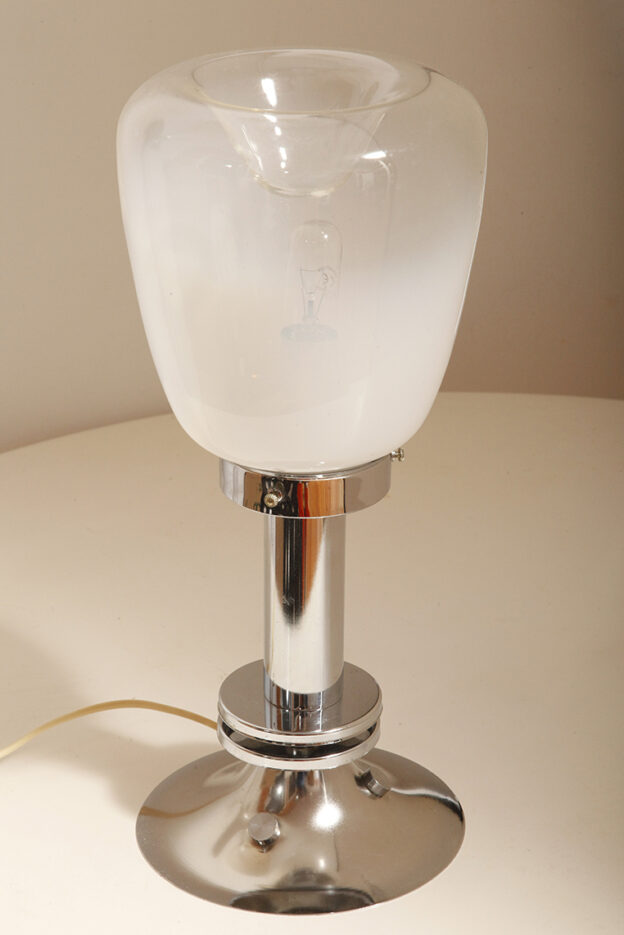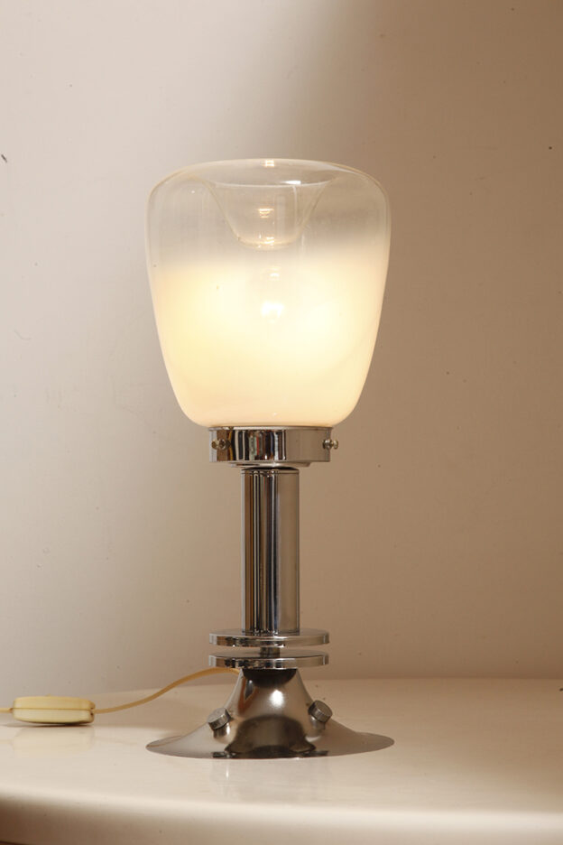 Lampa efektowna swą nienachalną elegancją, że tak to ujmę. Czyli szkło und metal, Czyli szkło und metal, a ściśle mówiąc z metalową polerowaną podstawą i szklanym kloszem częściowo transparentnym, częściowo w niesymetryczny sposób mleczno białym.