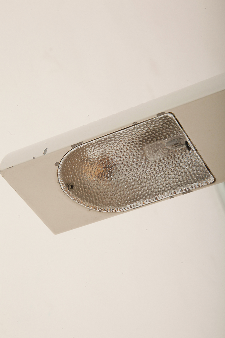 Zachowana w dobrym stanie vintage, sprawdzona elektrycznie. Drobne punktowe, użytkowe obtarcia białego lakieru pokazaliśmy na zdjęciach. Jedno nieduże przetarcie na czarnej okrągłej podstawie. Wszystko to niknie w jej przejrzystej nieprzegadanej bryle gdy stanie już na swoim miejscu.