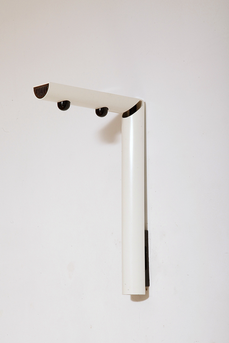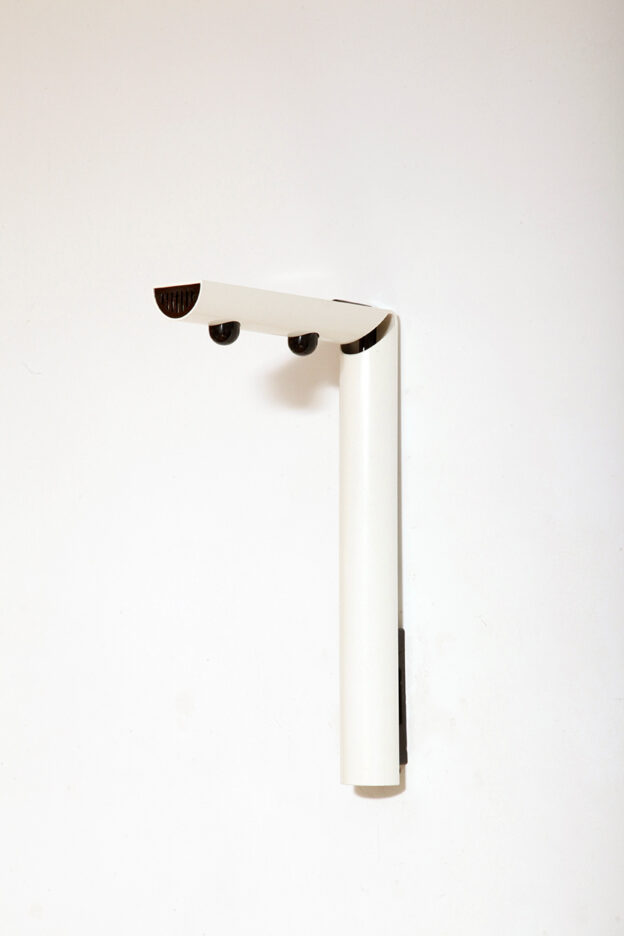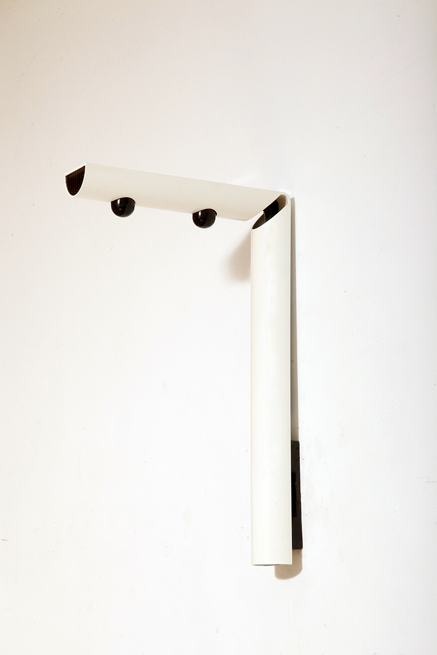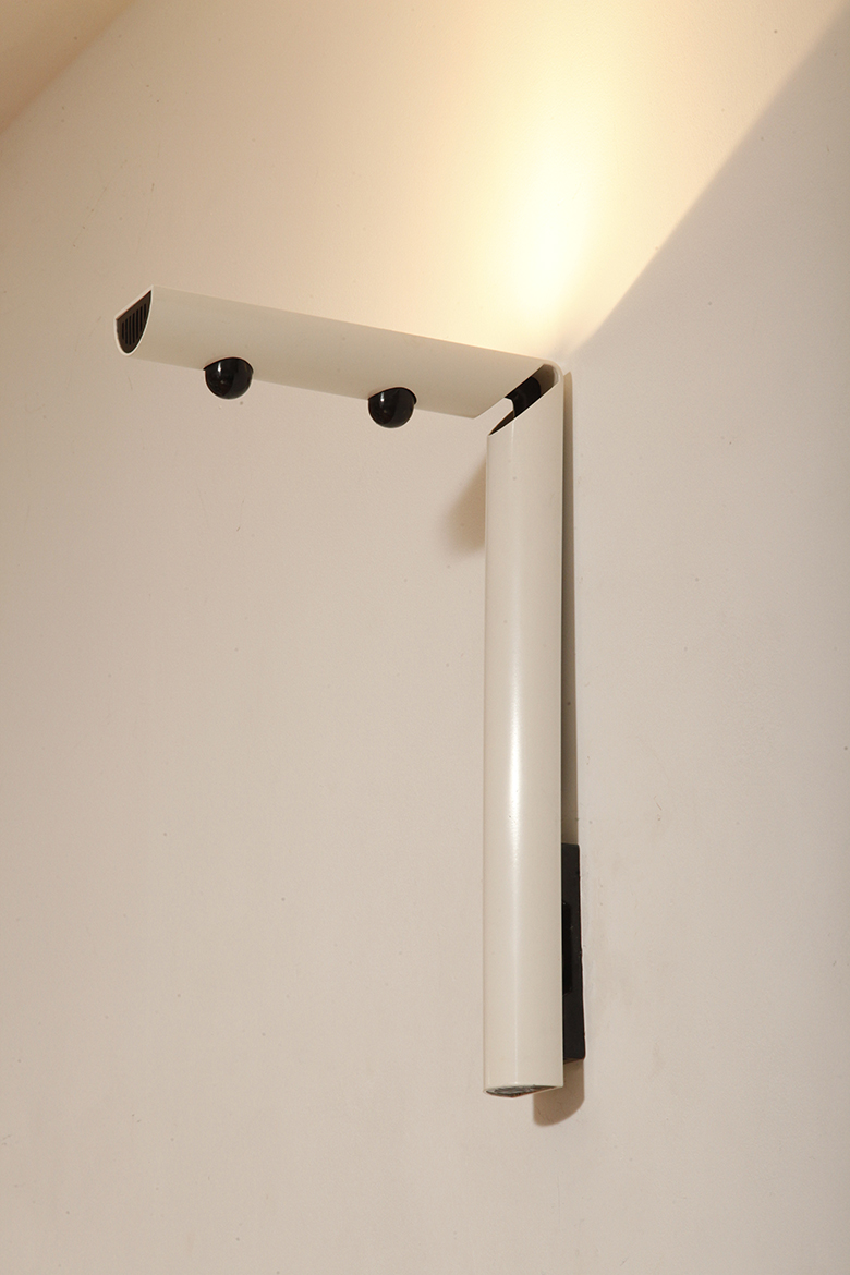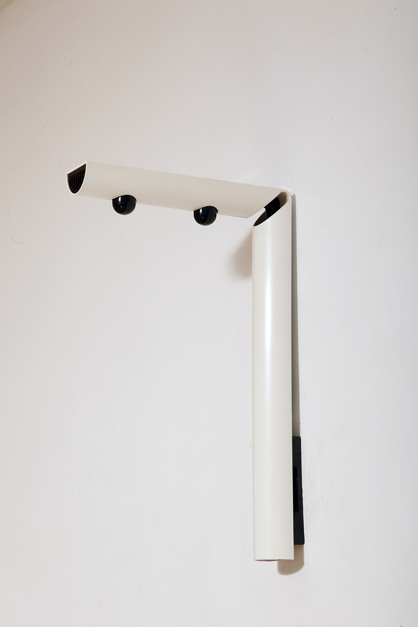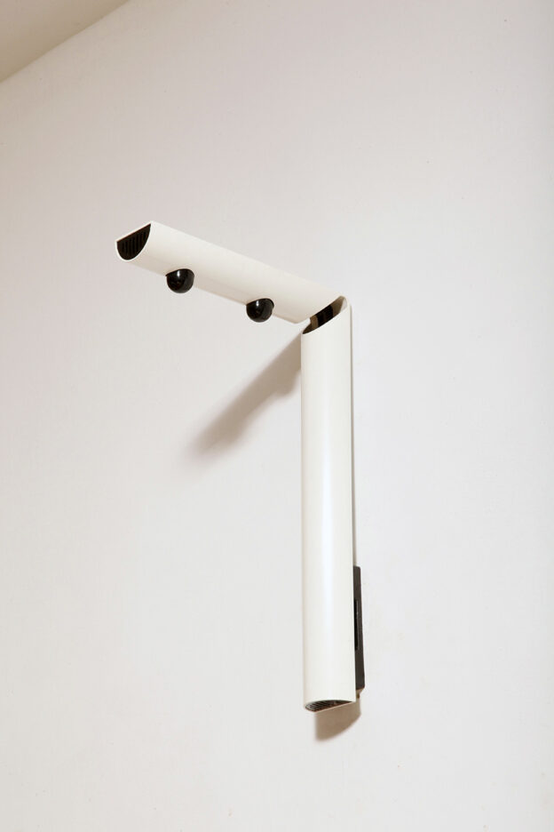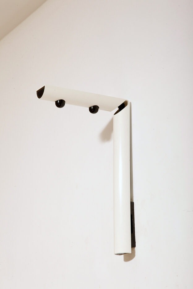Smukły biały z czarnymi dodatkami minimalistyczny metalowy kinkiet/lampa ścienna „Daniela” w kształcie odwróconej litery „L”, projekt Gianfranco Frattini dla firmy Luci, Włochy, lata 80.