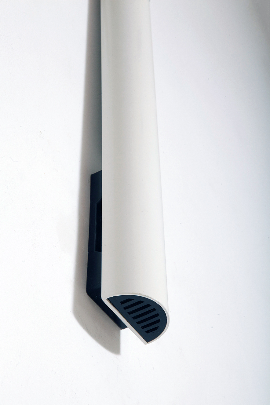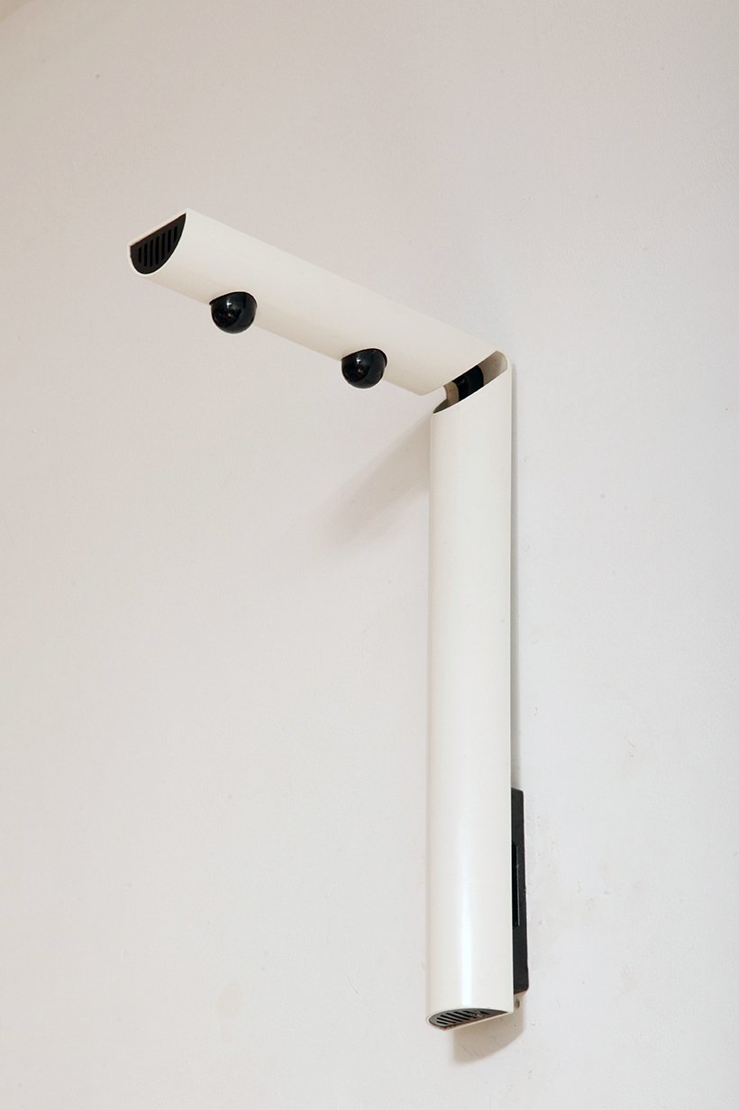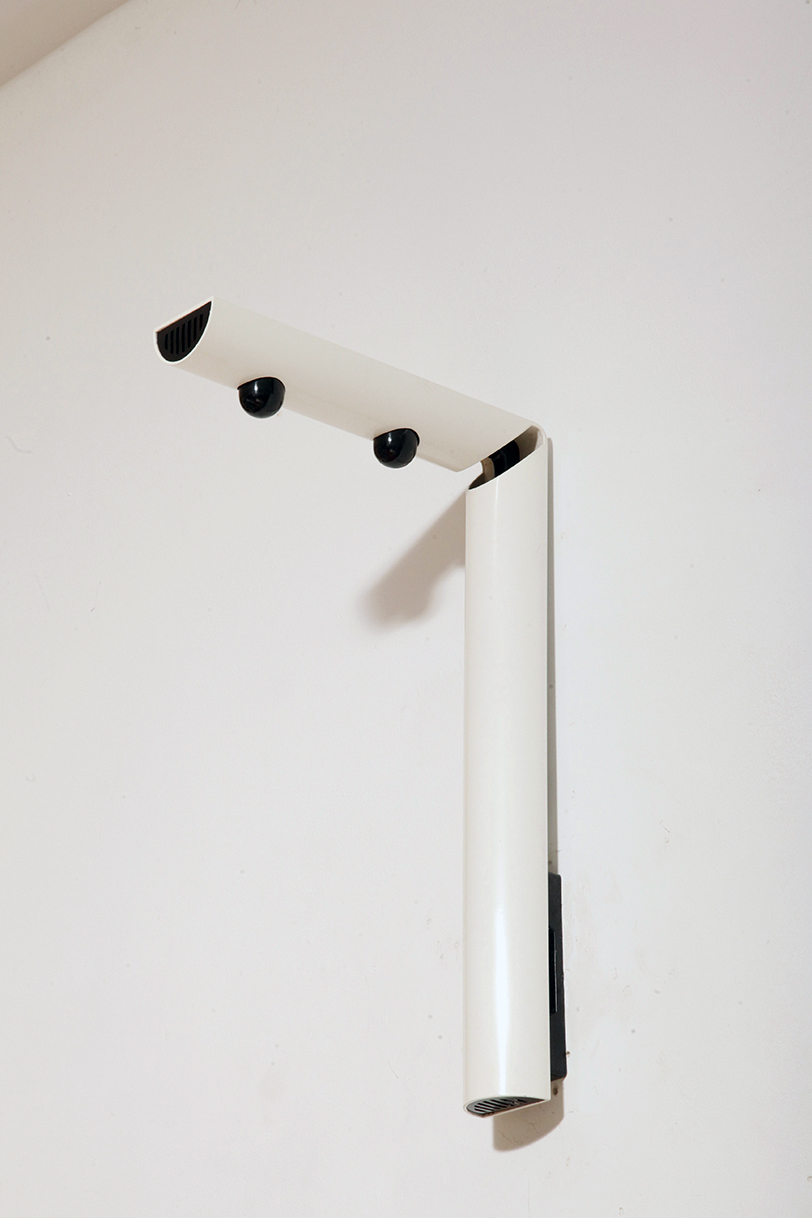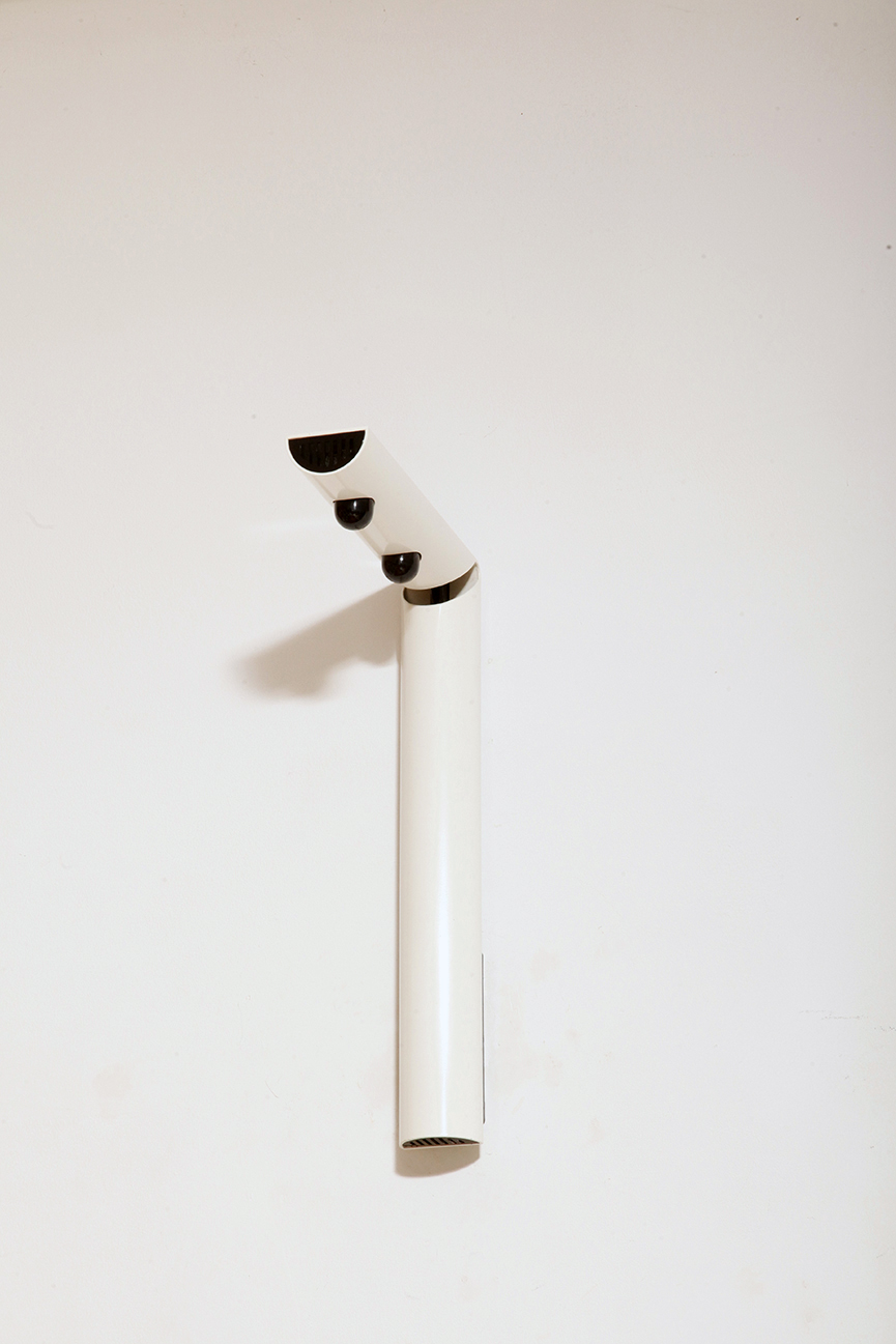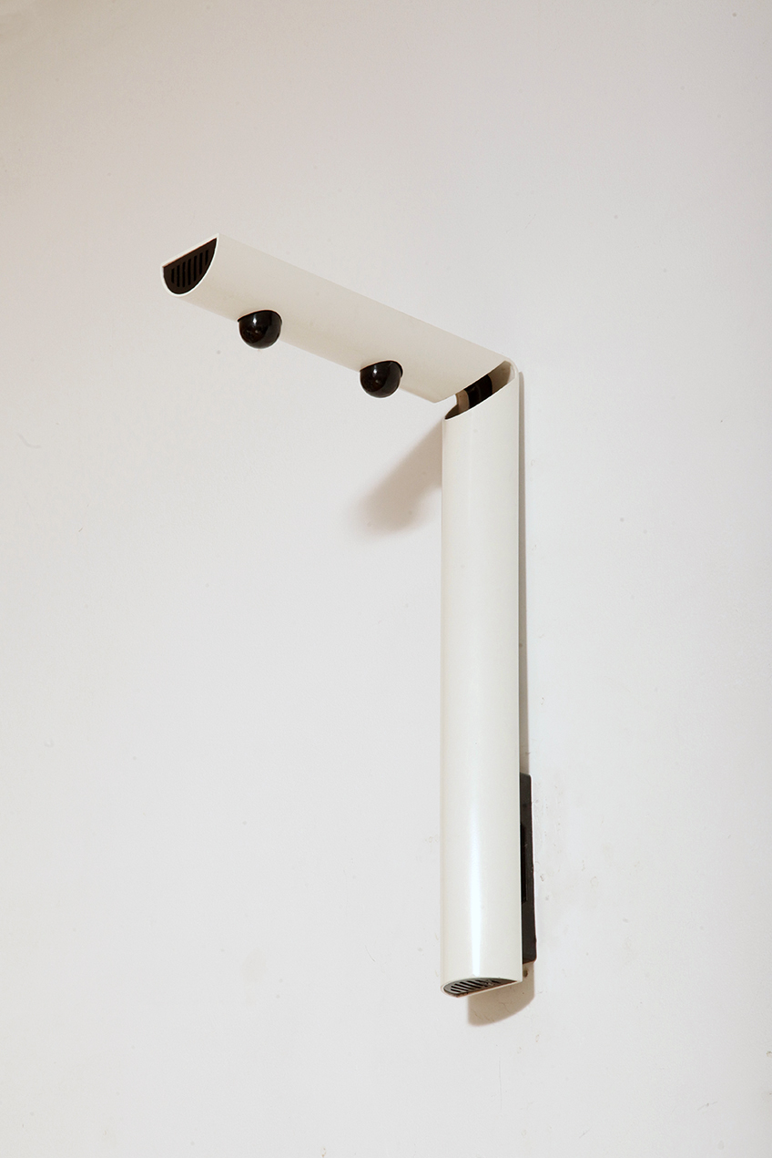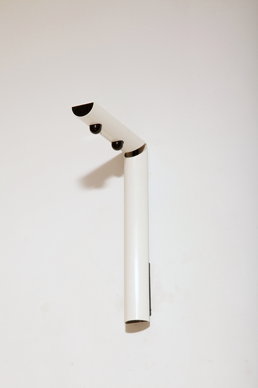 Smukły biały z czarnymi dodatkami minimalistyczny metalowy kinkiet/lampa ścienna „Daniela” w kształcie odwróconej litery „L”, projekt Gianfranco Frattini dla firmy Luci, Włochy, lata 80.