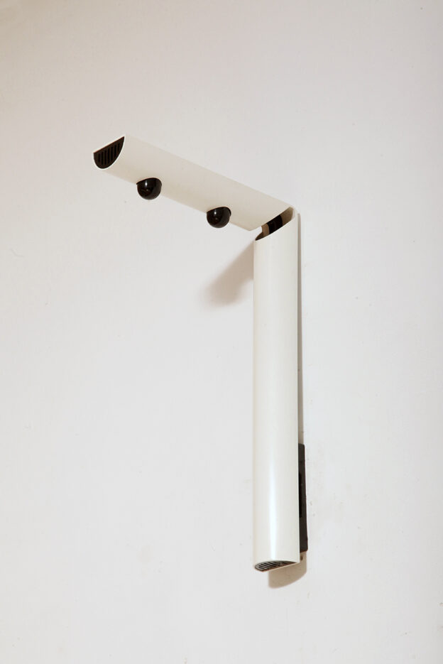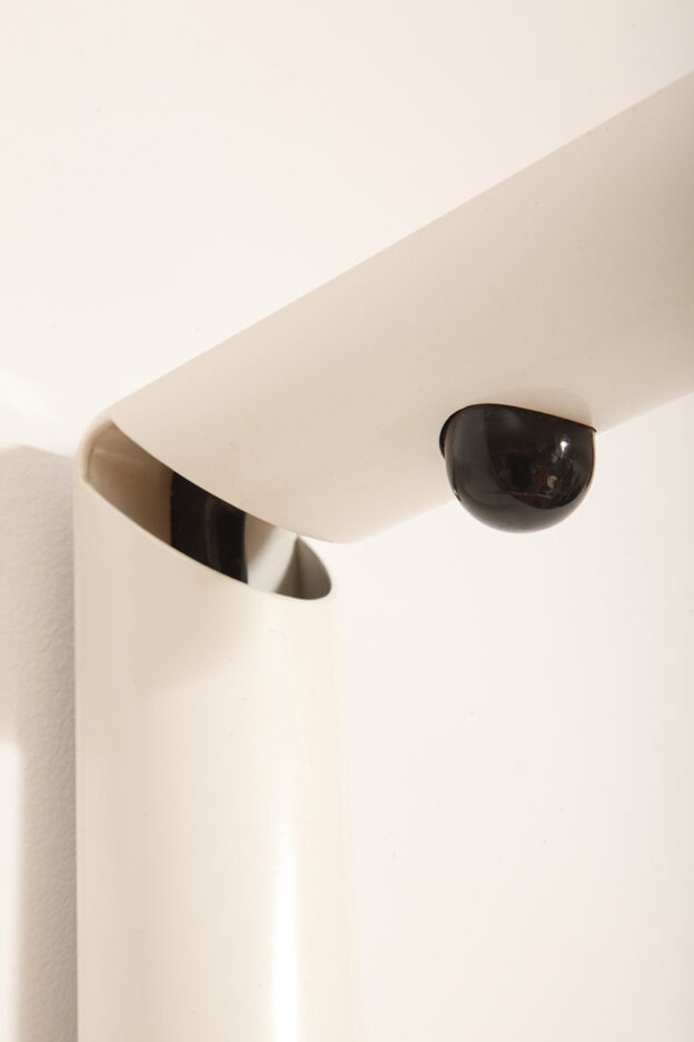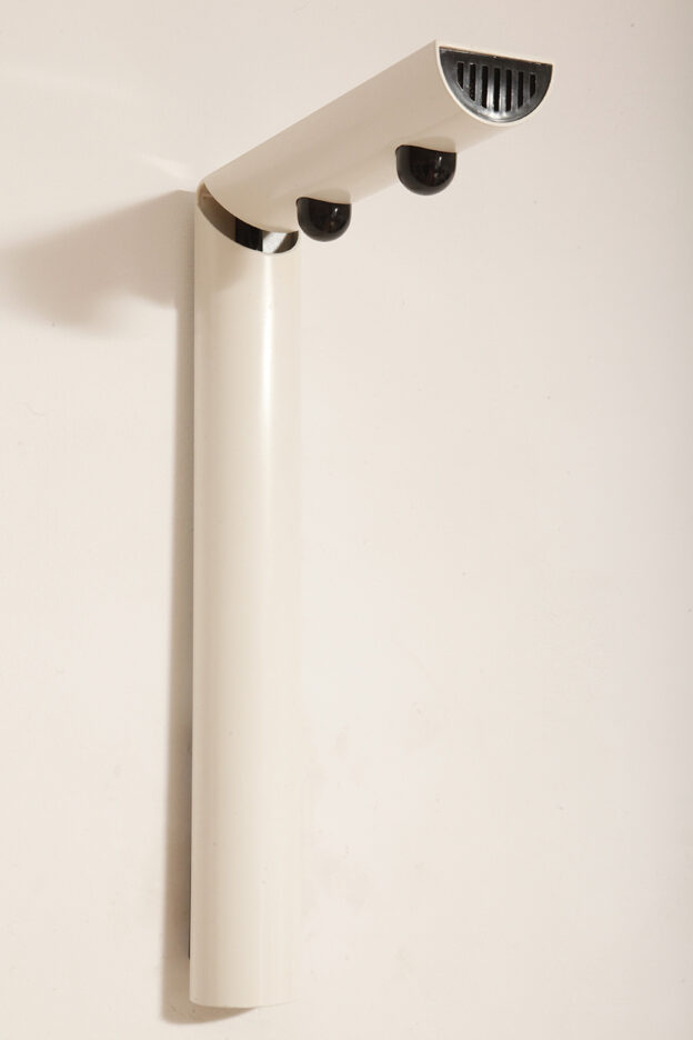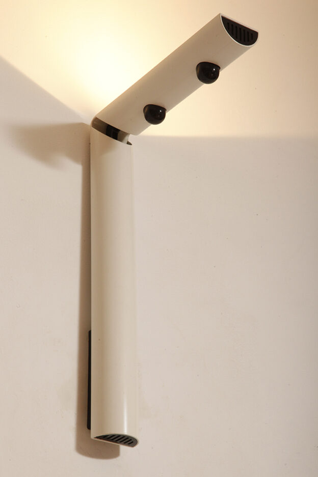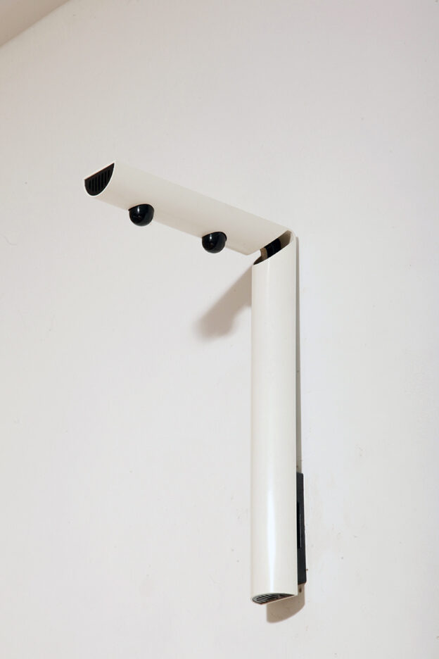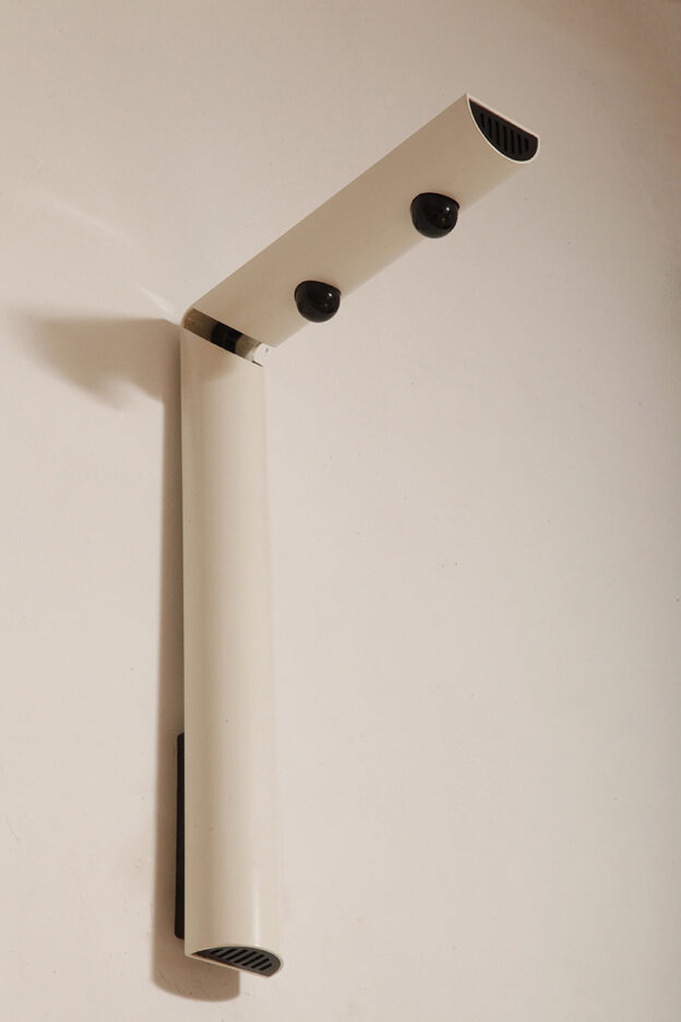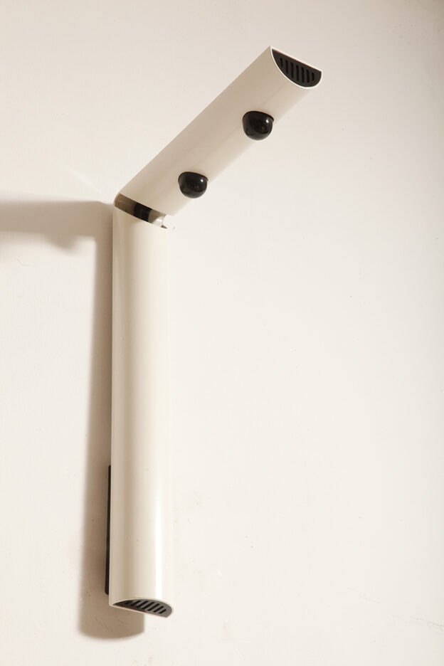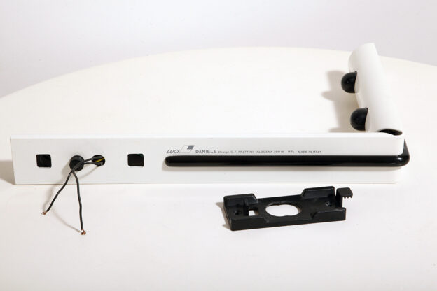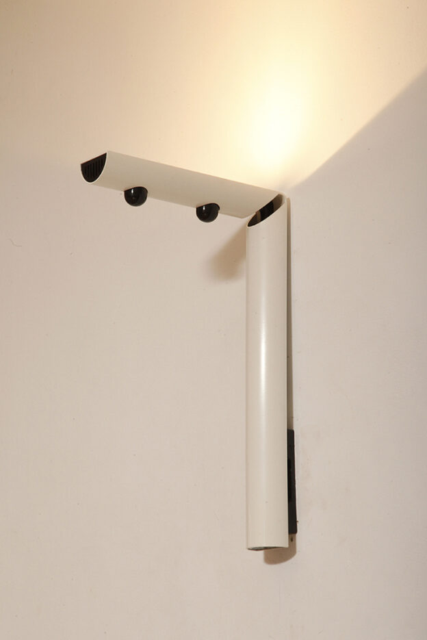 Postmodernistyczna elegancja, czyli kinkiety „Daniele” (mamy dwie sztuki tych kinkietów). Zaprojektowane przez Gianfranco Frattini dla włoskiej firmy oświetleniowej Luci są świadectwem wyrafinowanej wrażliwości projektanta i jego mistrzostwa w formie rzeźbiarskiej. Wykonane w zimnej bieli lampa z lat 80. odzwierciedla zabawną geometrię i ekspresyjny minimalizm, które definiowały postmodernistyczny design, jednocześnie zachowując ponadczasową elegancję.