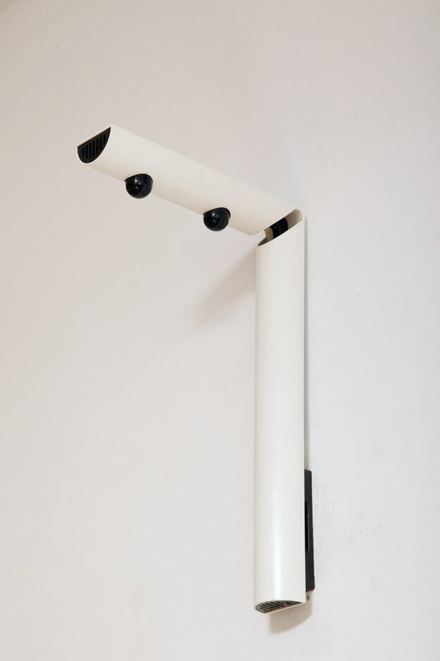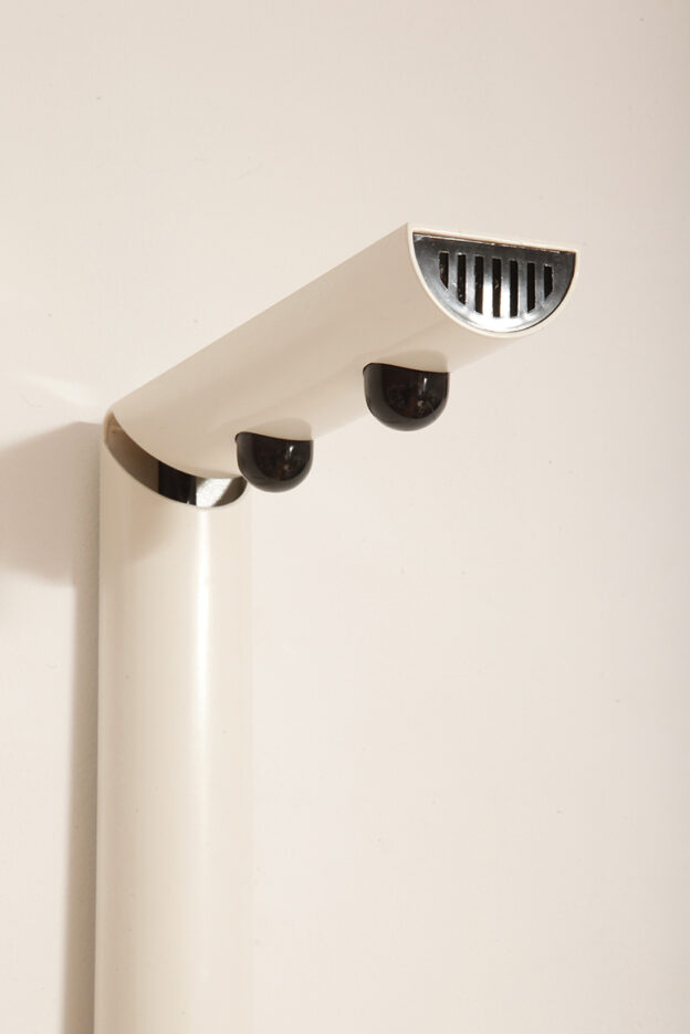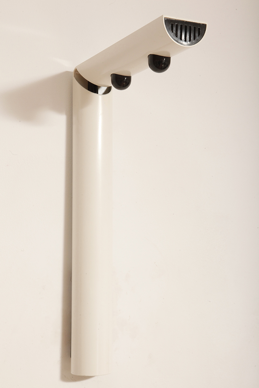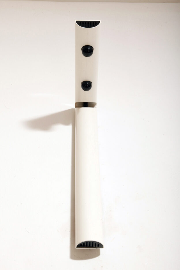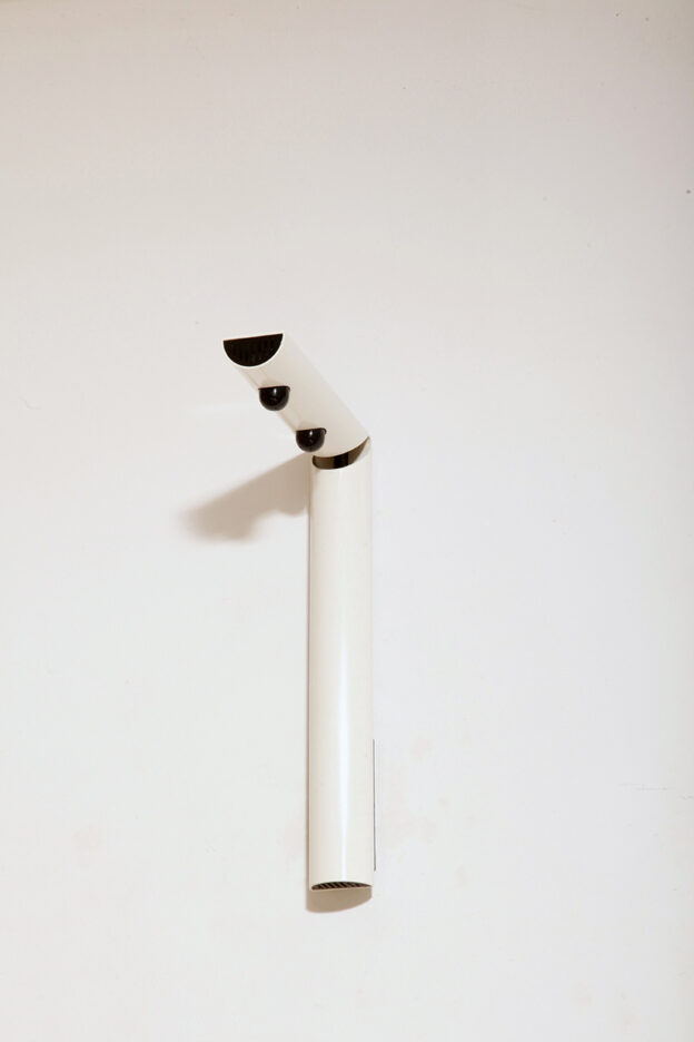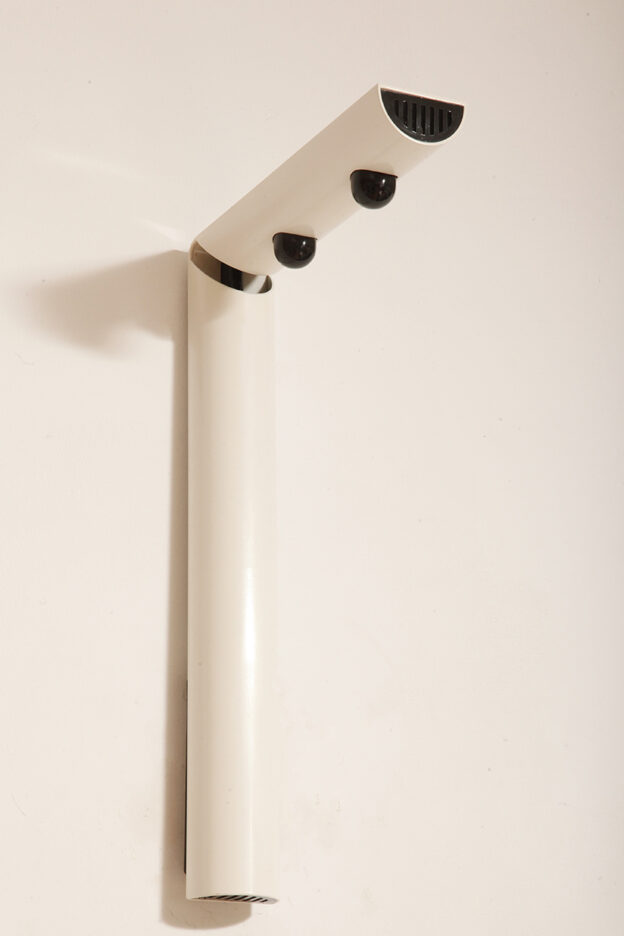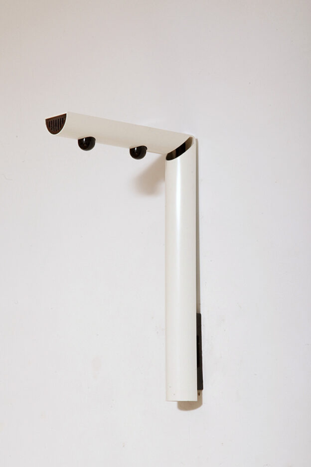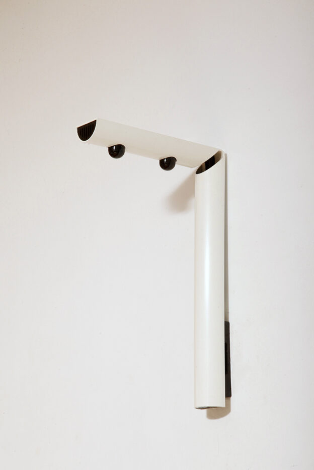Postmodernistyczna elegancja, czyli kinkiety „Daniele” (mamy dwie sztuki tych kinkietów). Zaprojektowane przez Gianfranco Frattini dla włoskiej firmy oświetleniowej Luci są świadectwem wyrafinowanej wrażliwości projektanta i jego mistrzostwa w formie rzeźbiarskiej. Wykonane w zimnej bieli lampa z lat 80. odzwierciedla zabawną geometrię i ekspresyjny minimalizm, które definiowały postmodernistyczny design, jednocześnie zachowując ponadczasową elegancję.