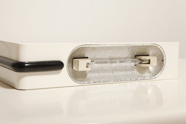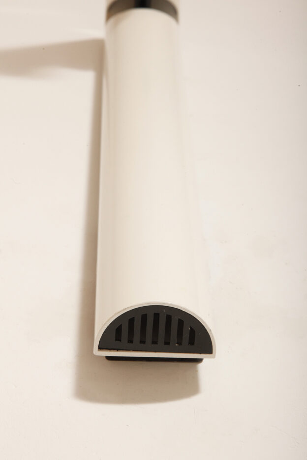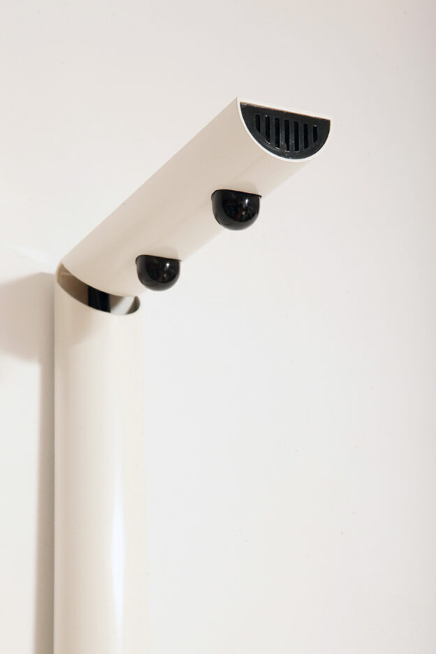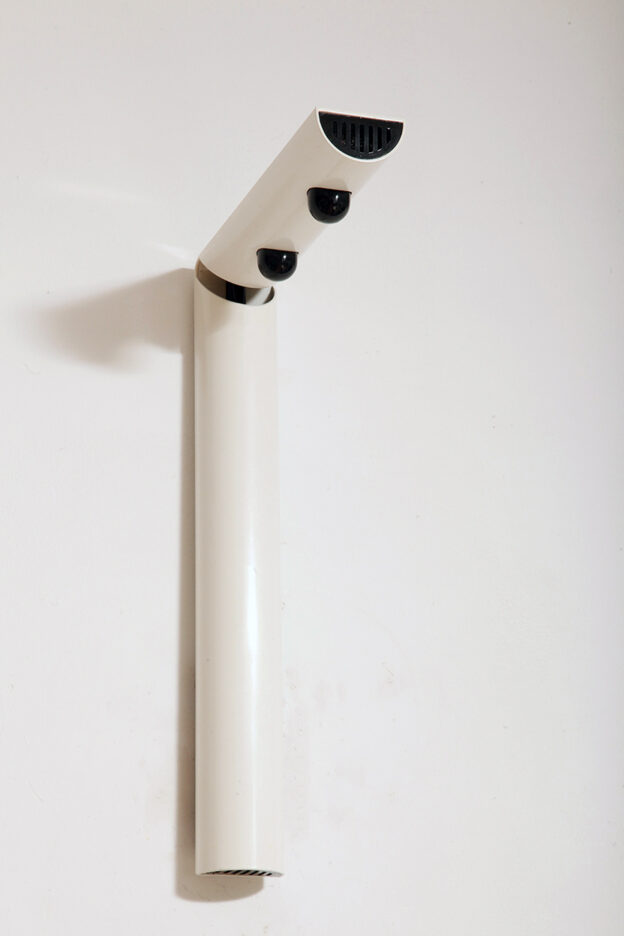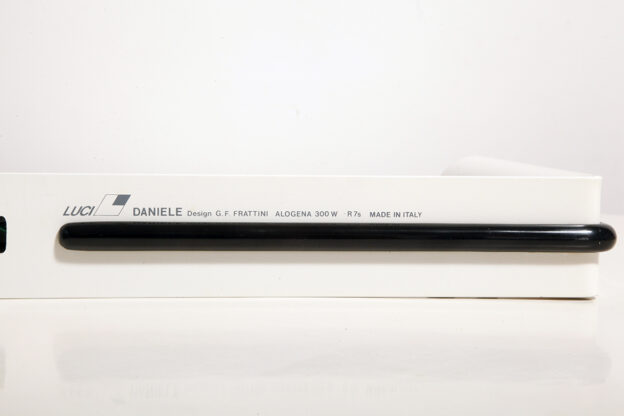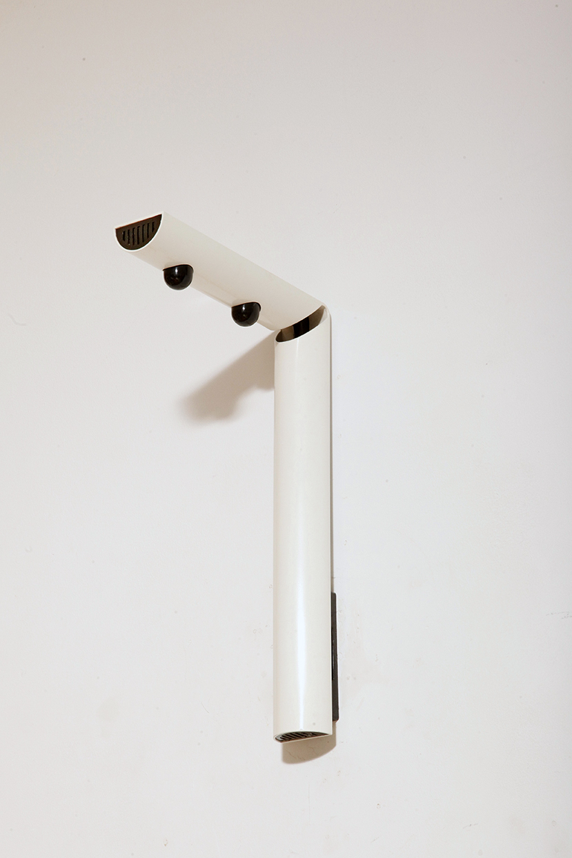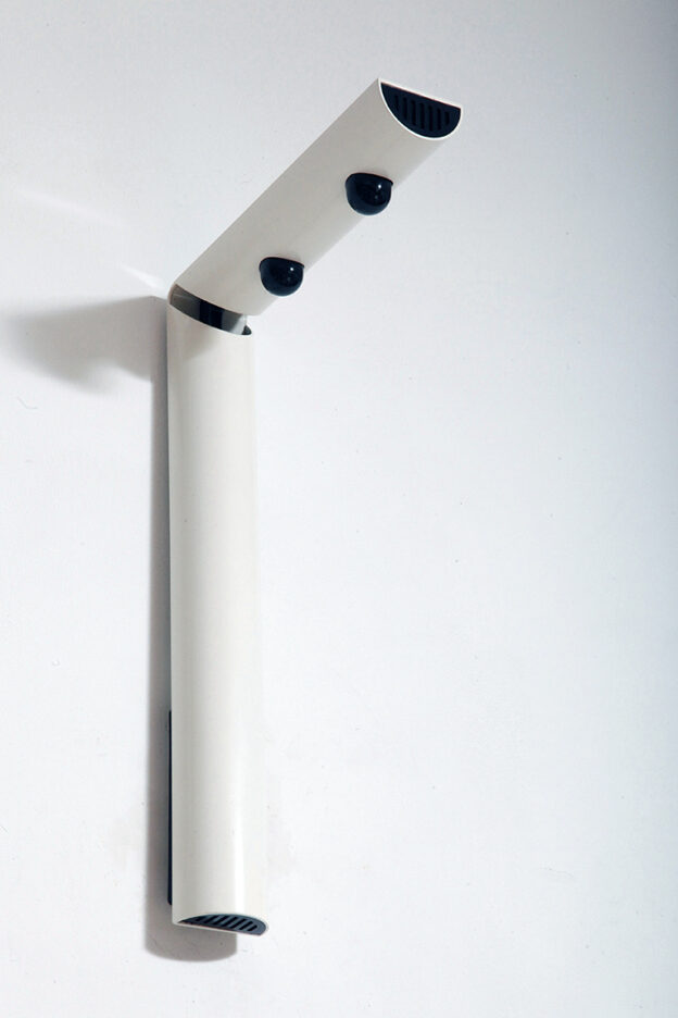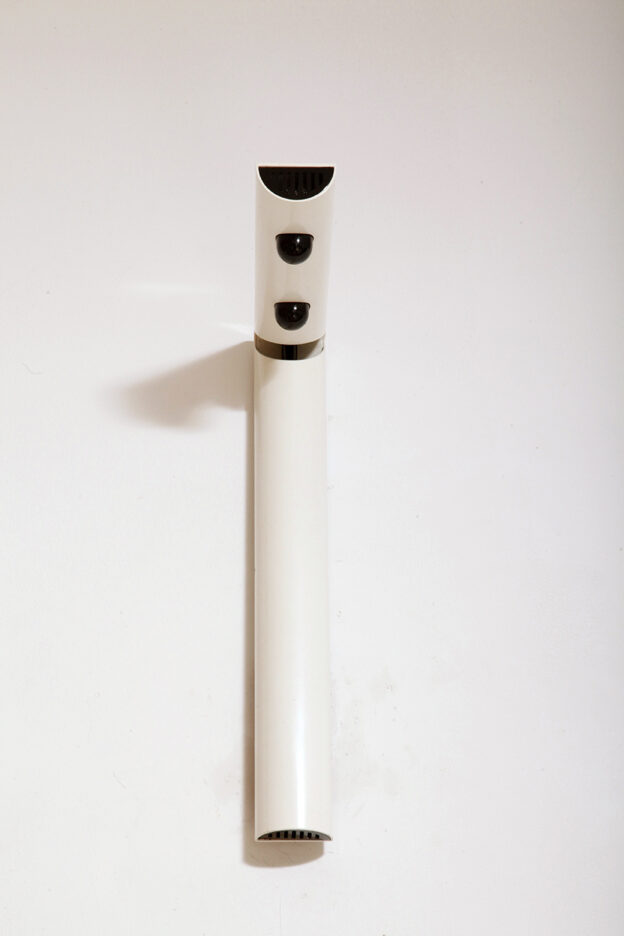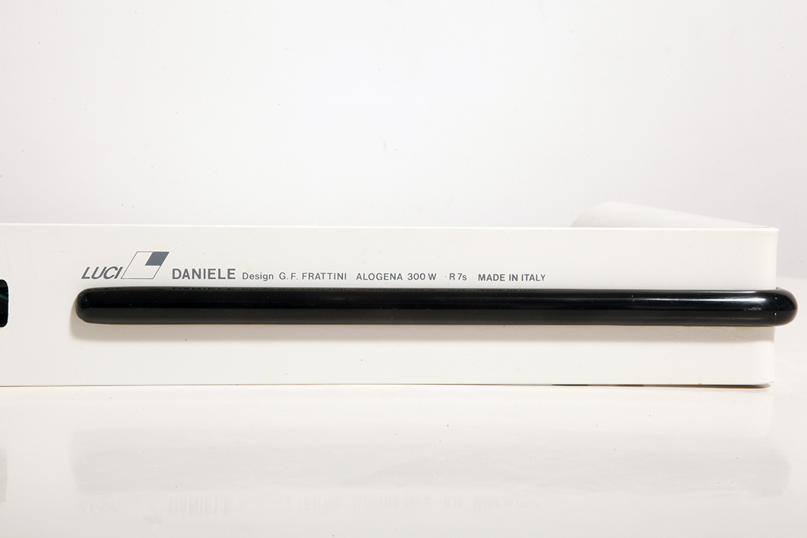 Postmodernistyczna elegancja, czyli kinkiety „Daniele” (mamy dwie sztuki tych kinkietów). Zaprojektowane przez Gianfranco Frattini dla włoskiej firmy oświetleniowej Luci są świadectwem wyrafinowanej wrażliwości projektanta i jego mistrzostwa w formie rzeźbiarskiej. Wykonane w zimnej bieli lampa z lat 80. odzwierciedla zabawną geometrię i ekspresyjny minimalizm, które definiowały postmodernistyczny design, jednocześnie zachowując ponadczasową elegancję.