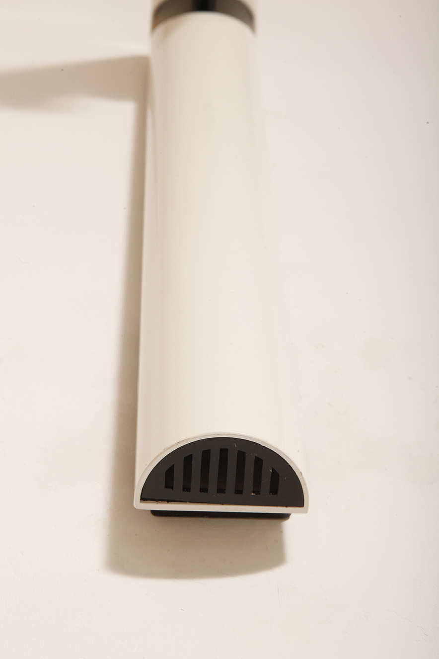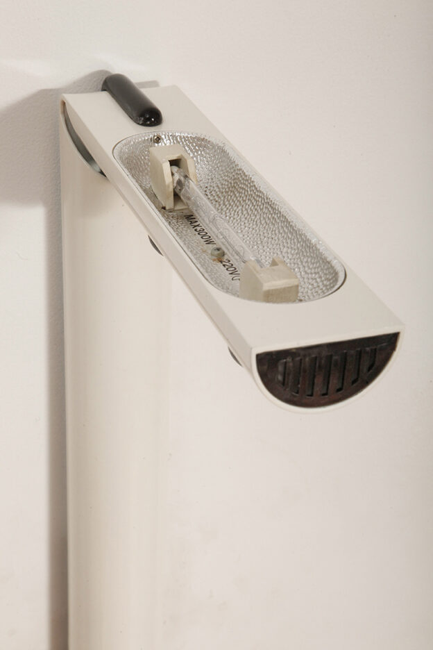 Białe główne elementy są metalowe, czarne dodatki z tworzywa sztucznego. Lampa świeci do góry światłem odbitym od sufitu. Żarówka to …. ogólnie dostępna i niedroga.