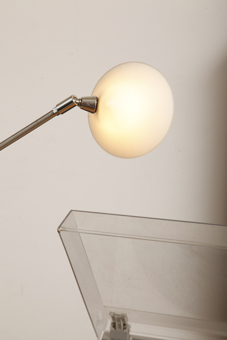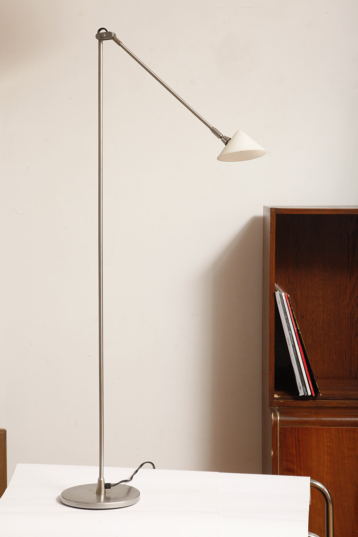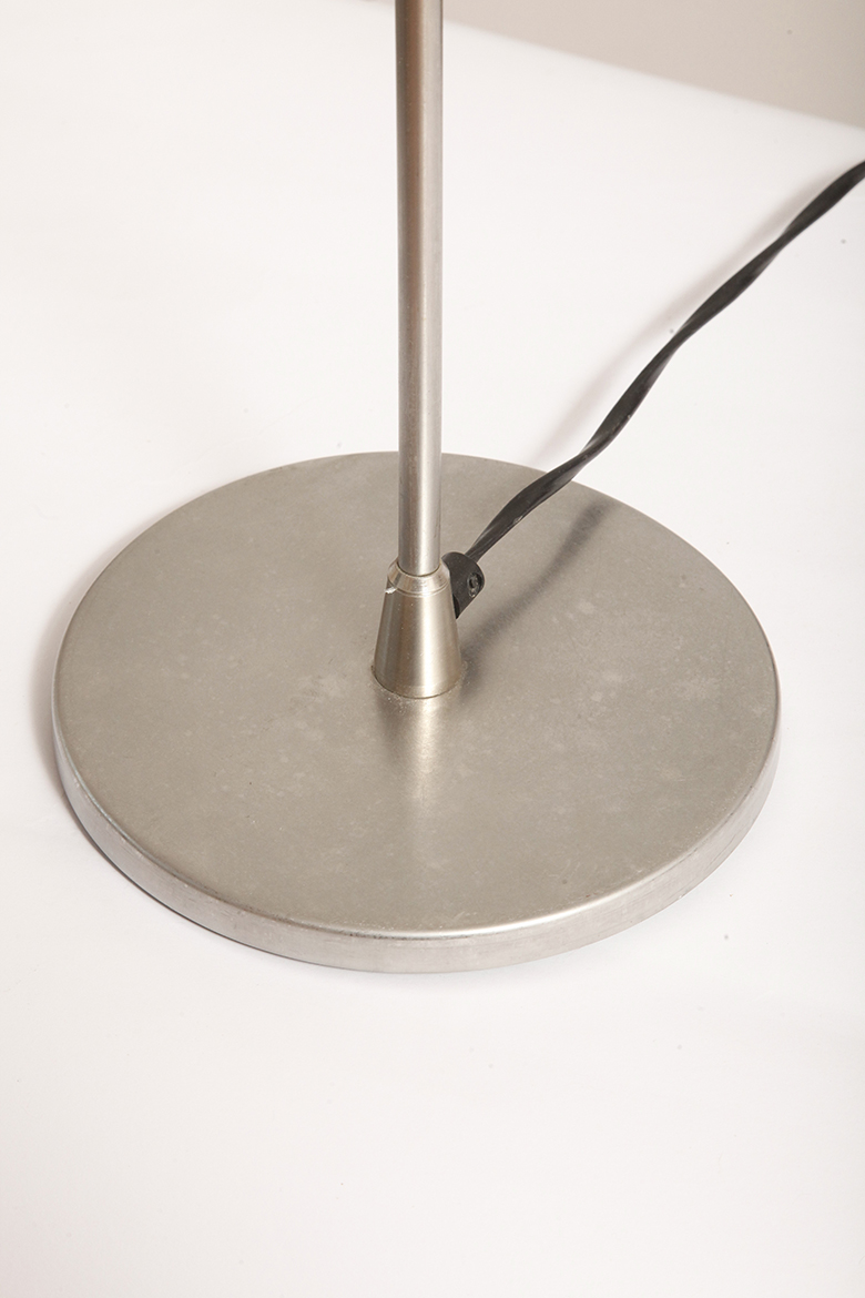 Ta podłogowa lampa ma masywną, okrągłą, metalową podstawę, z której odchodzi pionowa sztyca zakończona ruchomym ramieniem którym można obracać i pochylać w zasadzie pod dowolnym kontem.