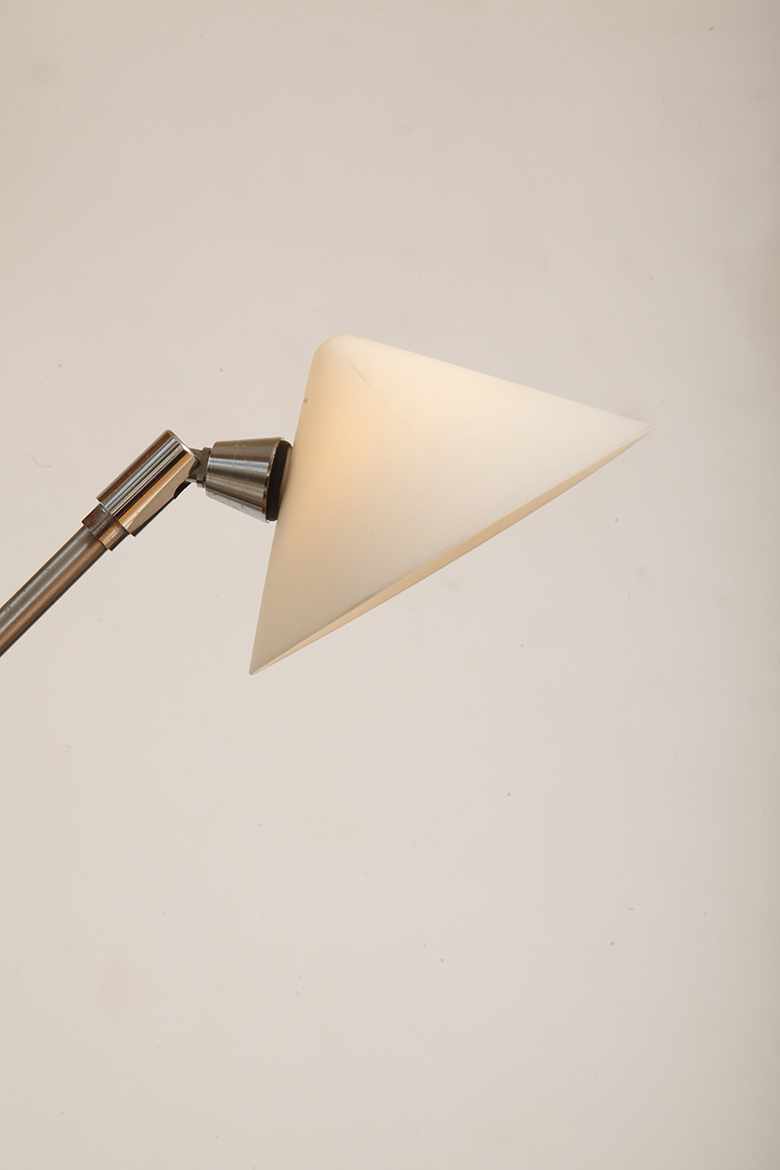 Srebrna minimalistyczna jednopunktowa metalowa lampa podłogowa z ruchomym ramieniem i szklanym mlecznobiałym kloszem w kształcie stożka, Pola Amstelveen, Holandia, lata 80.