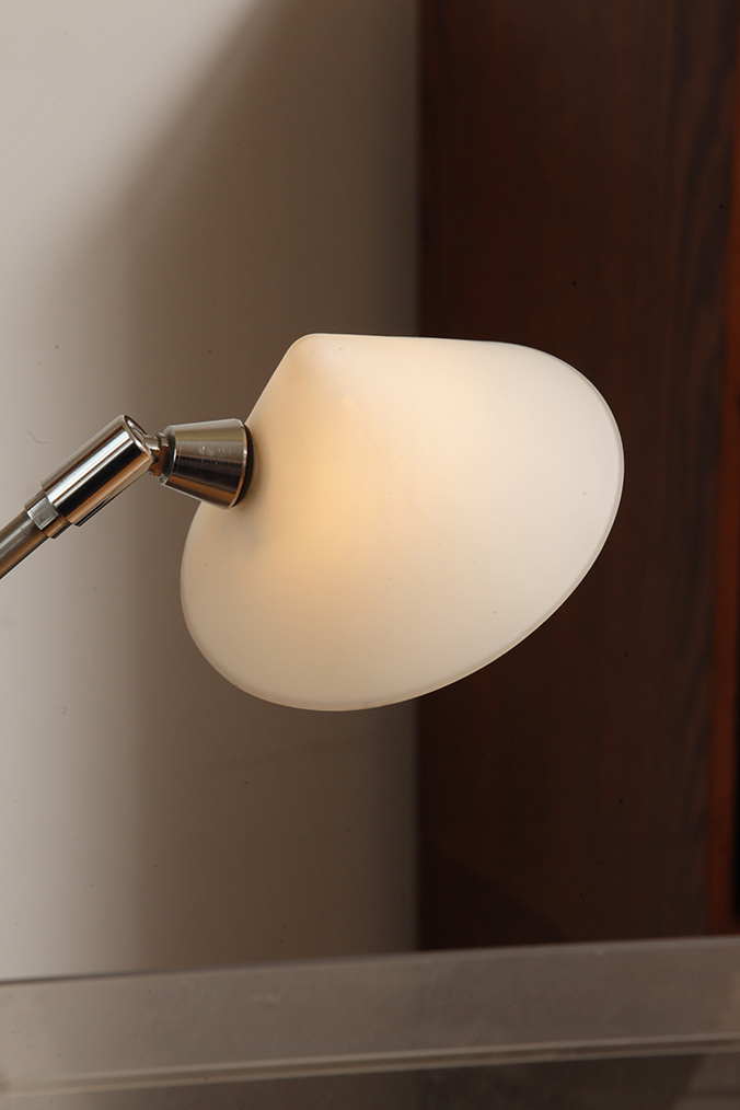To dzięki łożyskom kulkowym mamy nieskończoną ilość ustawień. Zabawa jest przednia, a pomysł poniekąd banalnie prosty. Podobnie, ale w nieco bardziej ograniczonym zakresie jest z samym szklanym filigranowym kloszem. Nim też można obracać. Co warto podkreślić, klosz jest z półprzepuszczalnego mlecznobiałego szkła i dzięki temu świeci całym sobą, a nie tylko do dołu. Jeśli światła potrzeba mniej można skierować klosz na ścianę, a rozproszonego światła z całej jego powierzchni będzie naprawdę sporo. Sprawdzałem.