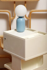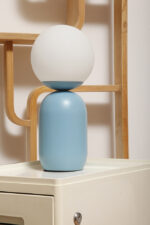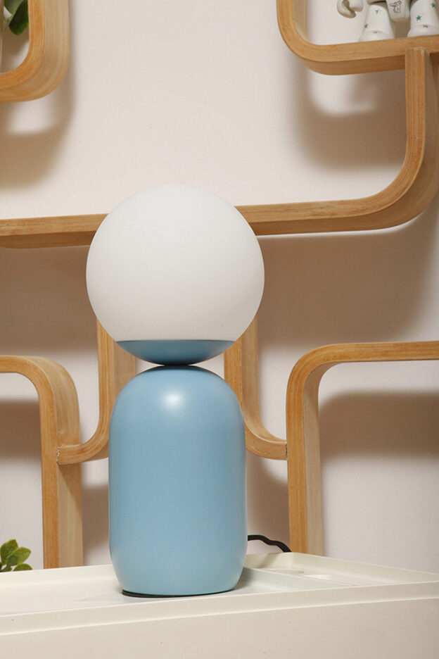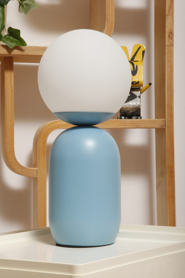 Średniej wielkości lampa nocna/biurkowa/stołowa z metalową niebieską podstawą i szklanym mlecznobiałym kloszem w kształcie kuli, model Notti – Chiffon Blue, firma Nordlux, Dania, po 2000 roku