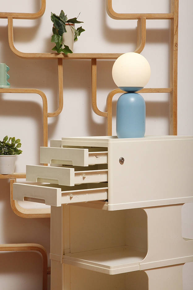 Z metalową niebieską podstawą i szklanym mlecznobiałym kloszem w kształcie kuli jak widać na zdjęciach.
