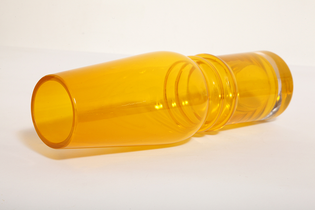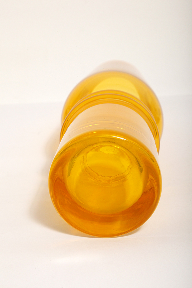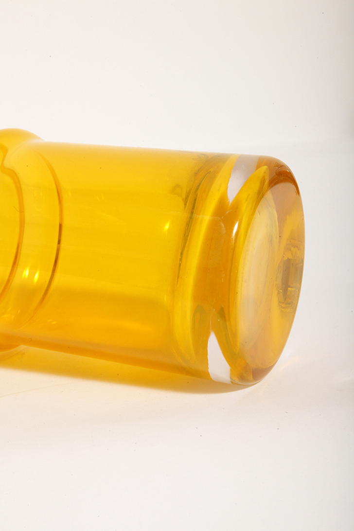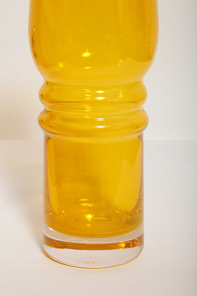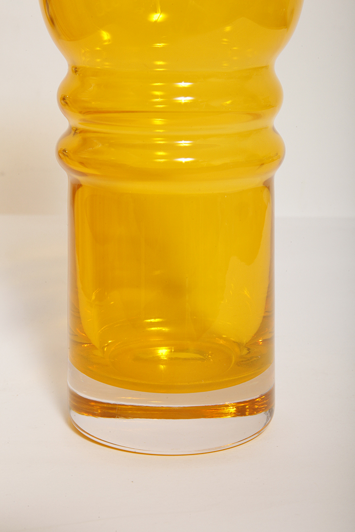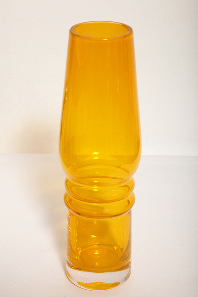Średniej wielkości (27 cm) żółty symetryczny ręcznie formowany wazon ze szkła sodowego barwionego w masie, projekt (przypisywany) Lucyna Pijaczewska, Huta Szkła Artystycznego ”Barbara” w Polanicy Zdrój, Polska, lata 70.