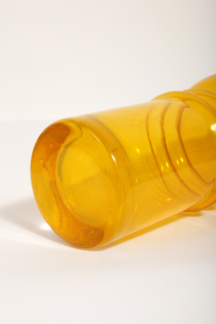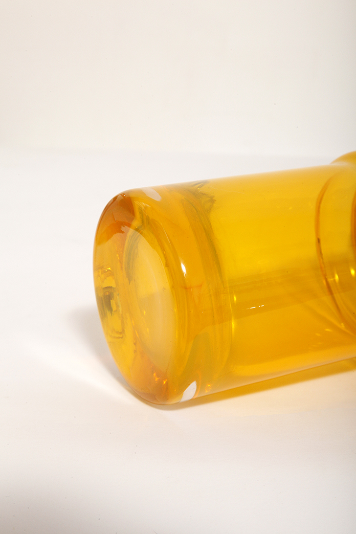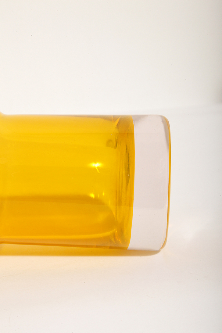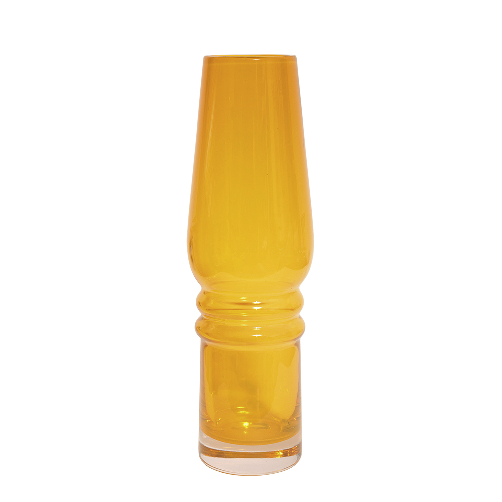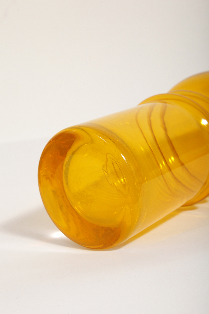 Średniej wielkości (27 cm) żółty symetryczny ręcznie formowany wazon ze szkła sodowego barwionego w masie, projekt (przypisywany) Lucyna Pijaczewska, Huta Szkła Artystycznego ”Barbara” w Polanicy Zdrój, Polska, lata 70.