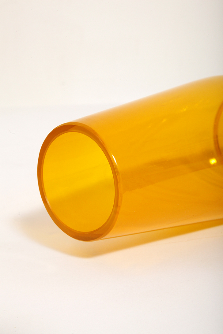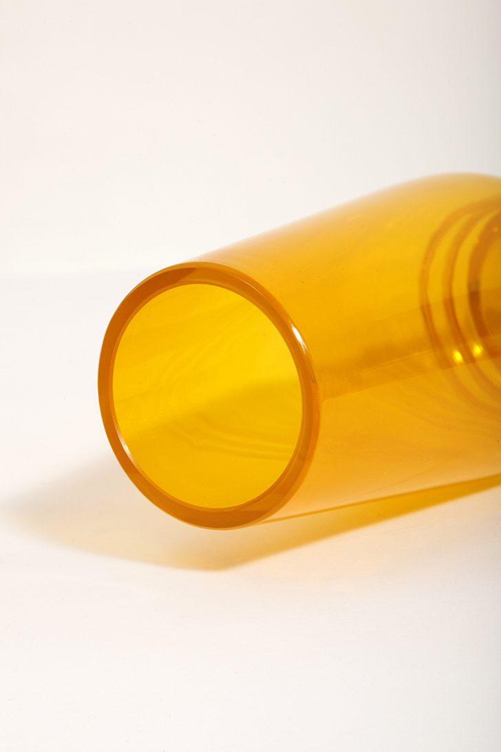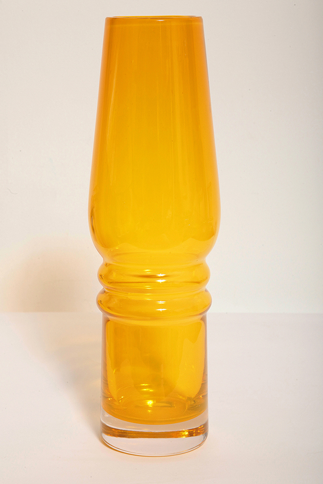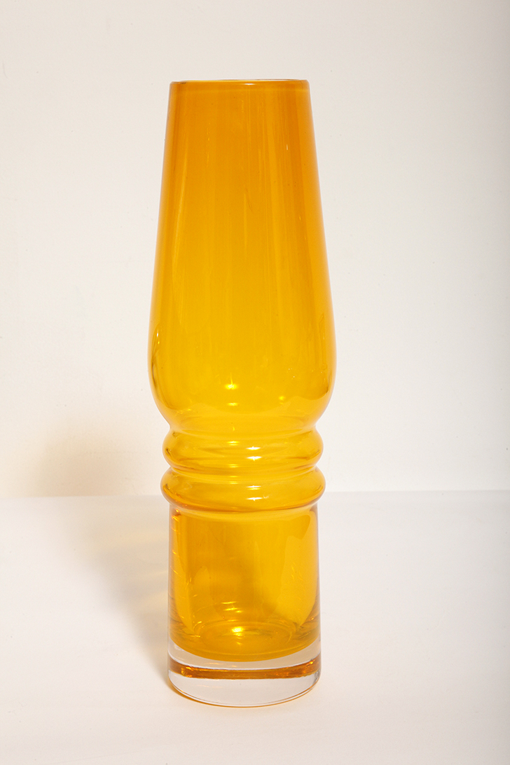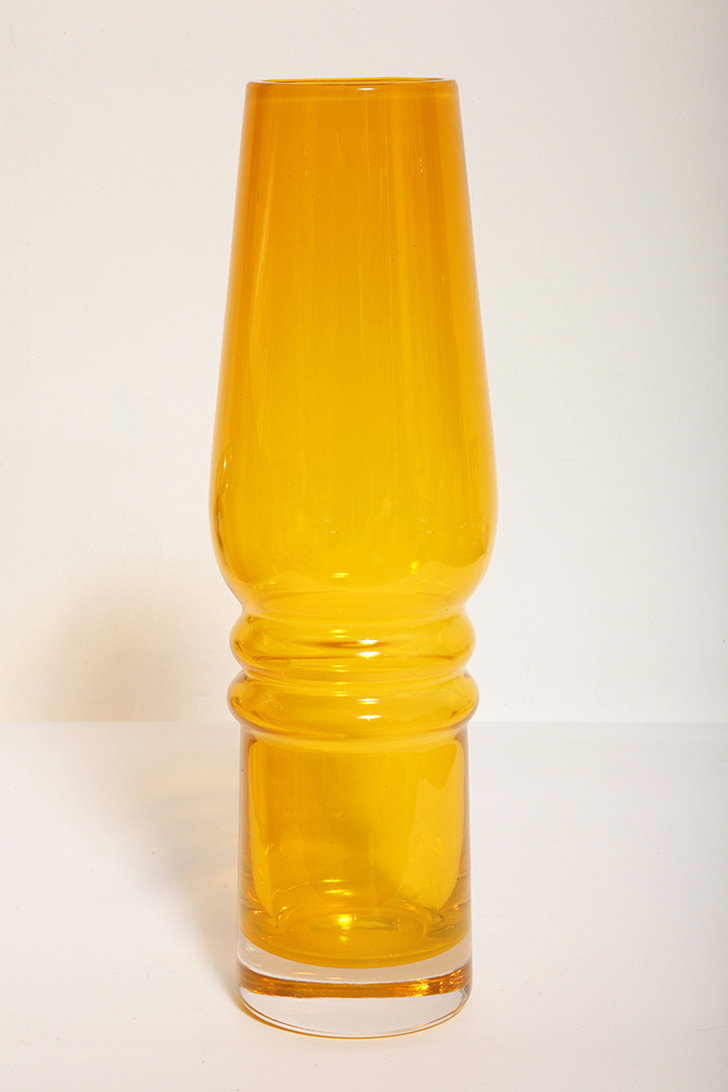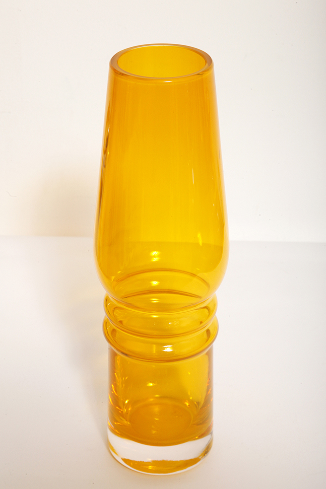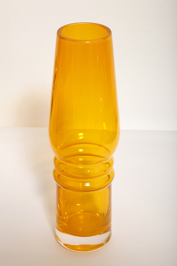 Szkło sodowe, barwione w masie, ręcznie formowane i proszę jaki mamy ładny wazon, taki zgrabny bym powiedział. Na mieście mówią, że to projekt Lucyny Pijaczewskiej.
