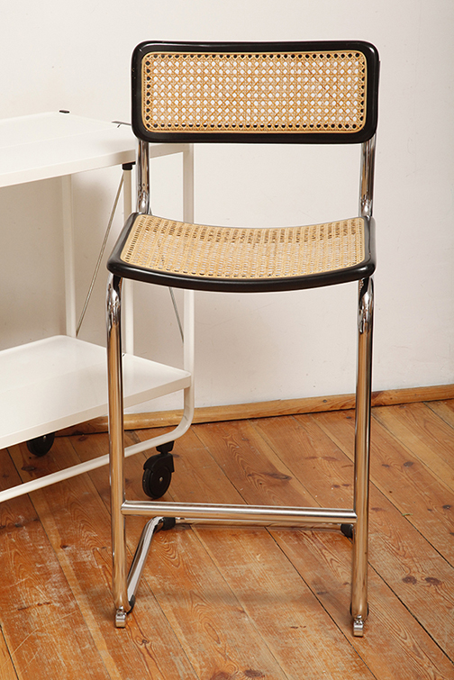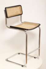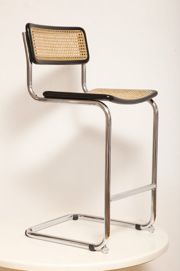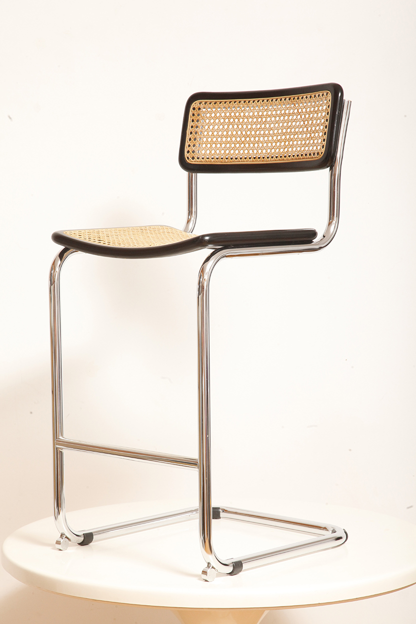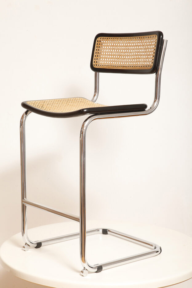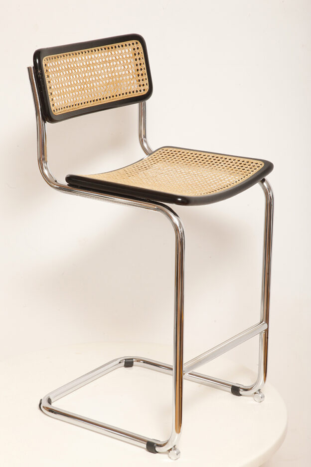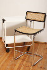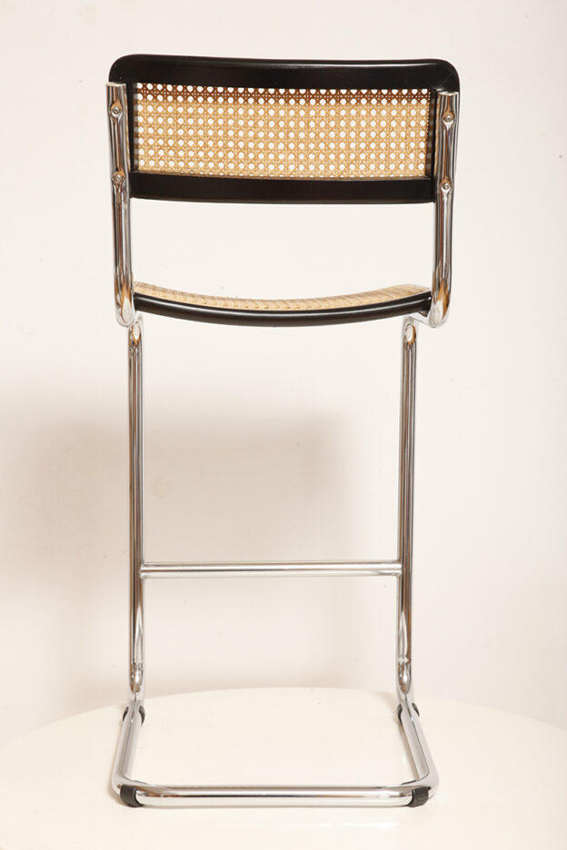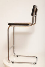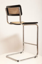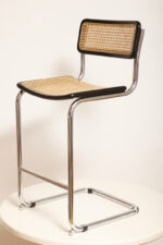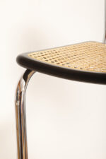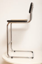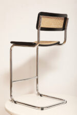 Stołek barowy/hoker wspornikowy na metalowej rurowej chromowanej konstrukcji z siatkowym siedziskiem i oparciem z rattanu, wg. projektu Marcela Breuera (S32) dla firmy Thonet, Włochy, lata 80.