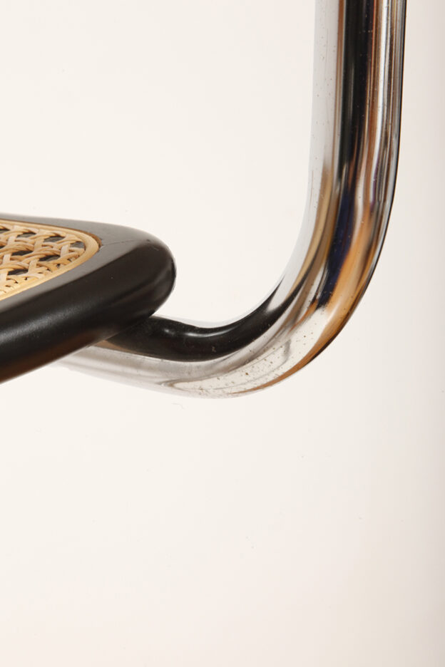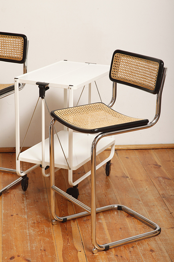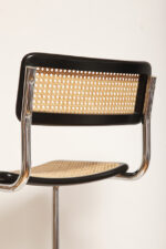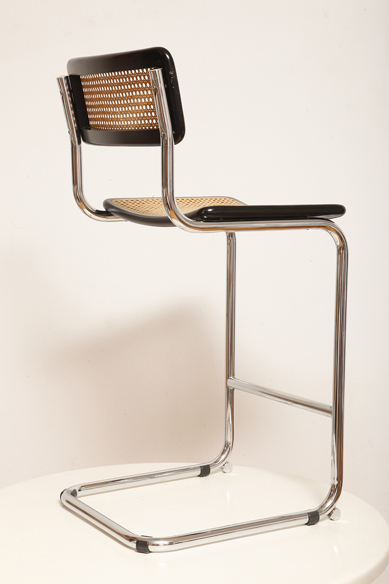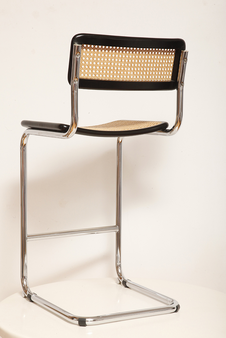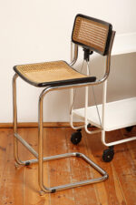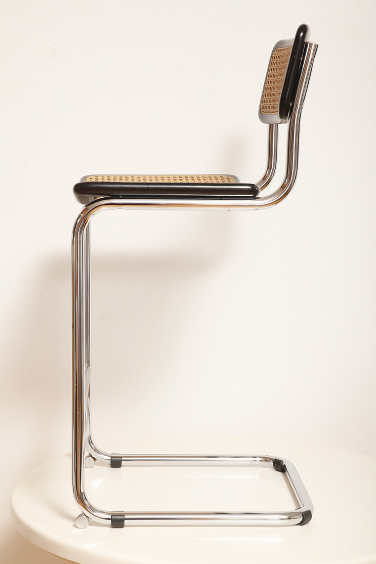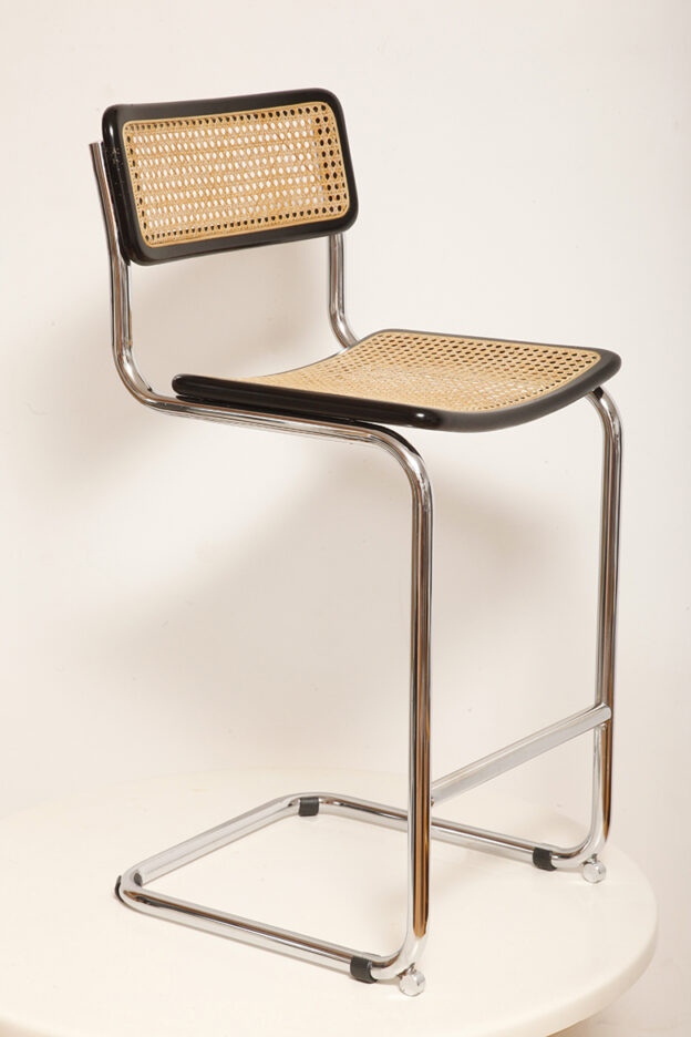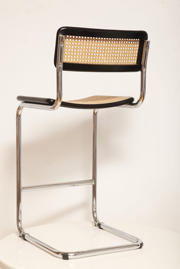Stołek barowy/hoker wspornikowy na metalowej rurowej chromowanej konstrukcji z siatkowym siedziskiem i oparciem z rattanu, wg. projektu Marcela Breuera (S32) dla firmy Thonet, Włochy, lata 80.