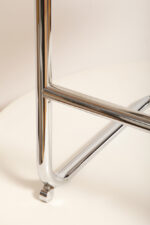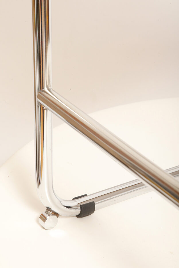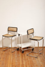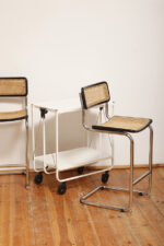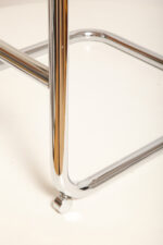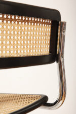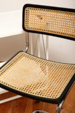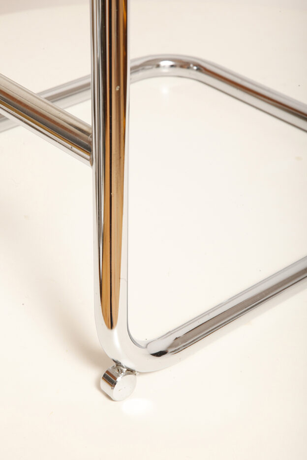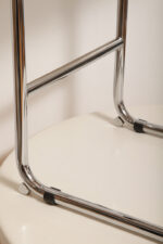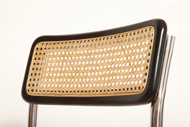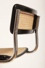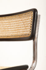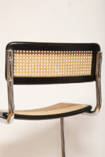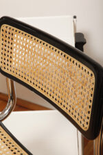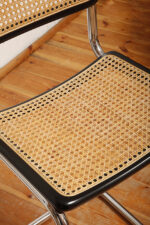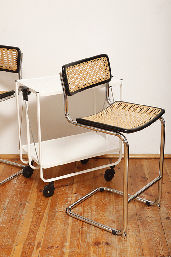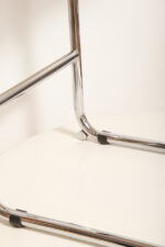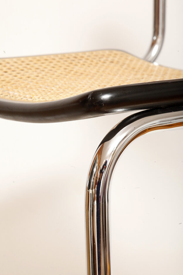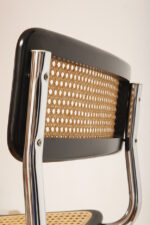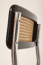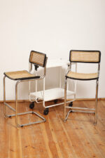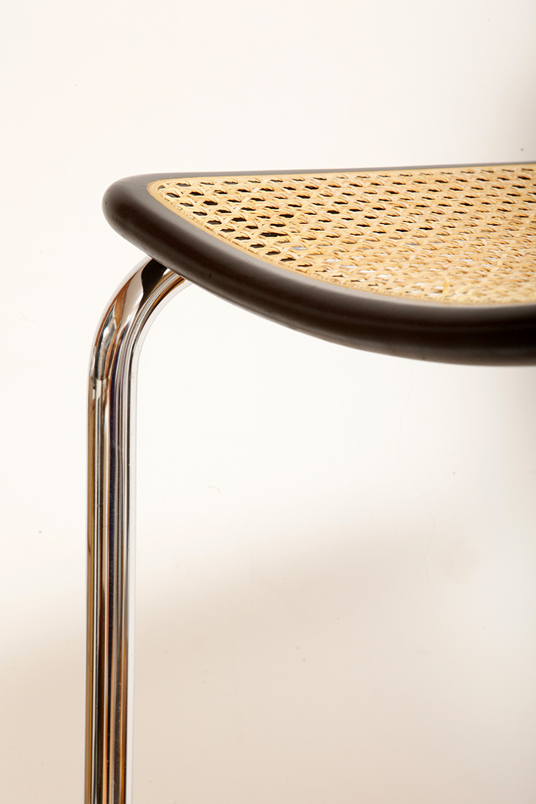 Stołek barowy/hoker wspornikowy na metalowej rurowej chromowanej konstrukcji z siatkowym siedziskiem i oparciem z rattanu, wg. projektu Marcela Breuera (S32) dla firmy Thonet, Włochy, lata 80.