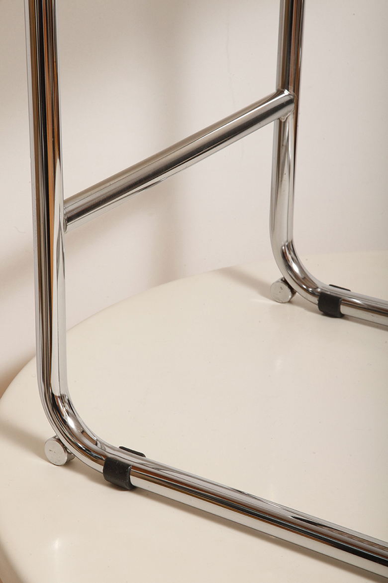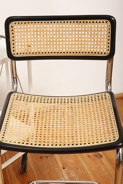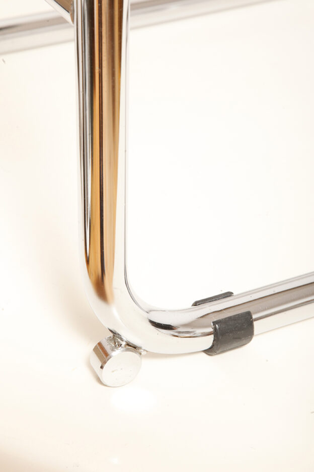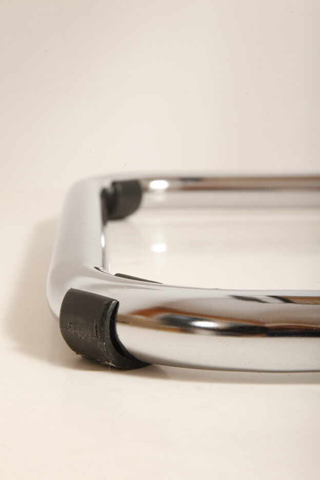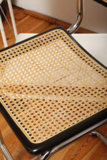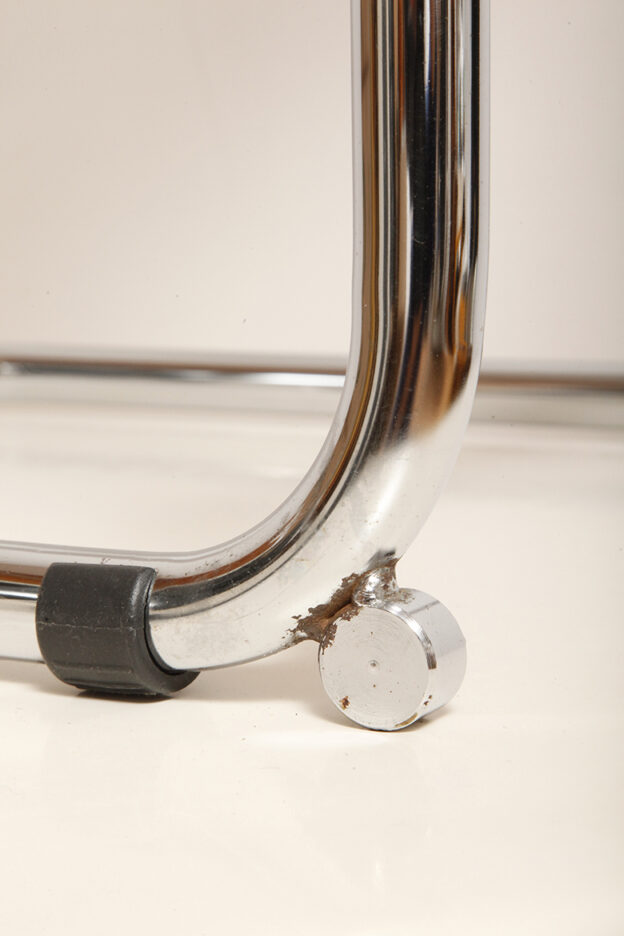 Pokrycie rattanowe bez ubytków i dziur, nie jest nigdzie zerwane, a chromowana powierzchnia na rurach jest właściwie bez zarzutu z wyjątkiem kilku punktowych mimi oznak czasu, bardziej ziarnistych i niewidocznych w zasadzie w codziennym użytkowaniu. Z jednym wyjątkiem pod jednym z fabrycznych okrągłych blokad na dole jednego hoker jest większy ubytek chromowanej powierzchni.