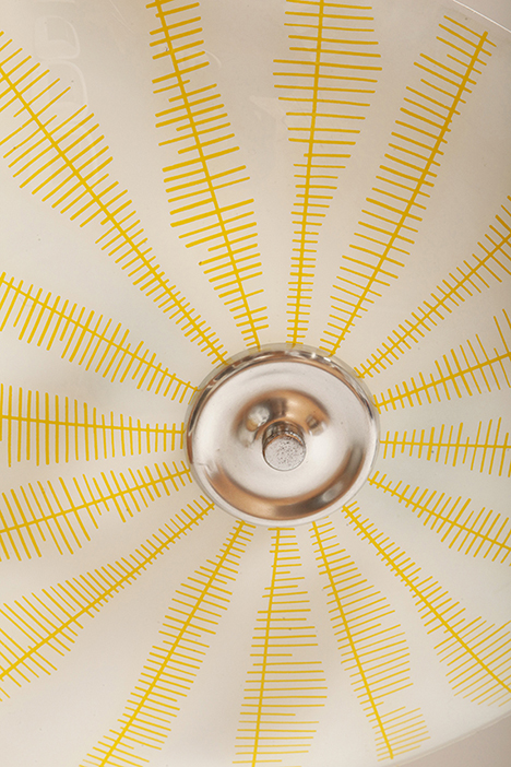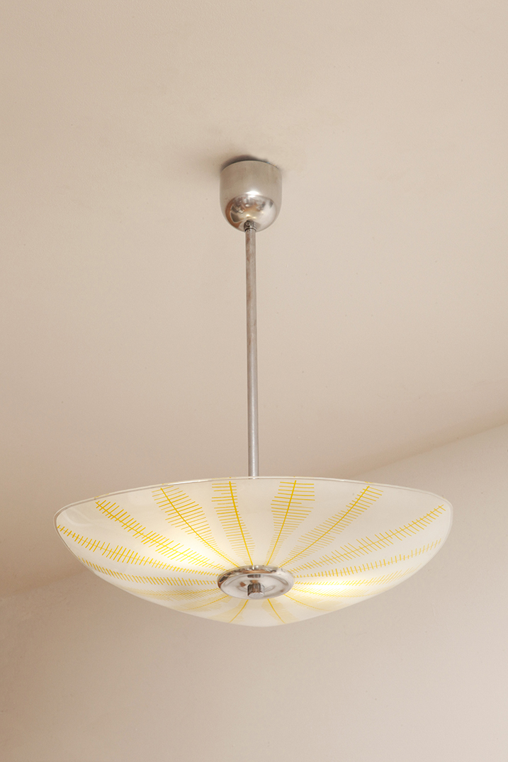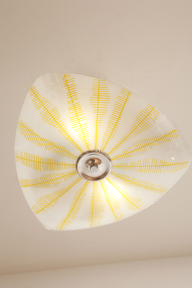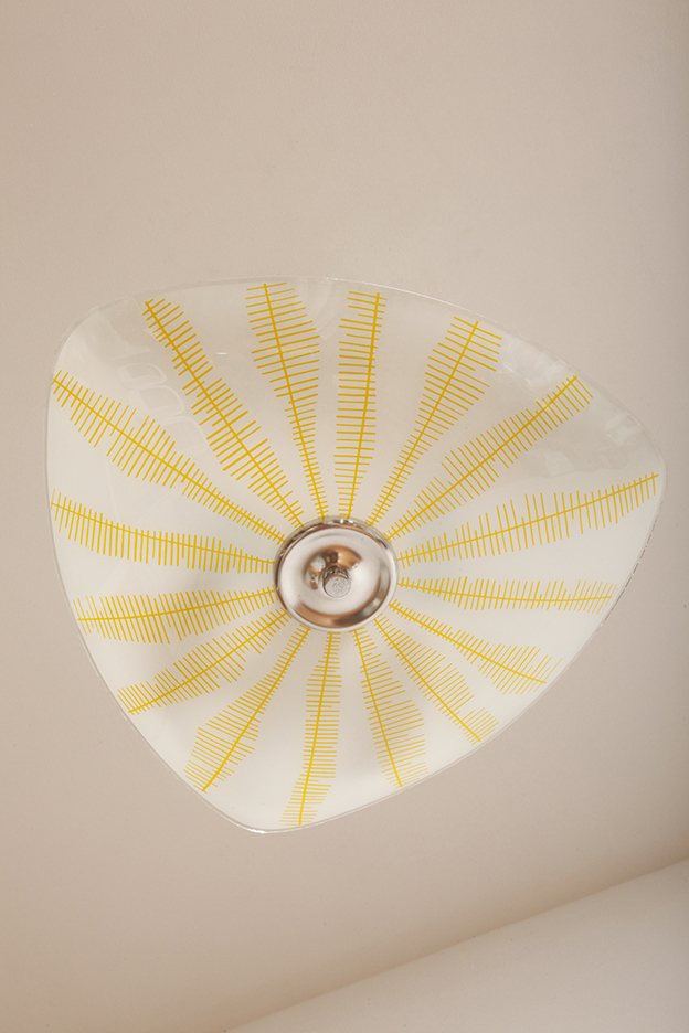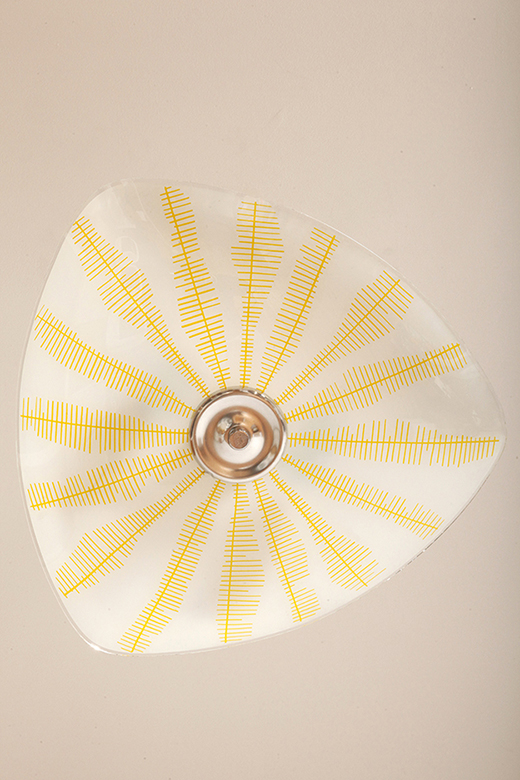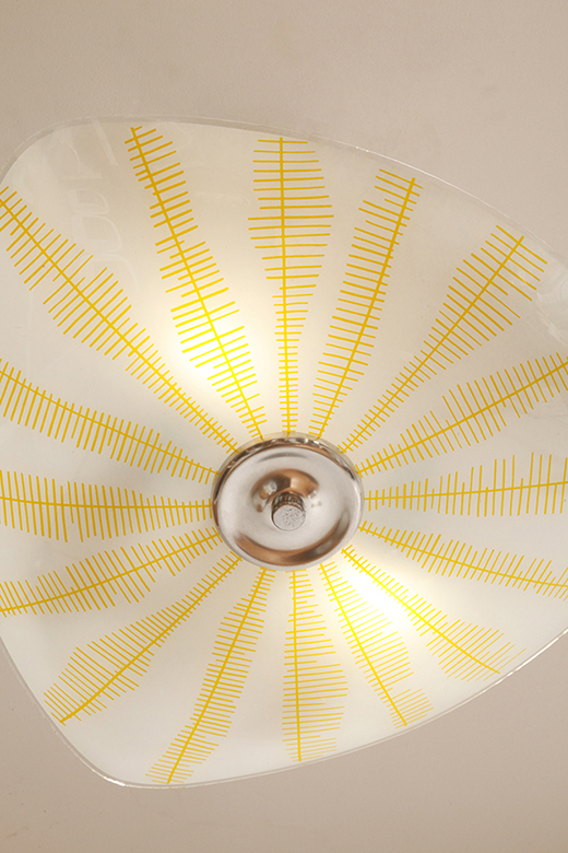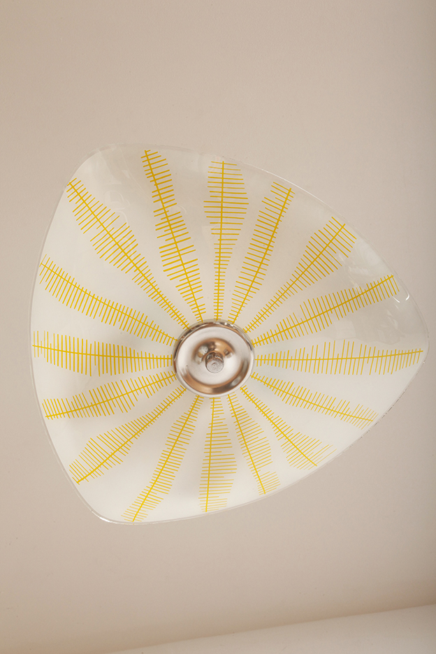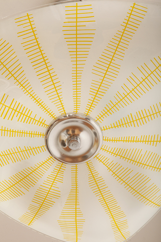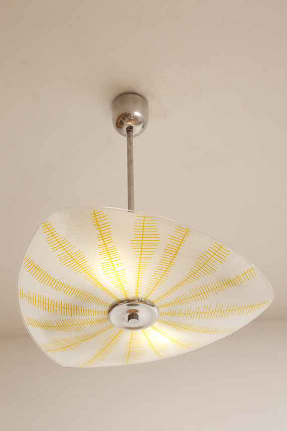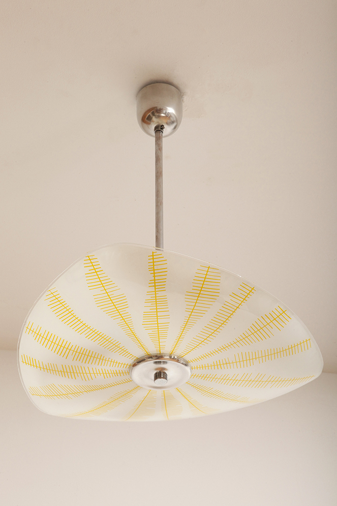 Klosz ozdobiony geometrycznym wzorem w dwóch kolorach. Lampa jest w bardzo dobrym stanie. Kształt klosza wykorzystywany bodaj tylko w latach 50-60 stąd bardzo charakterystyczny dla wzornictwa z tych lat.